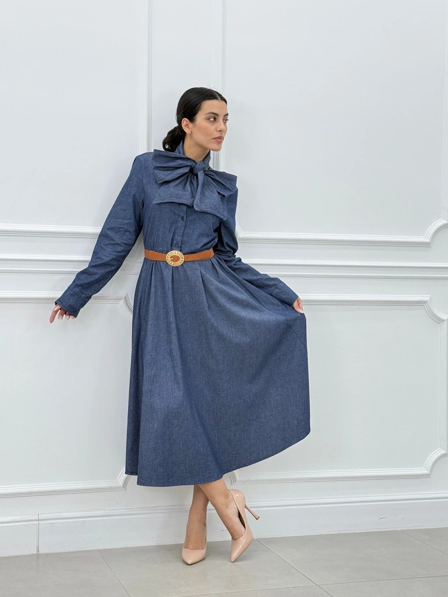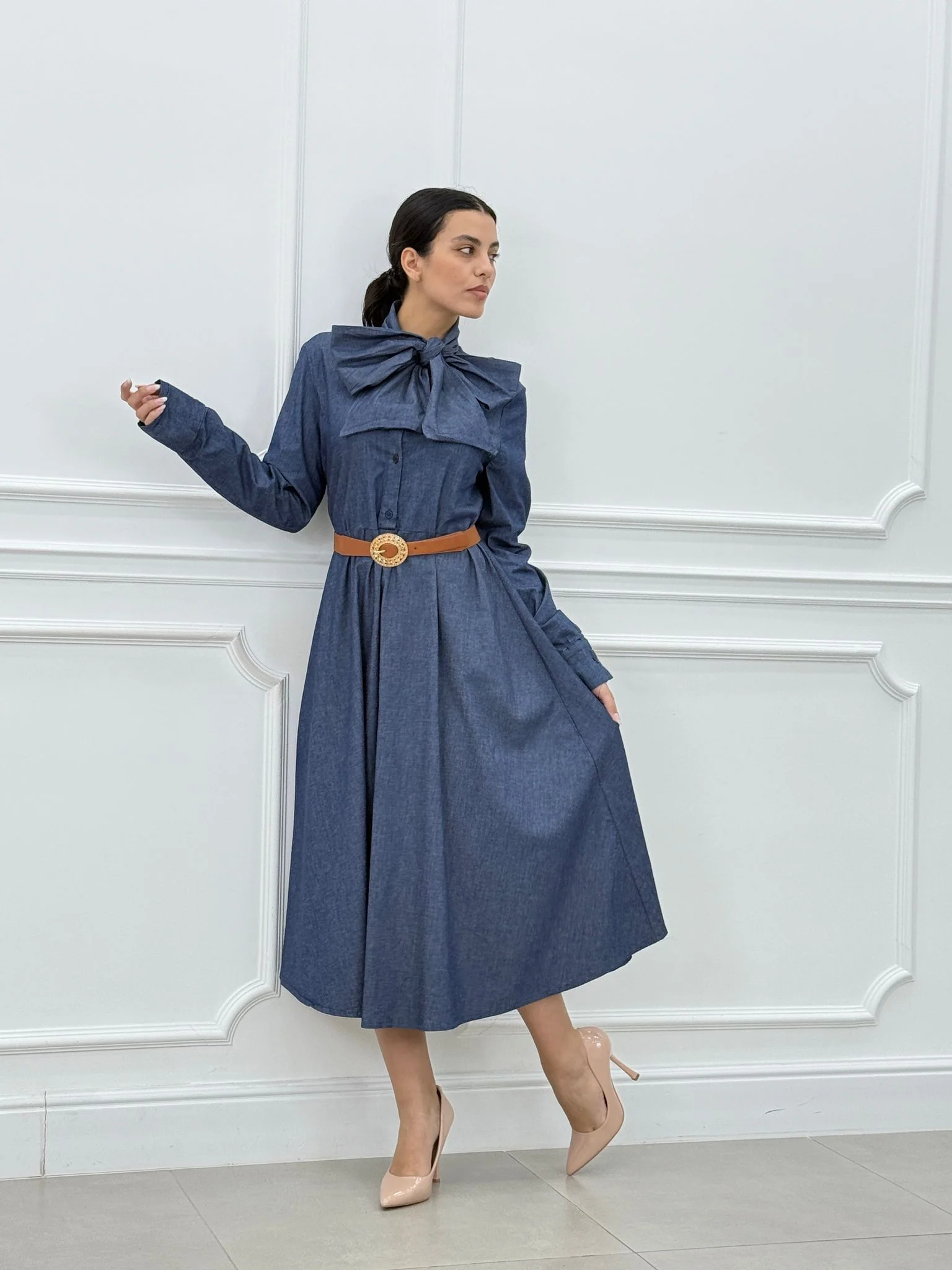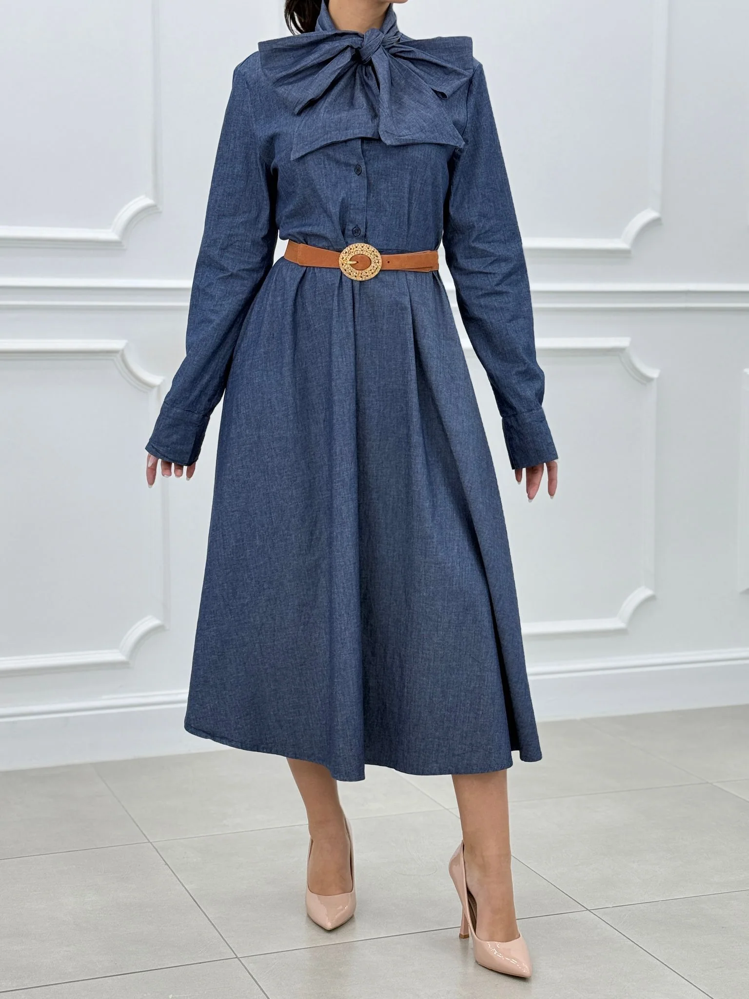 Abito denim con fiocco e bottoni