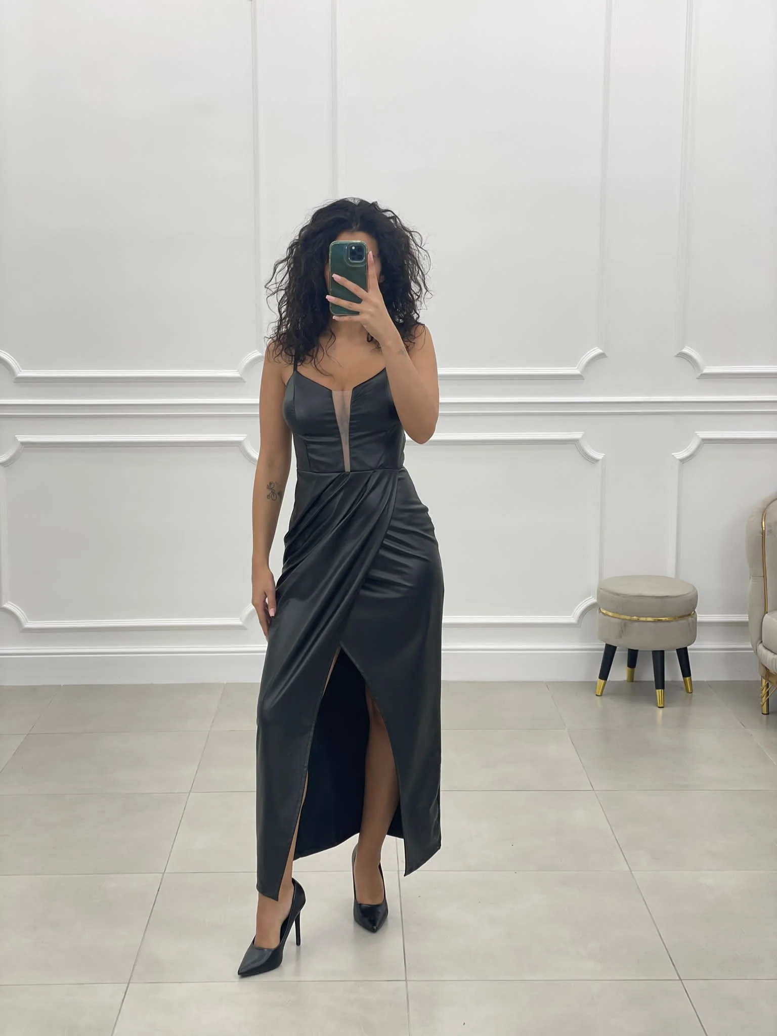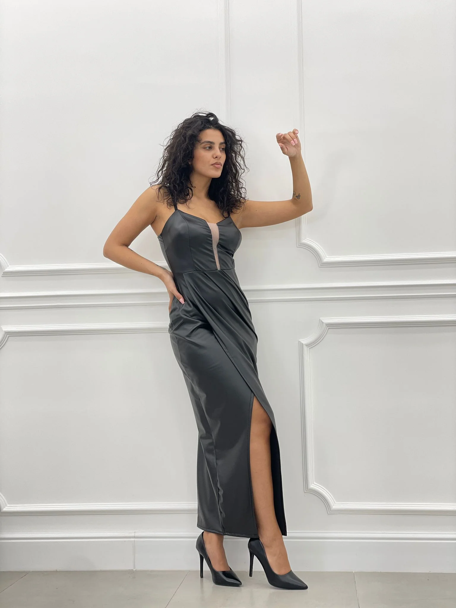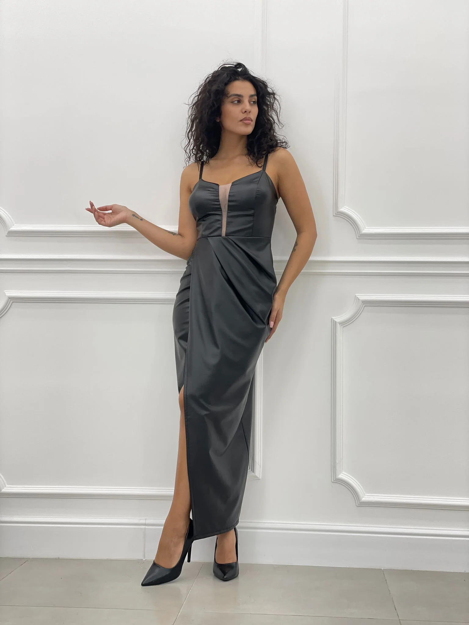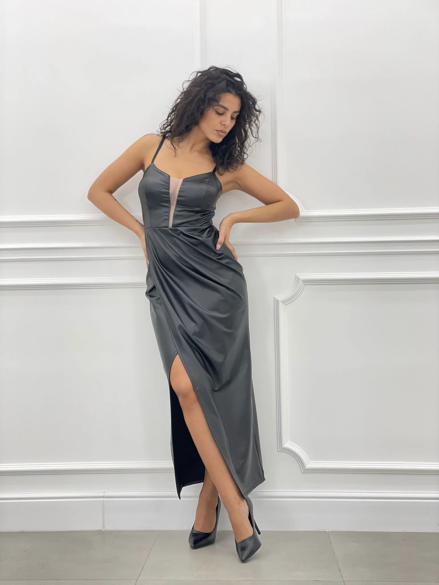 Abito lungo in ecopelle con trasparenza , chiusura zip posteriore ,bretelline regolabili e coppe al seno