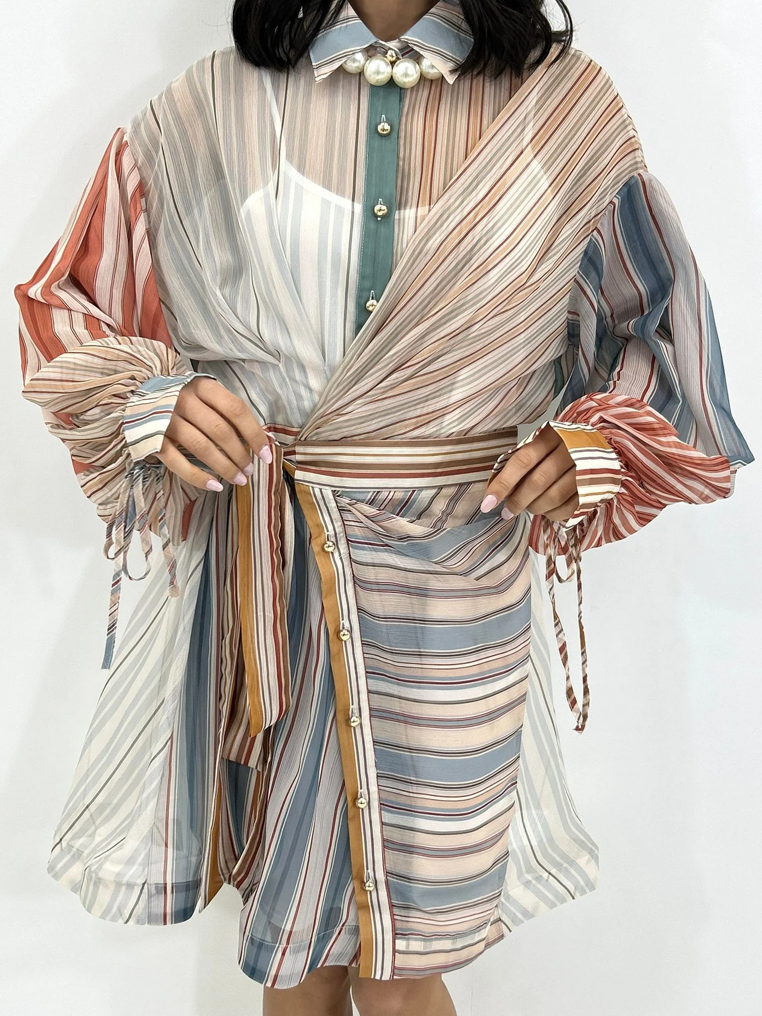 Abito velato fantasia con bottoni e fiocco in vita