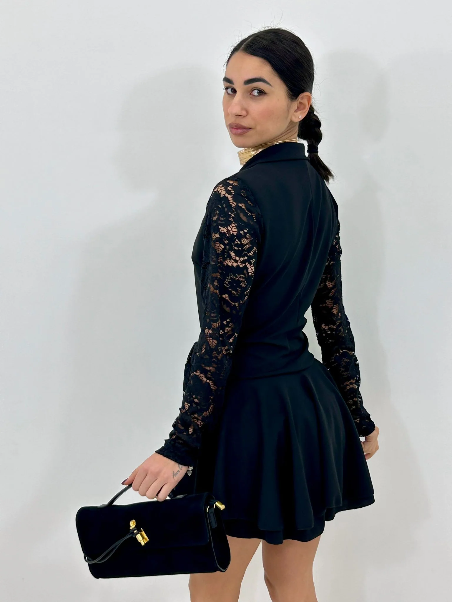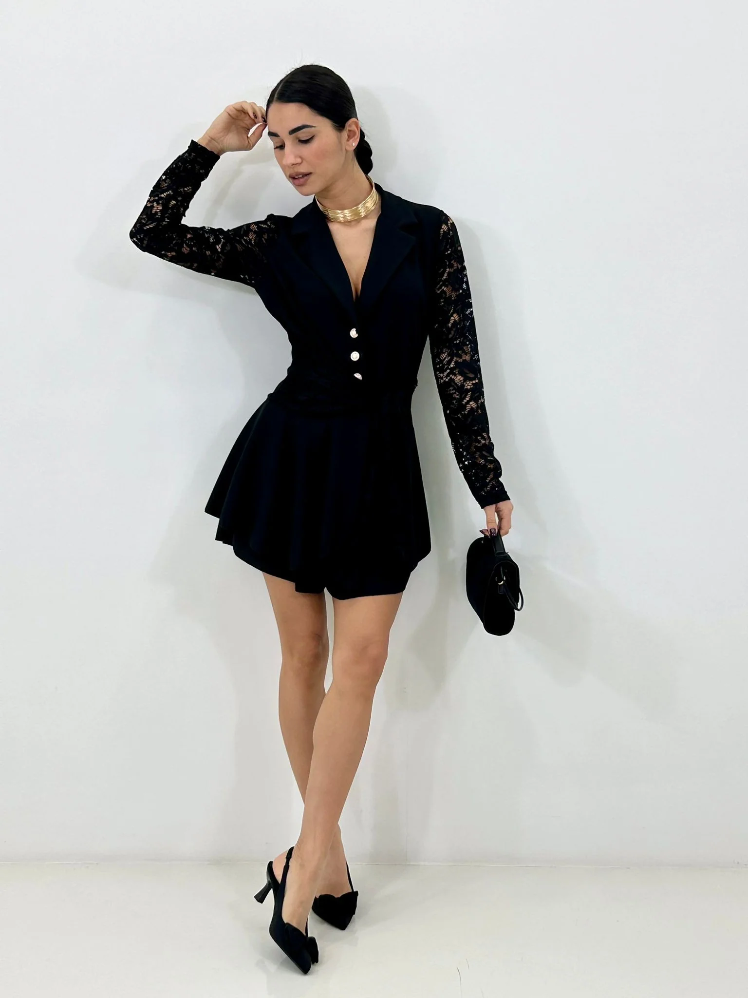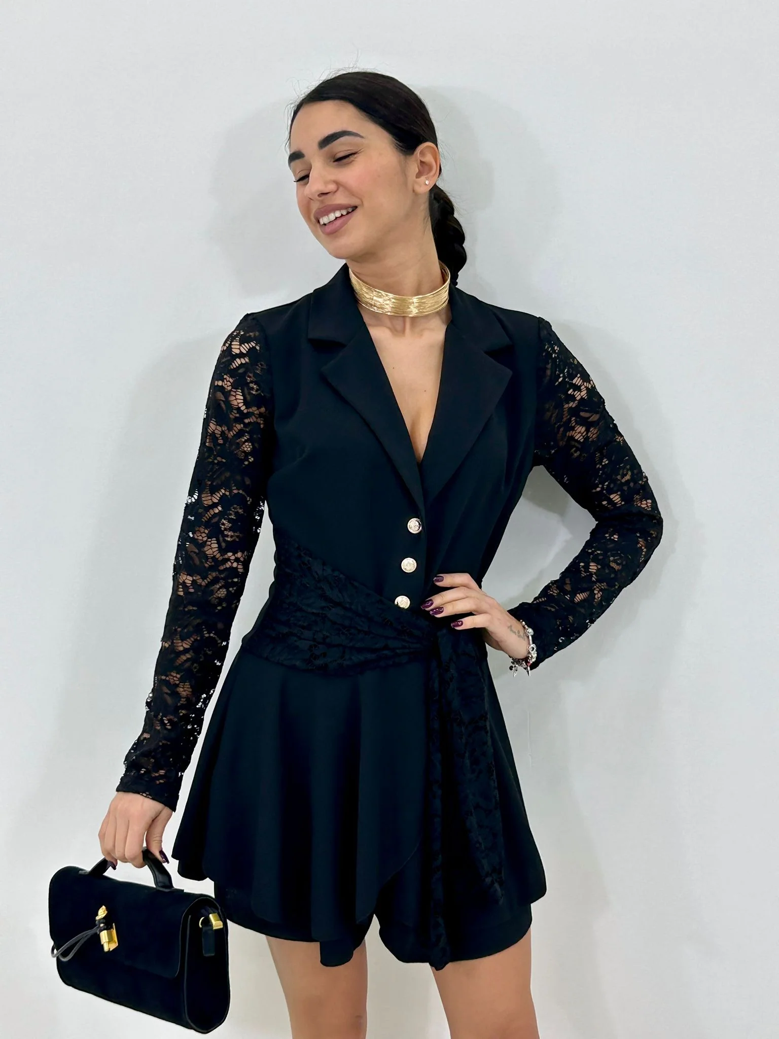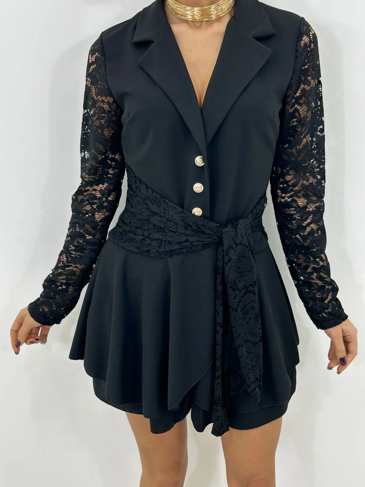 Vestito giacca (shorts sotto)con maniche in pizzo ,bottoni oro e balze