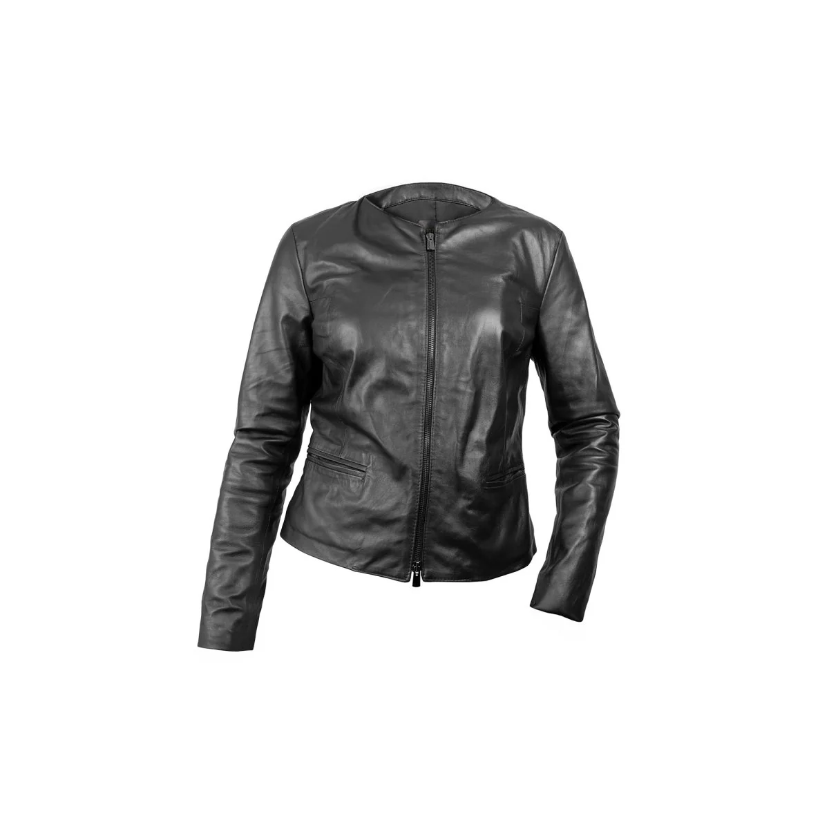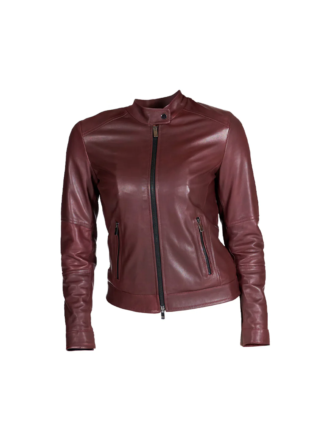 Giubbino in pelle bordeaux con dettagli neri.