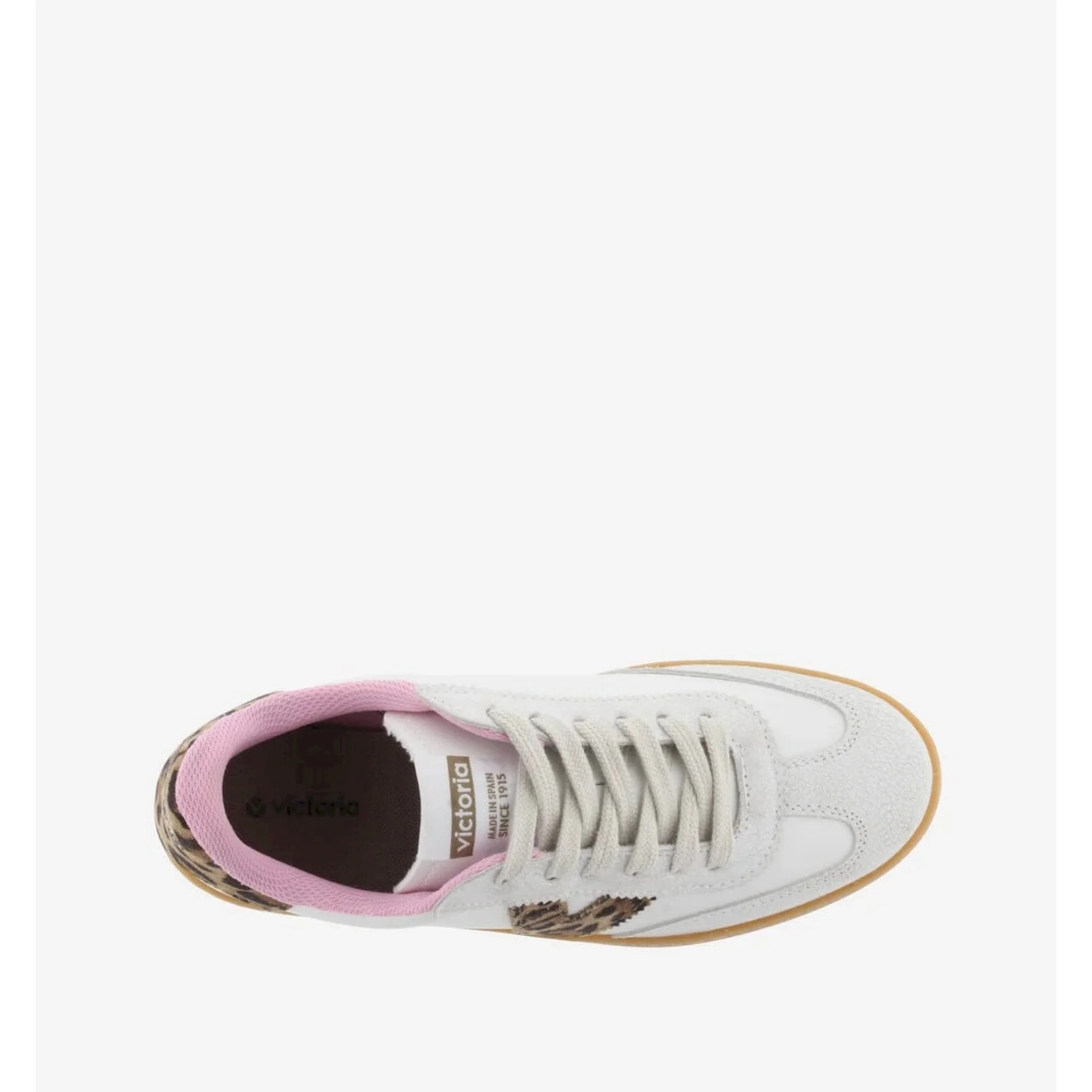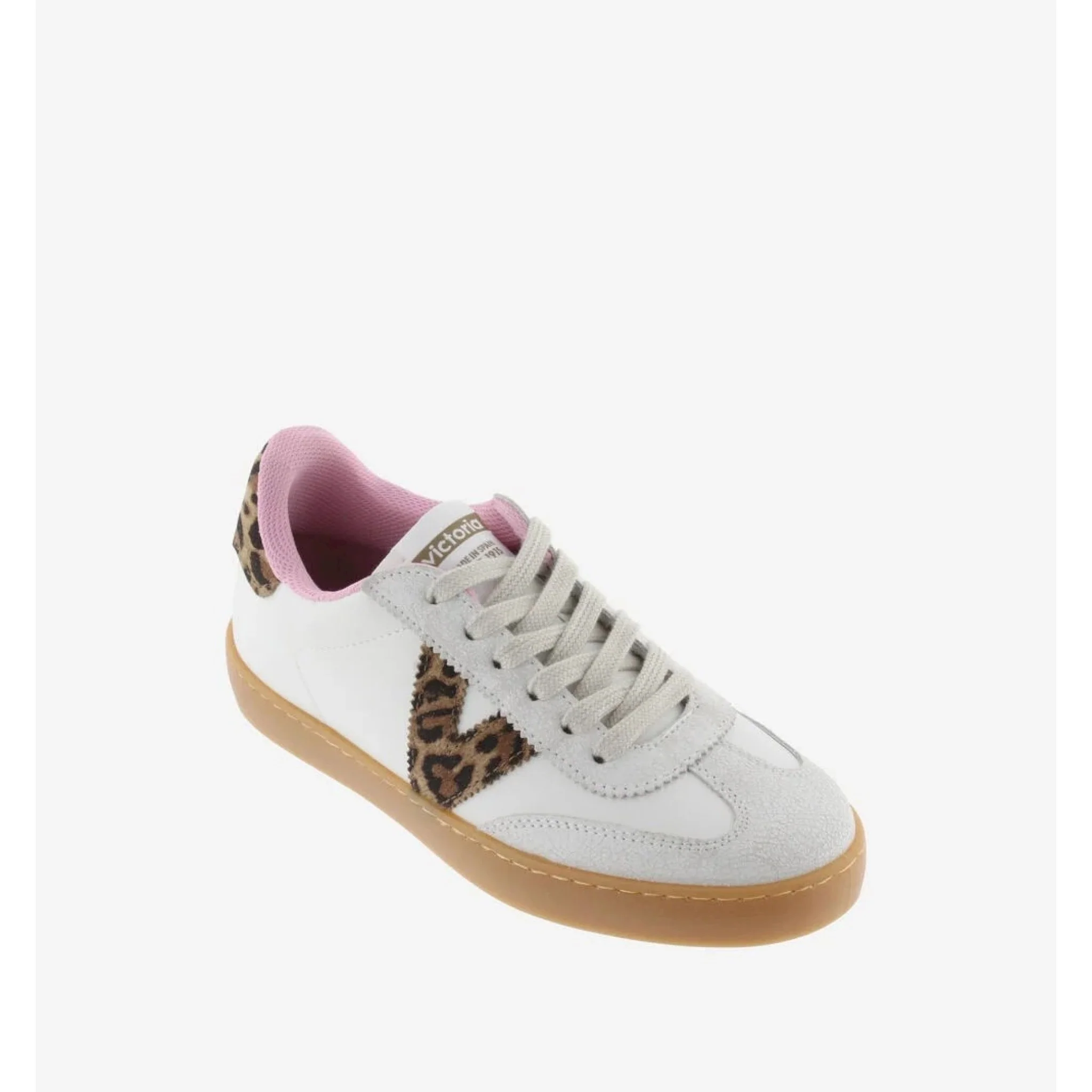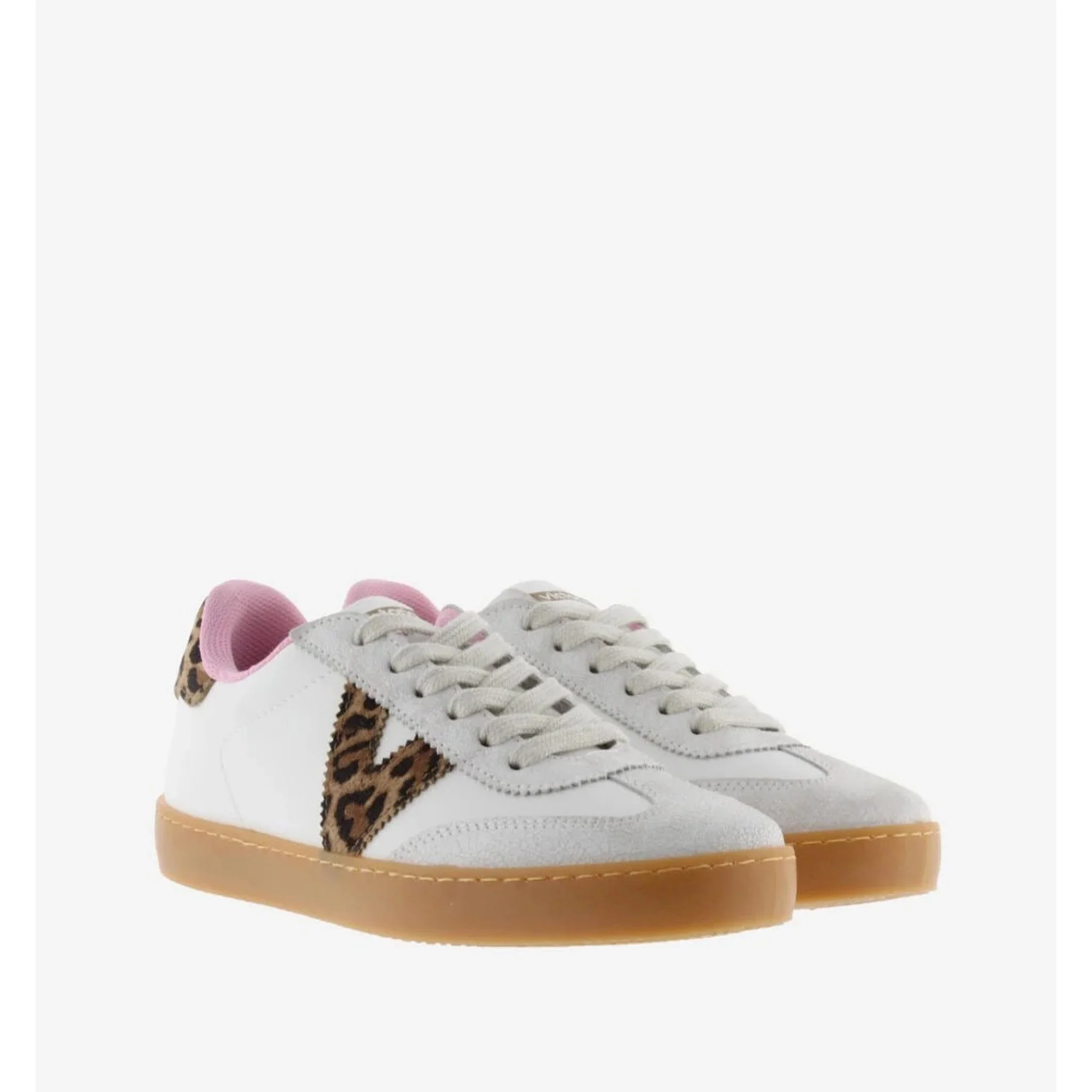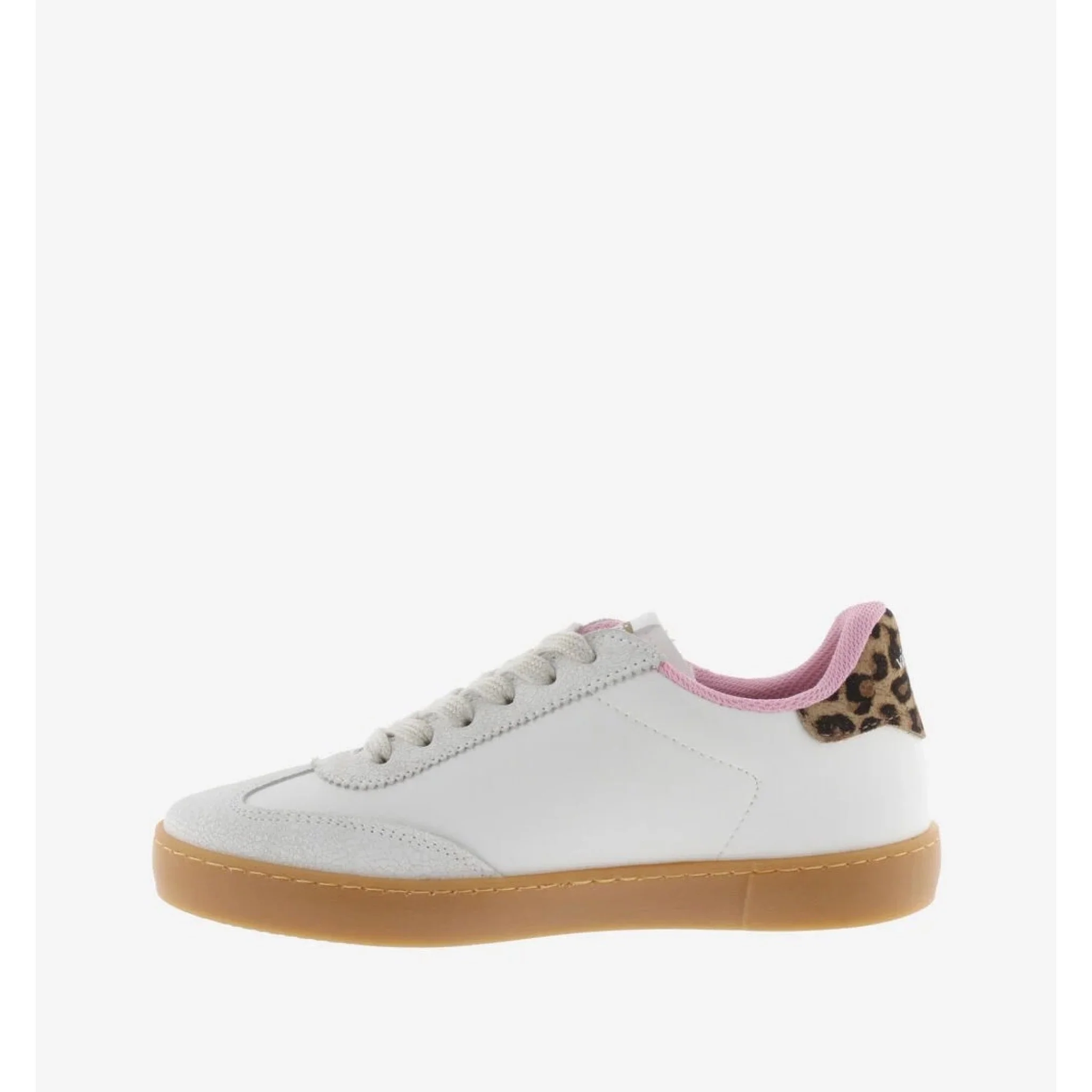 Sneakers bianche per donna con stampa leopardata sulla v laterale e sulla parte posteriore. crosta in pelle sulla punta e fodera interna rosa. suola traslucida color caramello per un tocco di stile rétro. sono inoltre dotate di una soletta ancora più ergonomica realizzata con materiali riciclati, che offre un comfort superiore a ogni passo.