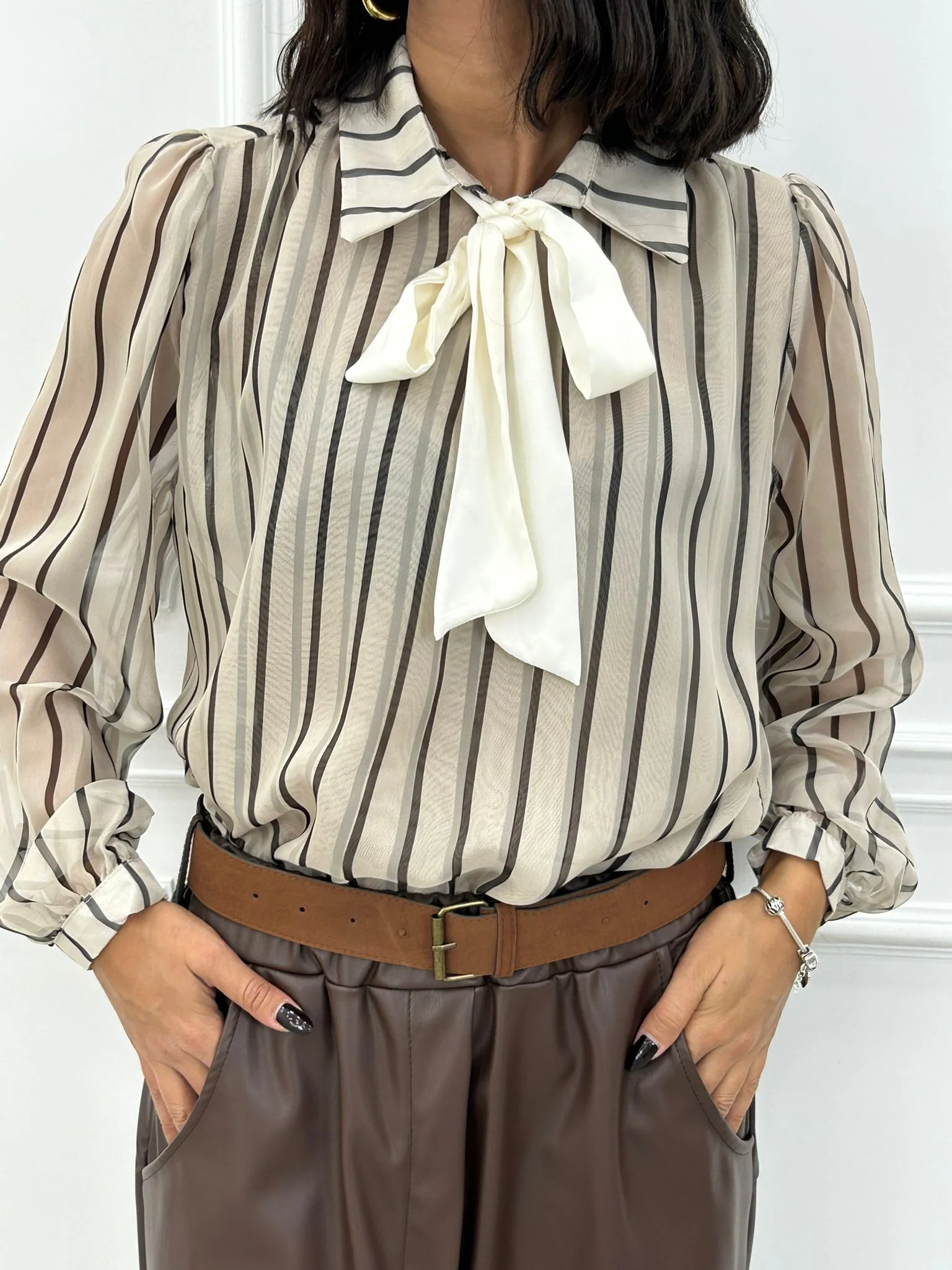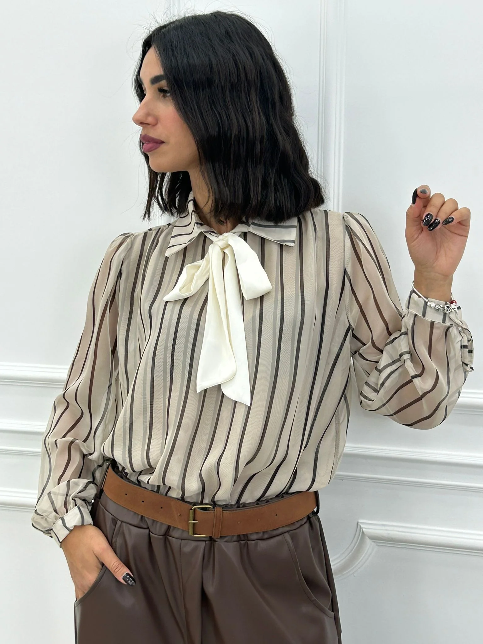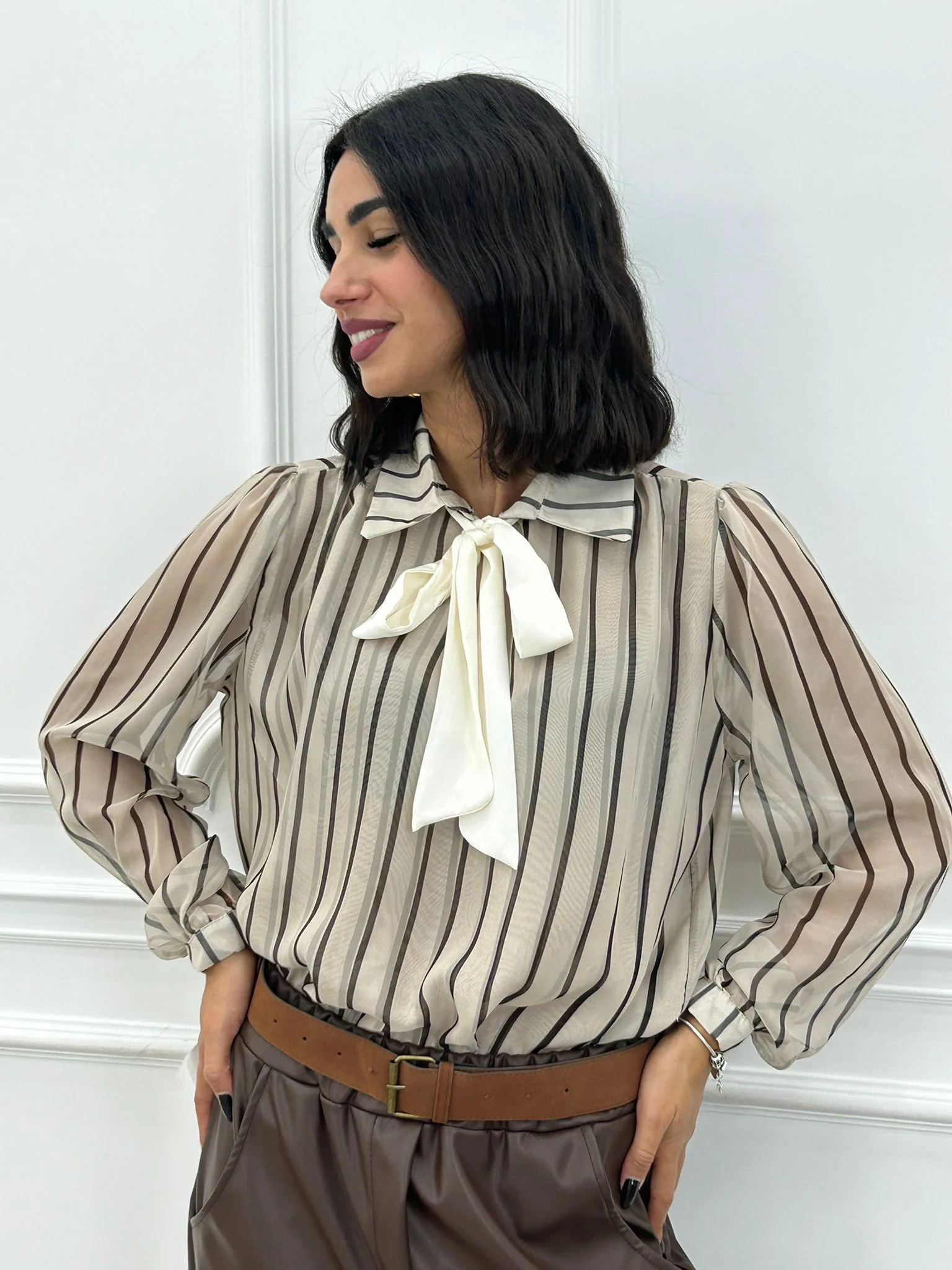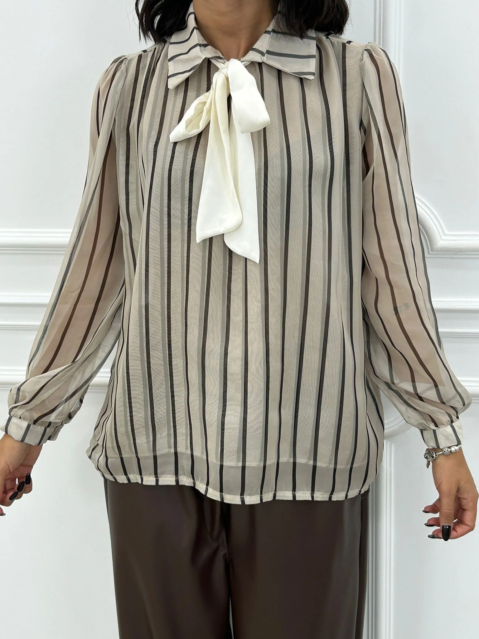 Blusa rigata velata con fiocco