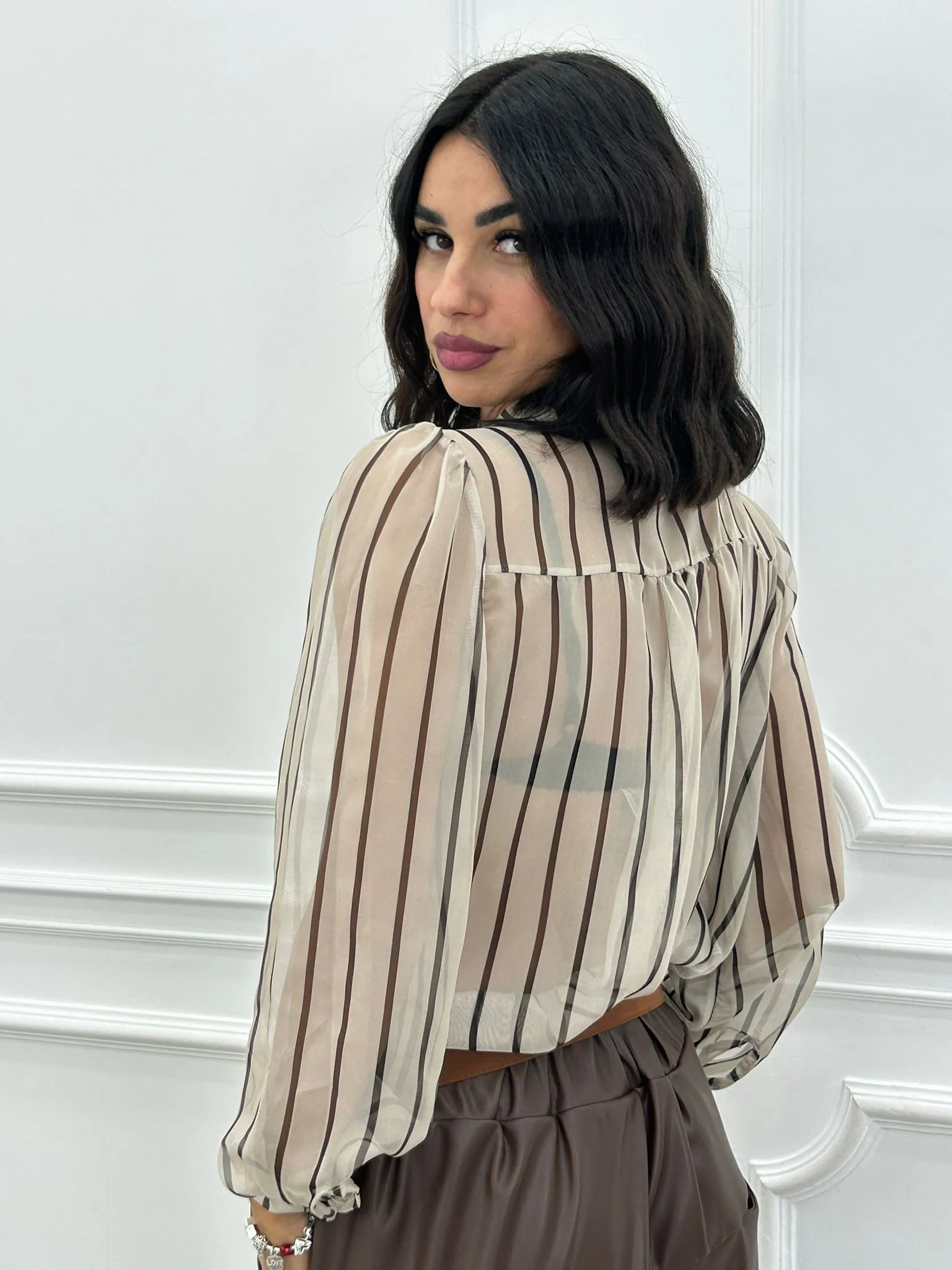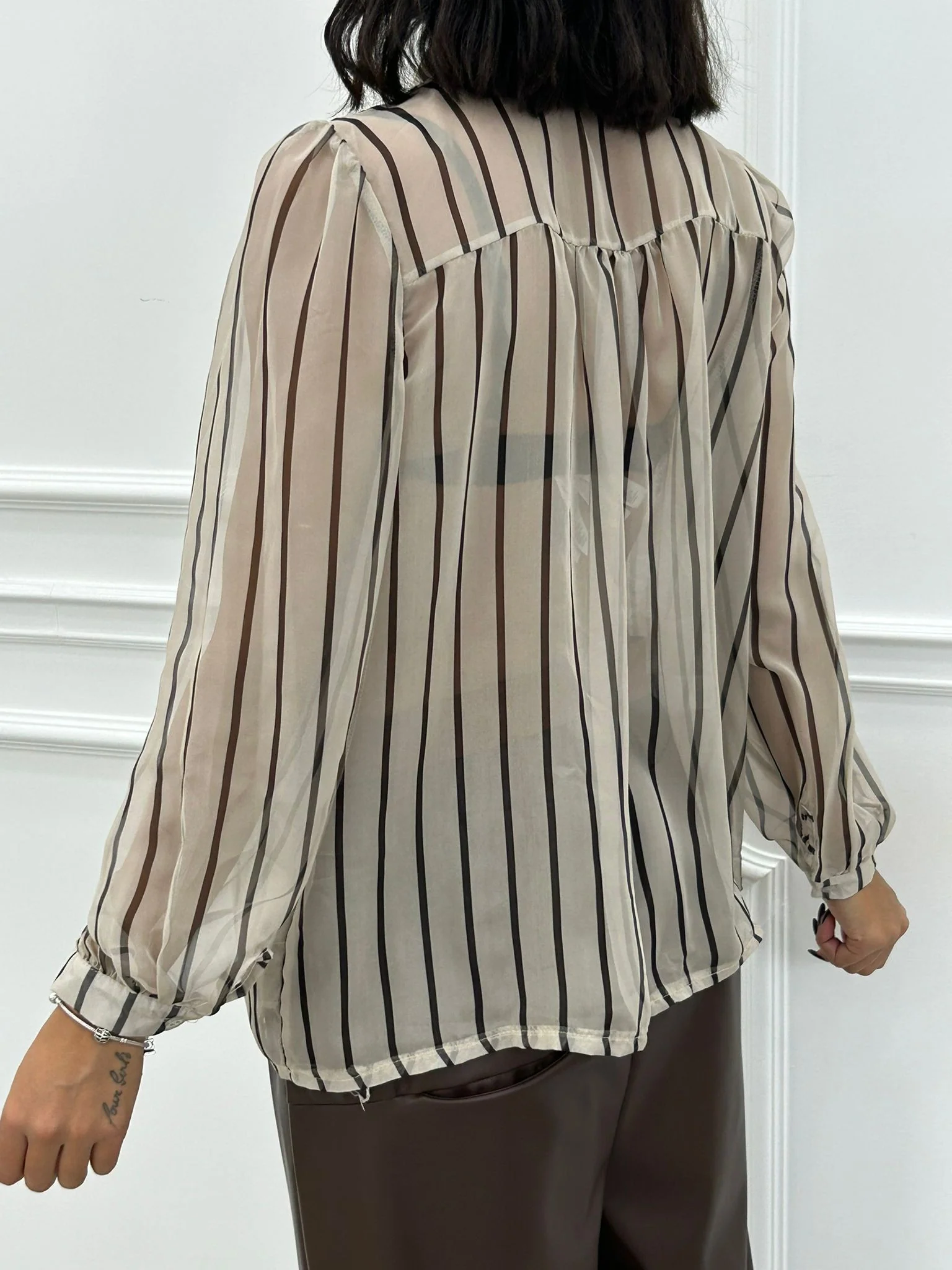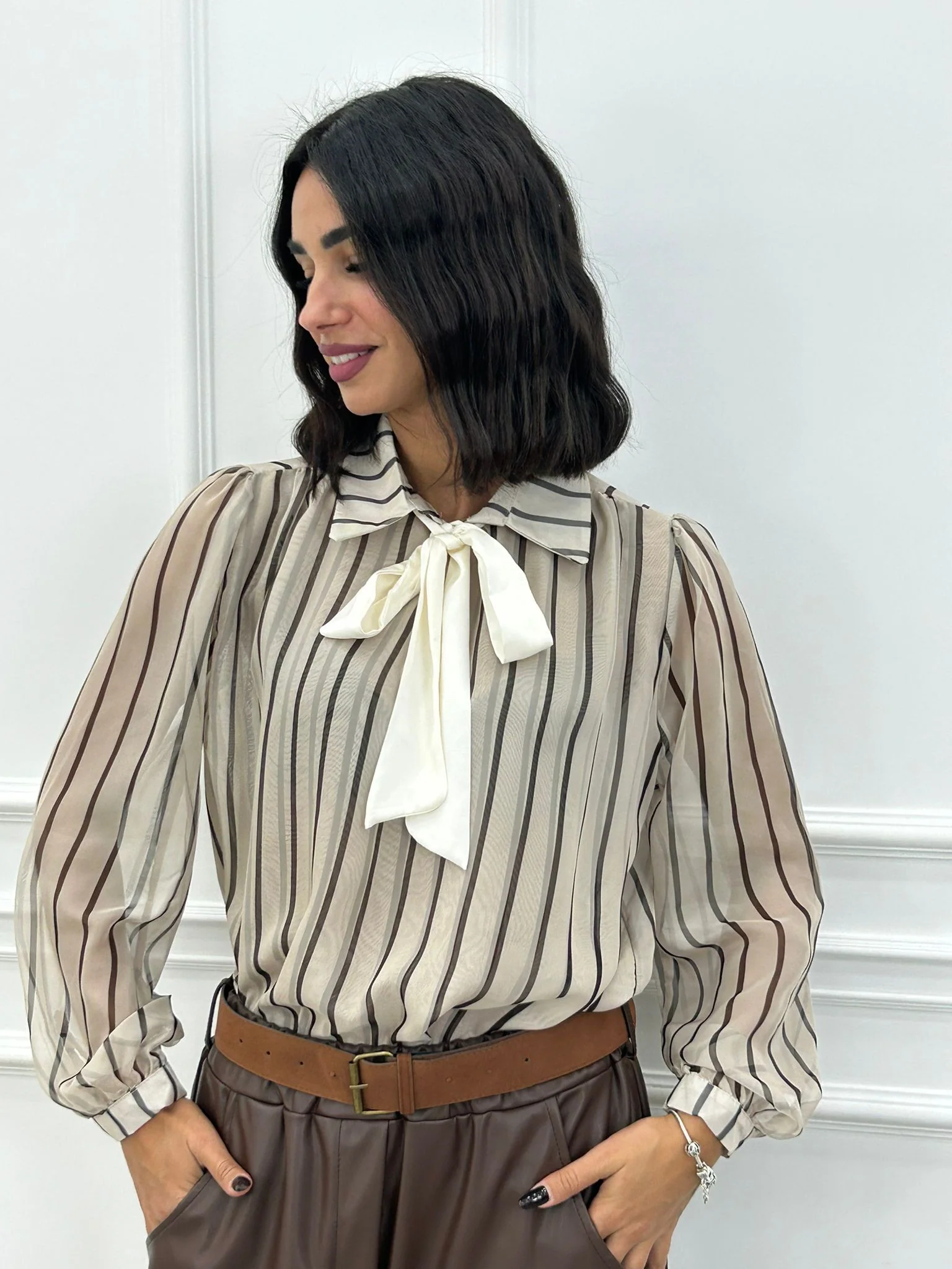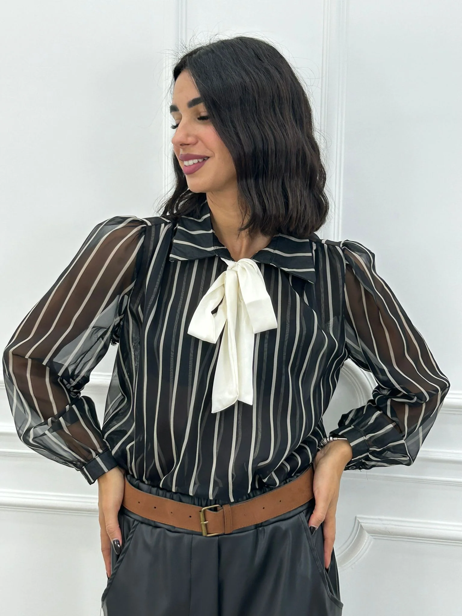 Blusa rigata velata con fiocco