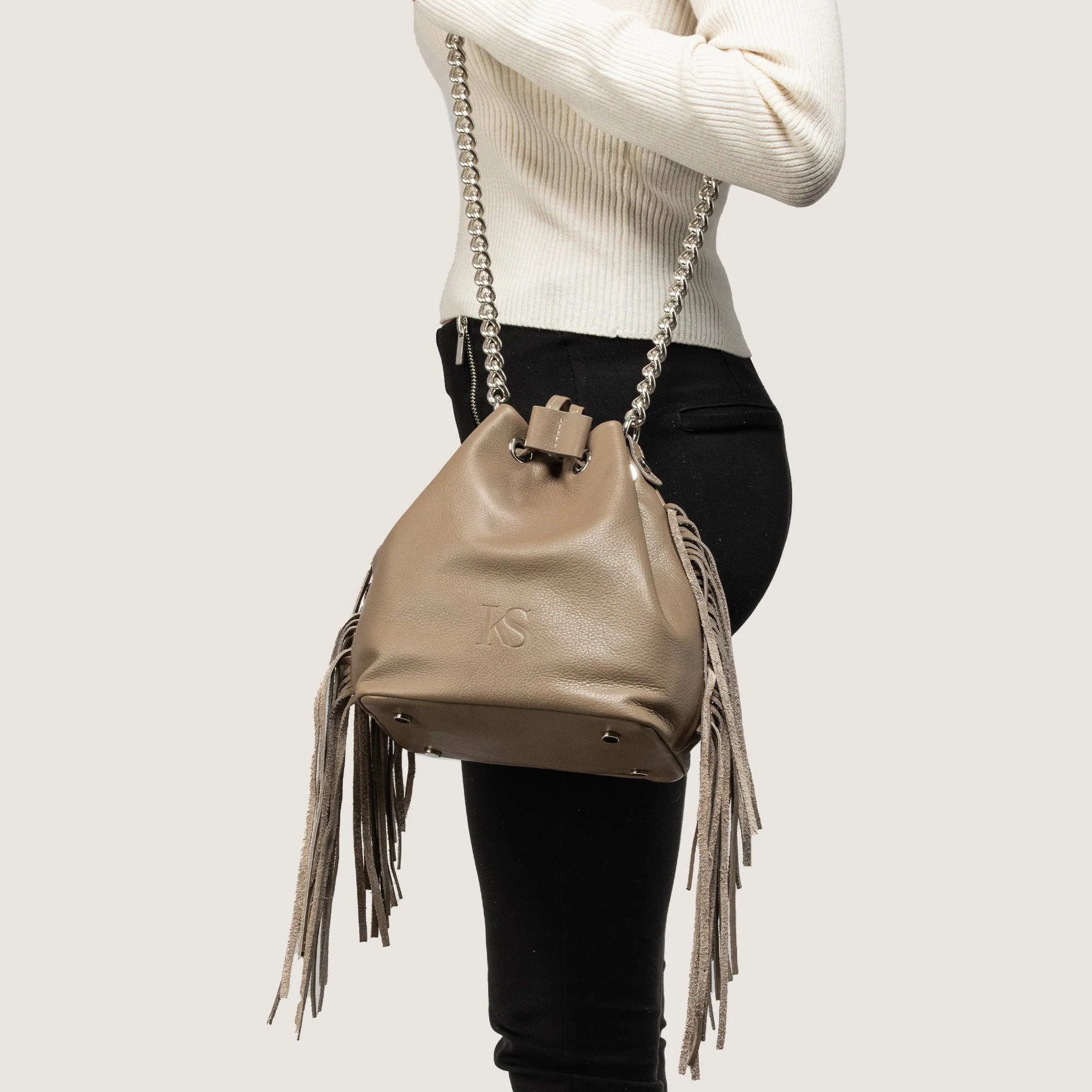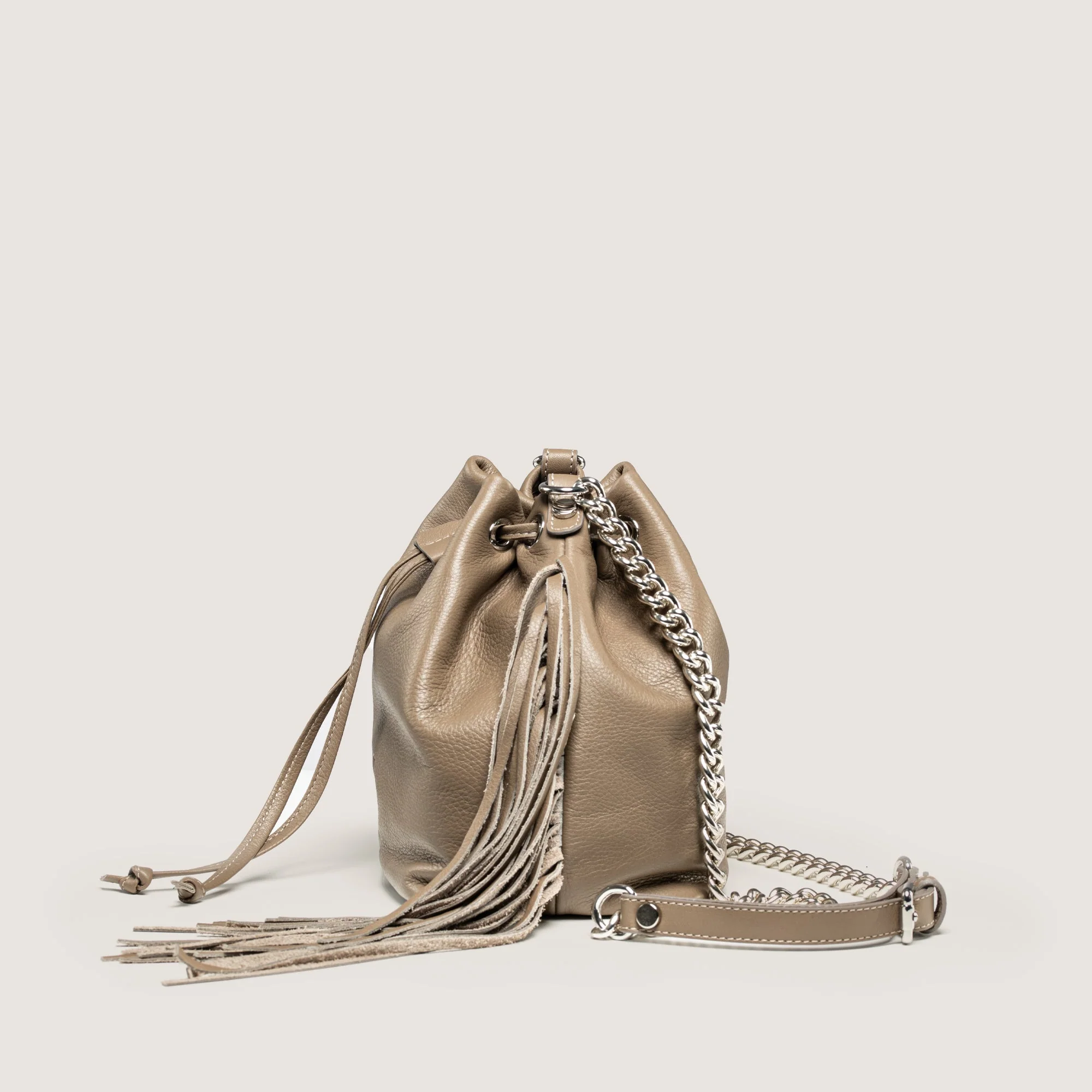 La borsa Muse, ispirata alle muse dell’arte, combina un design contemporaneo con dettagli raffinati. Realizzata a mano in Italia con pellame pieno fiore certificato LWG, garantisce uno stile unico con una qualità sostenibile e duratura. Questo secchiello, impreziosito da frange e da una catena in metallo, unisce praticità e carattere, rendendolo il complemento ideale sia per look diurni che serali.