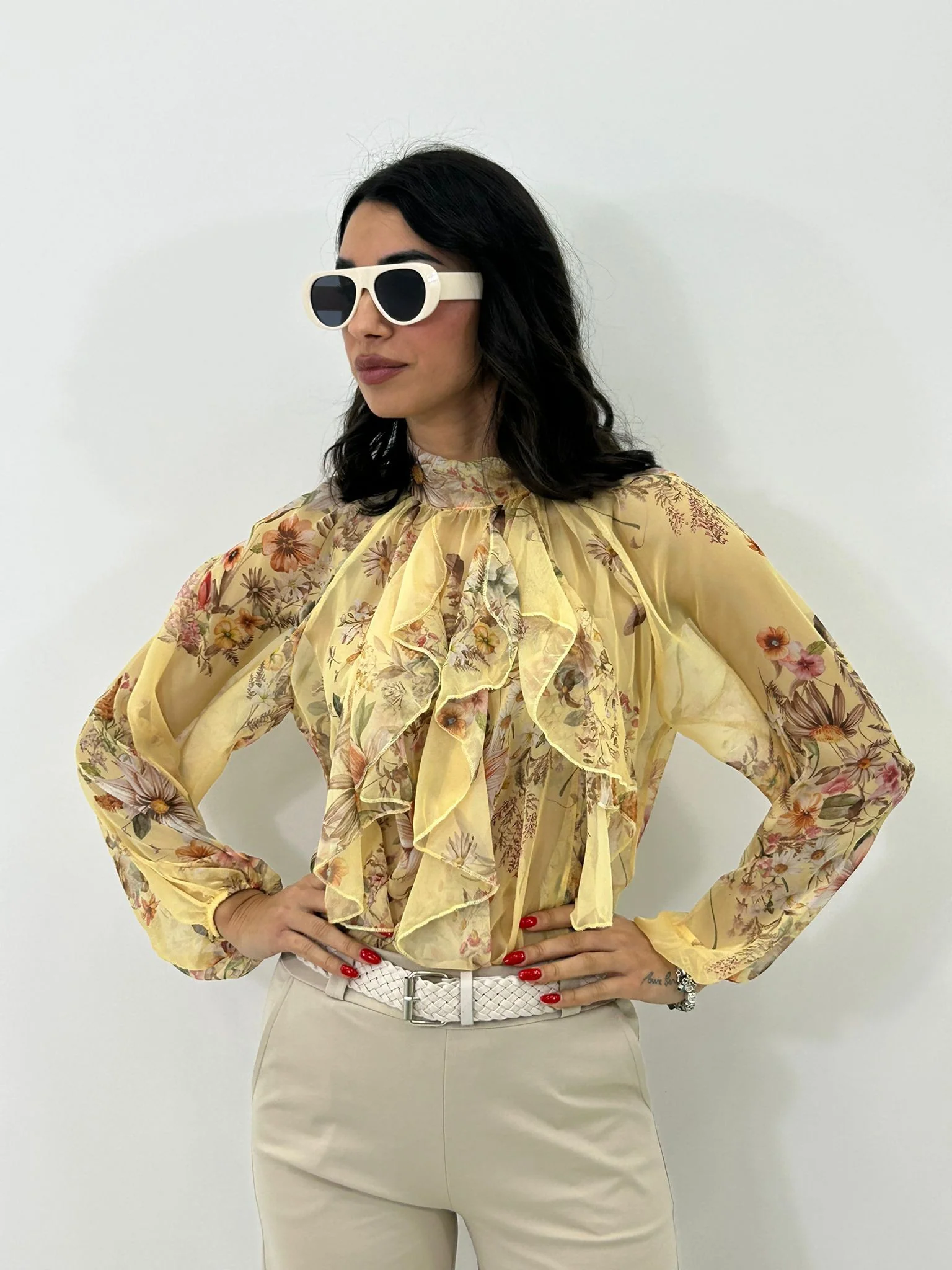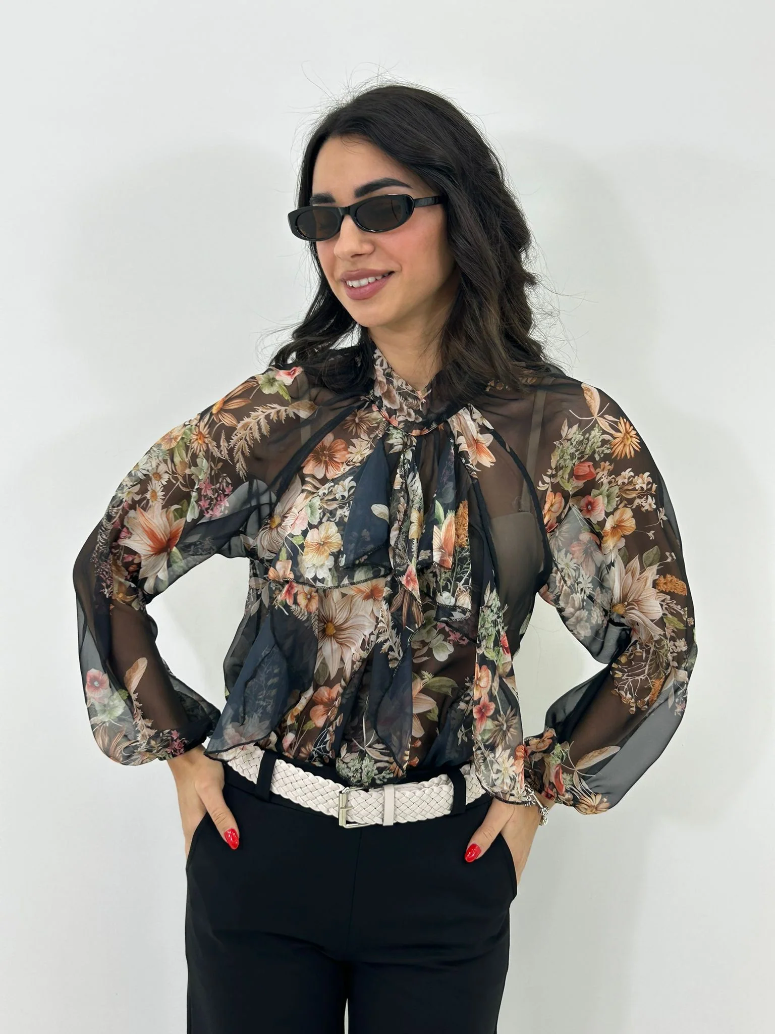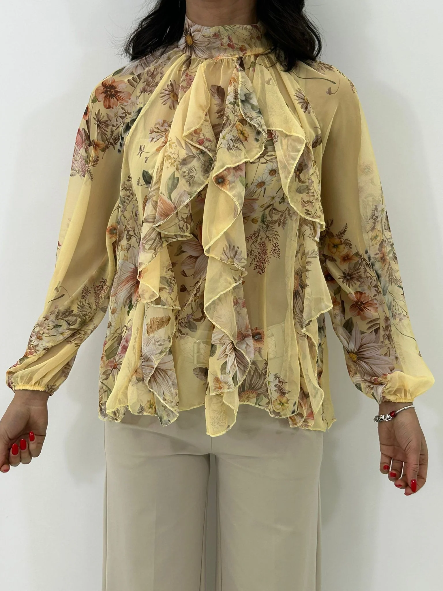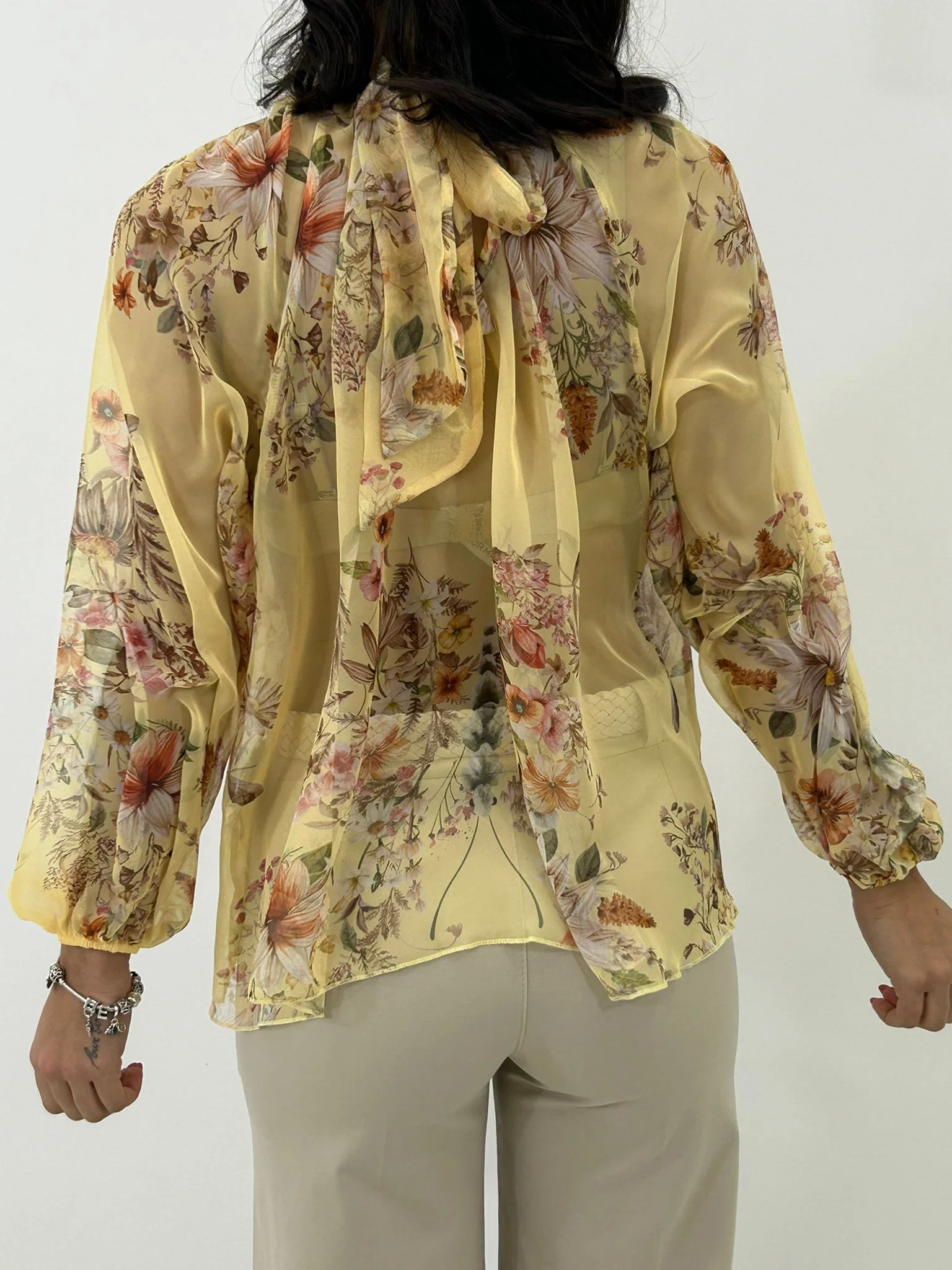 Camicia georgette fantasia con fiocco e rouche