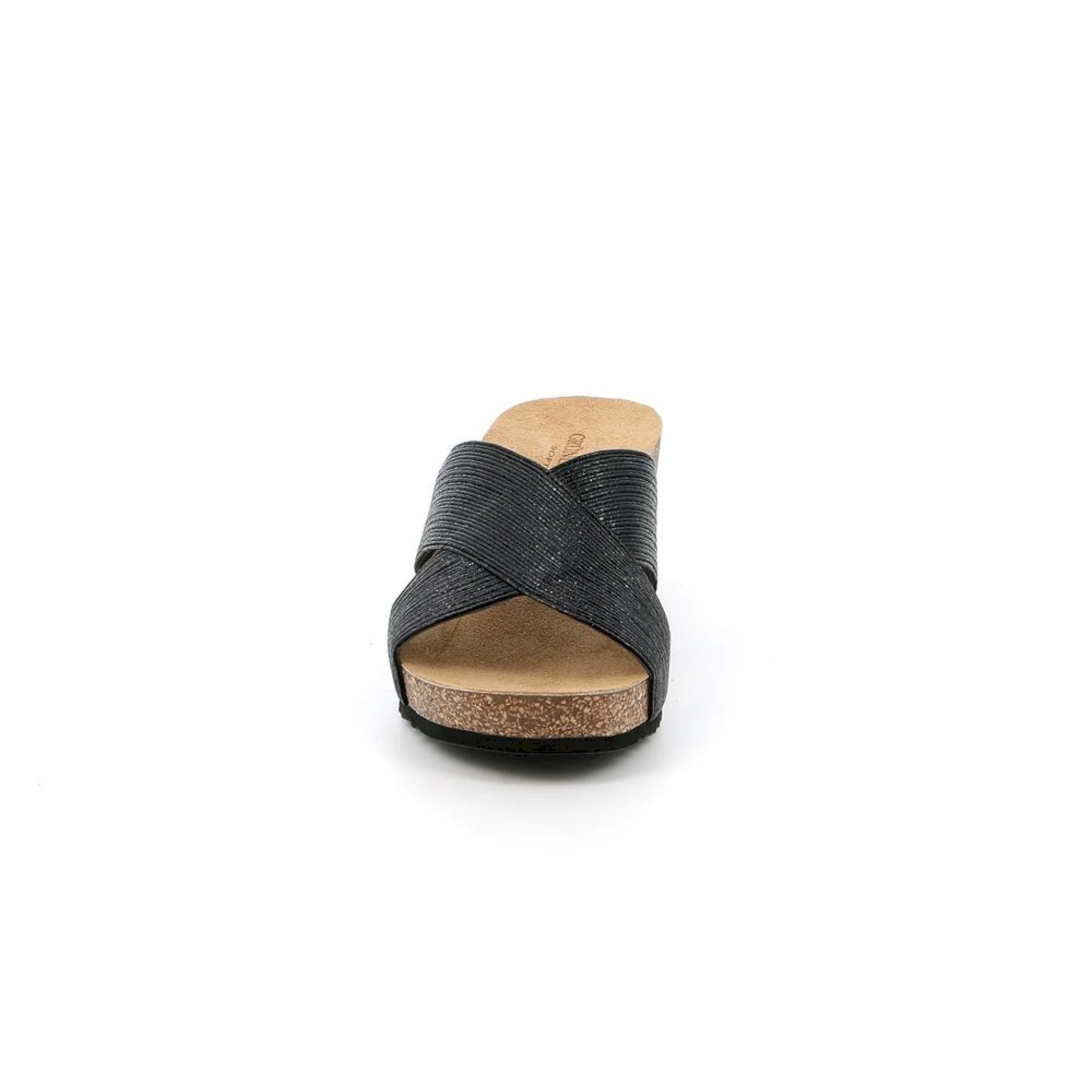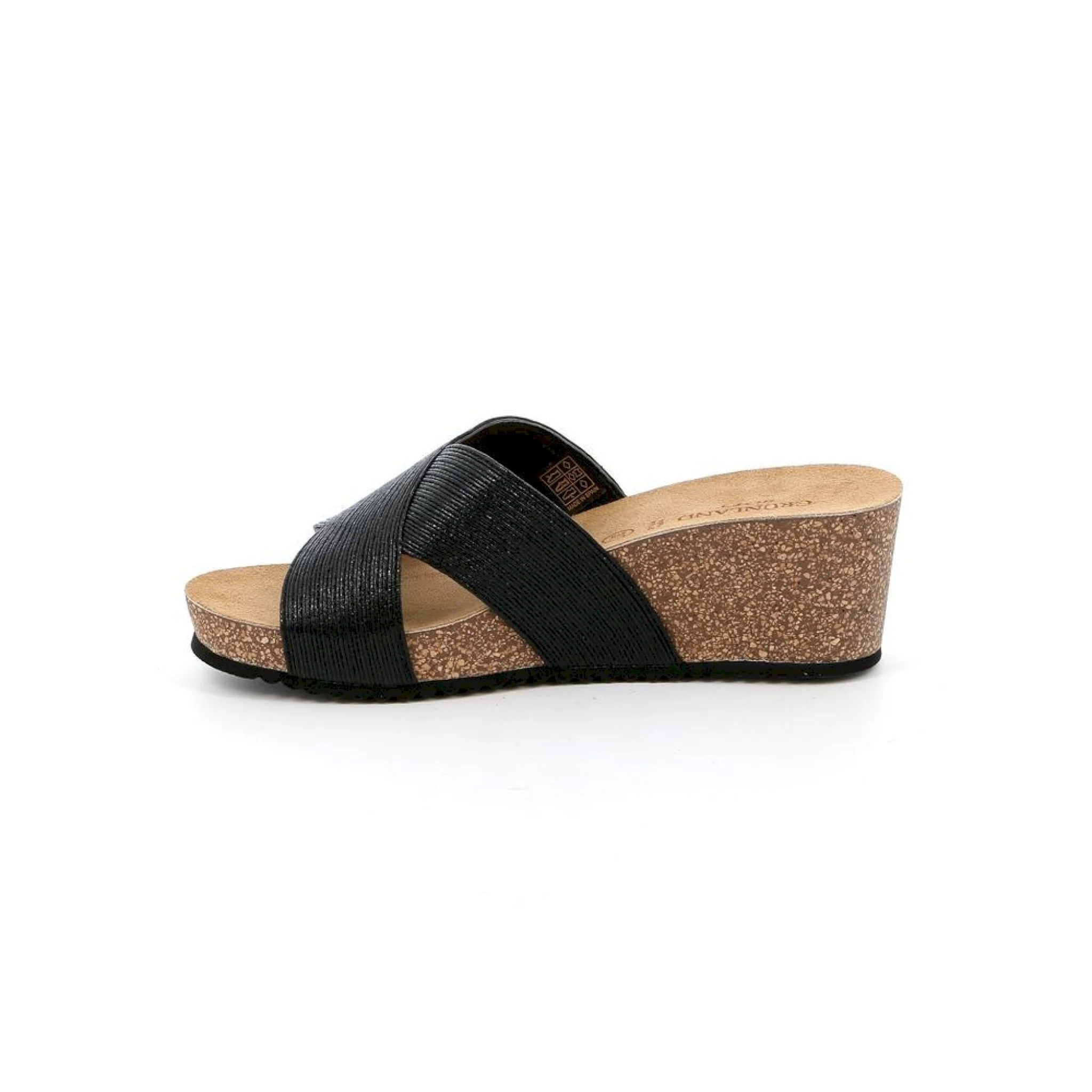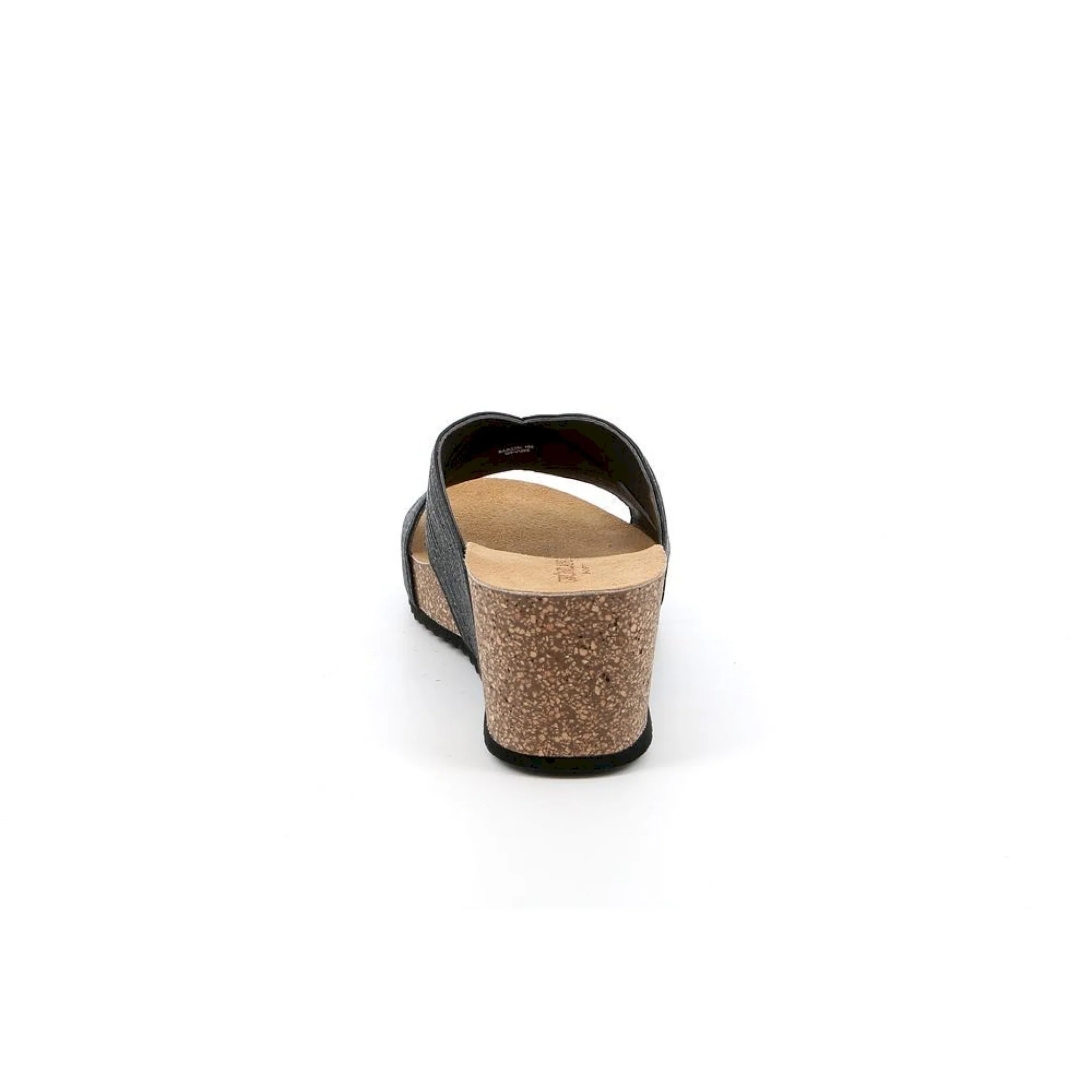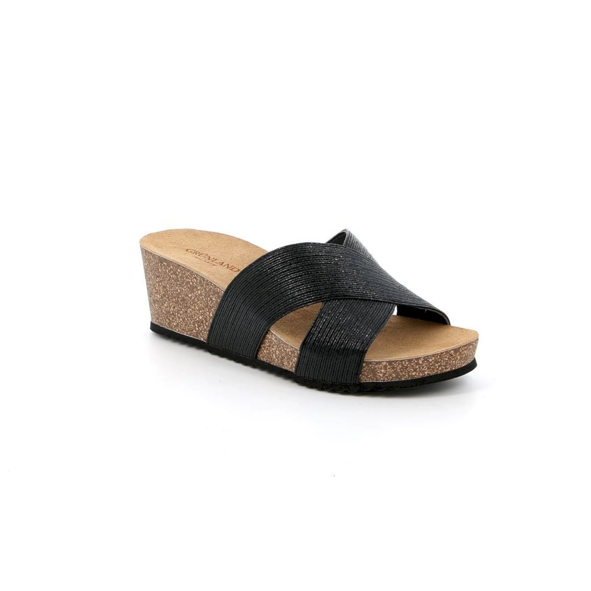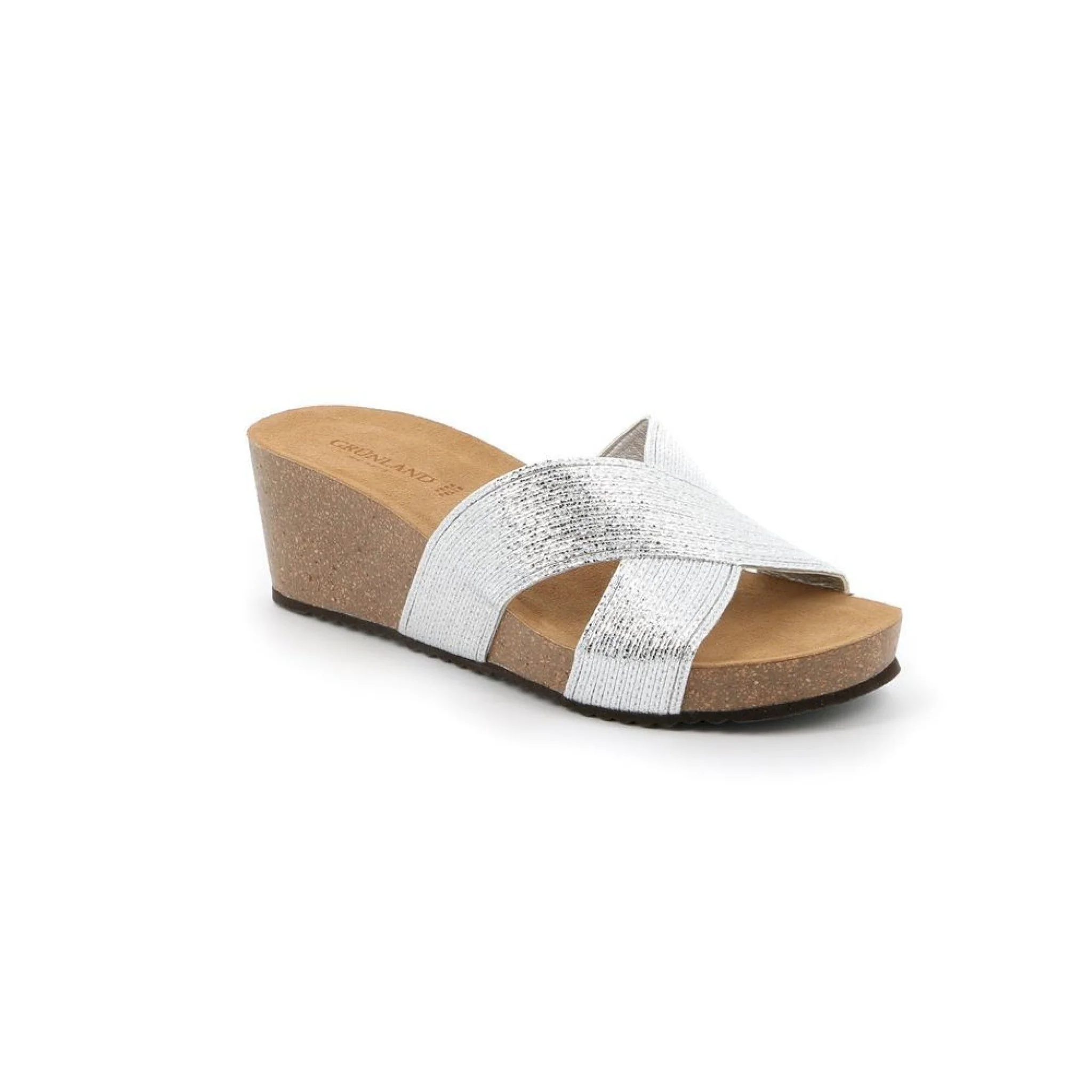 Questa ciabatta con fasciaincrociata, disponibile in platino e nero, è la ciabatta della tua estate. la zeppa di 5 cm slancia la figura mentre il plantare soft garantisce il comfort made in grünland.
