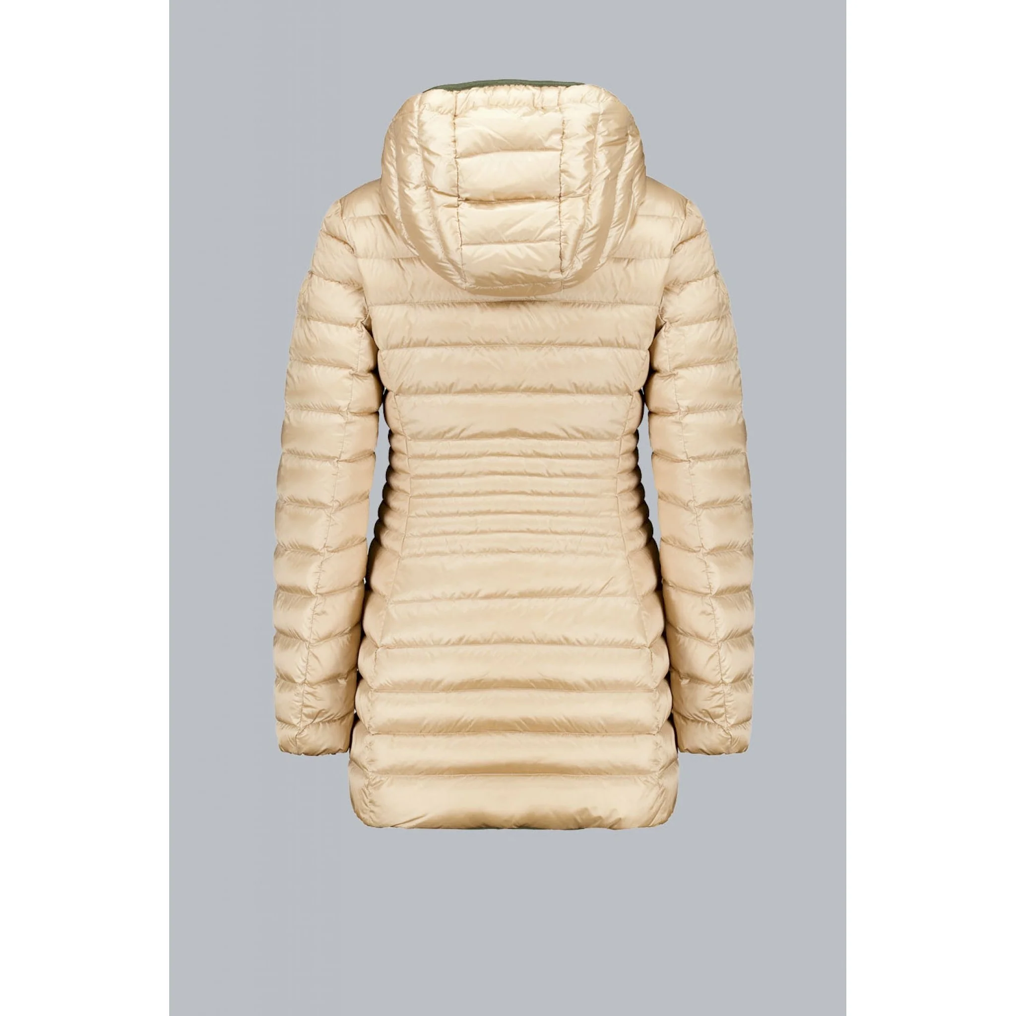 Piumino lungo reversibile da donna imbottito in vera piuma 800 fill power reversibile che consente due opzioni di utilizzo in quanto combina un lato in tessuto liscio e l’altro in nylon trapuntato.