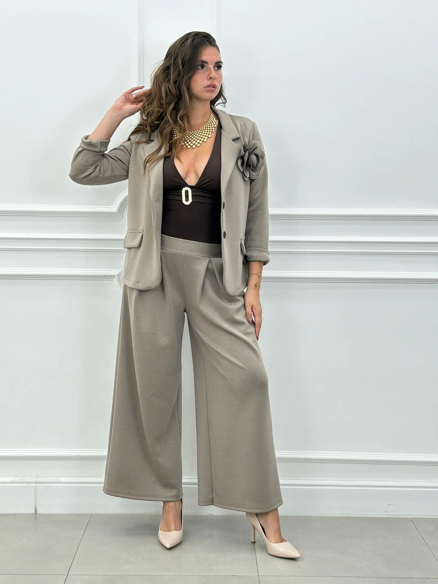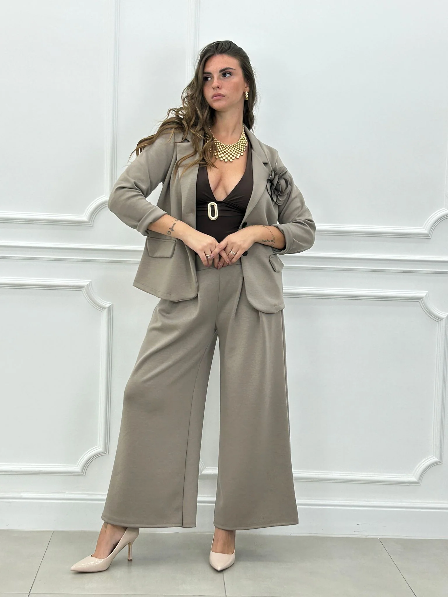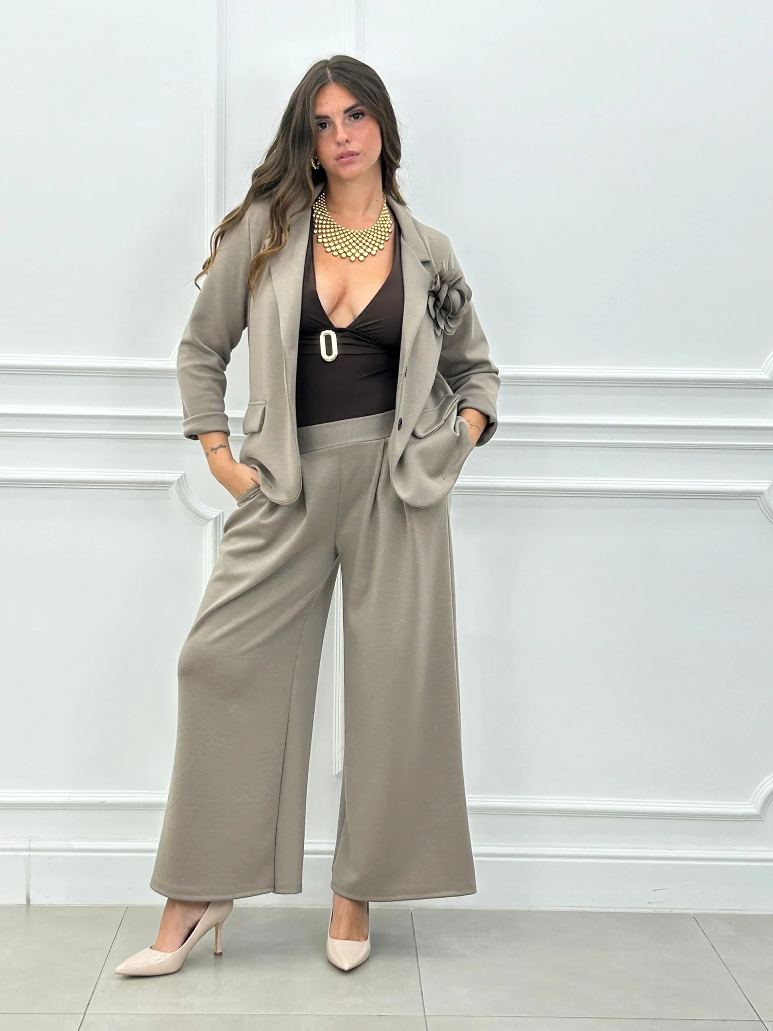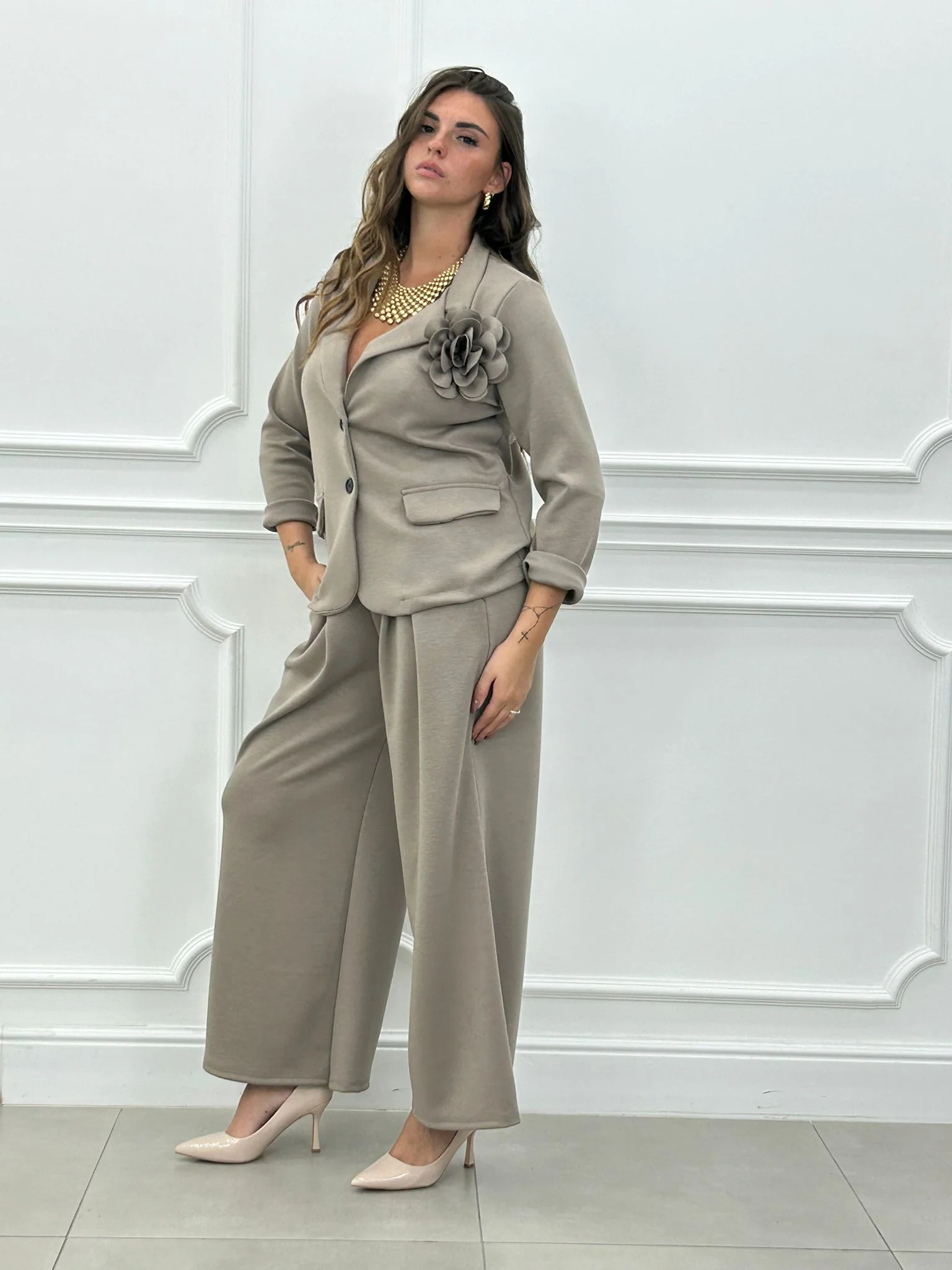 Coordinato giacca con spilla fiore e pantalone palazzo con elastico in vita e tasche