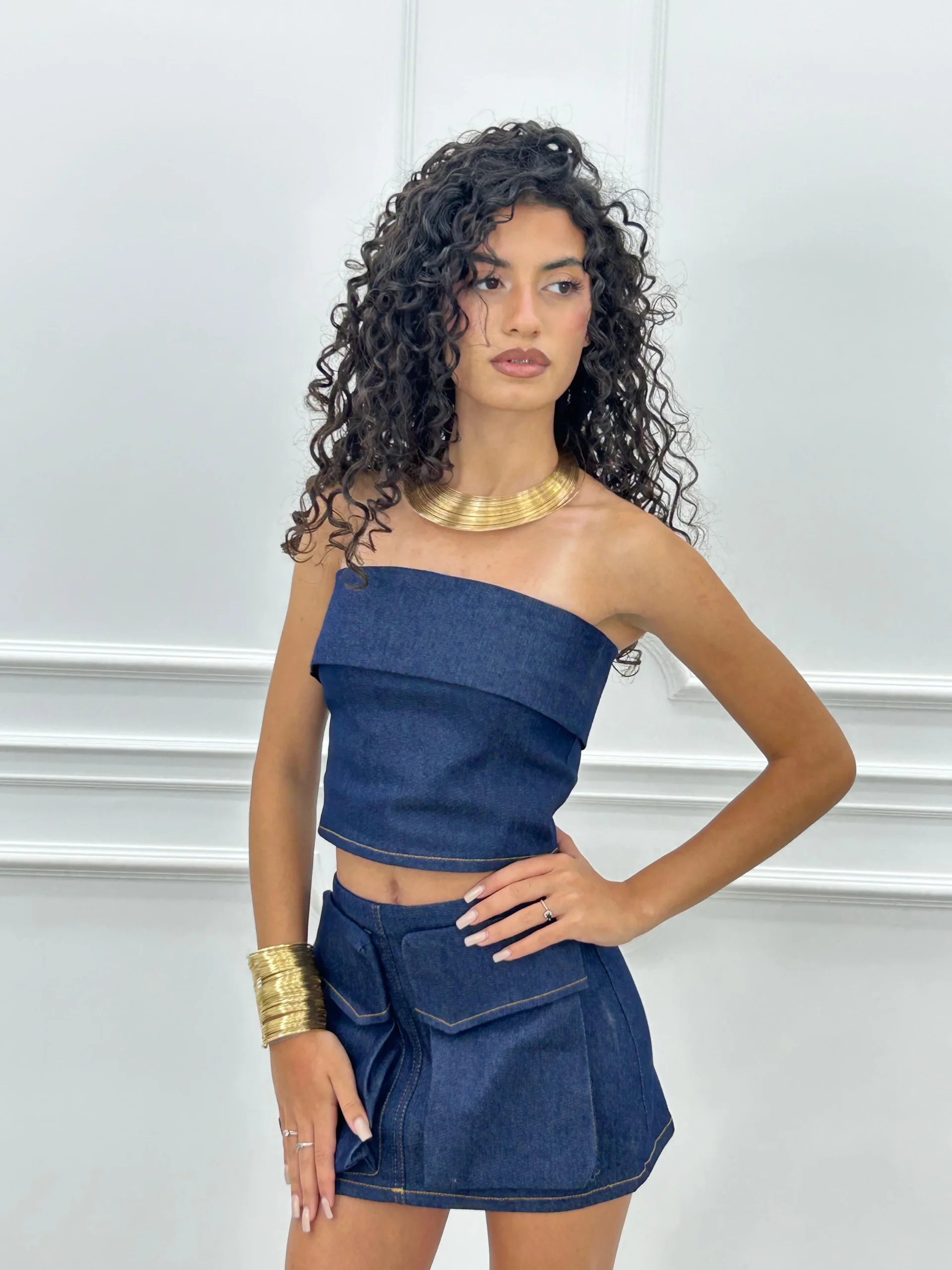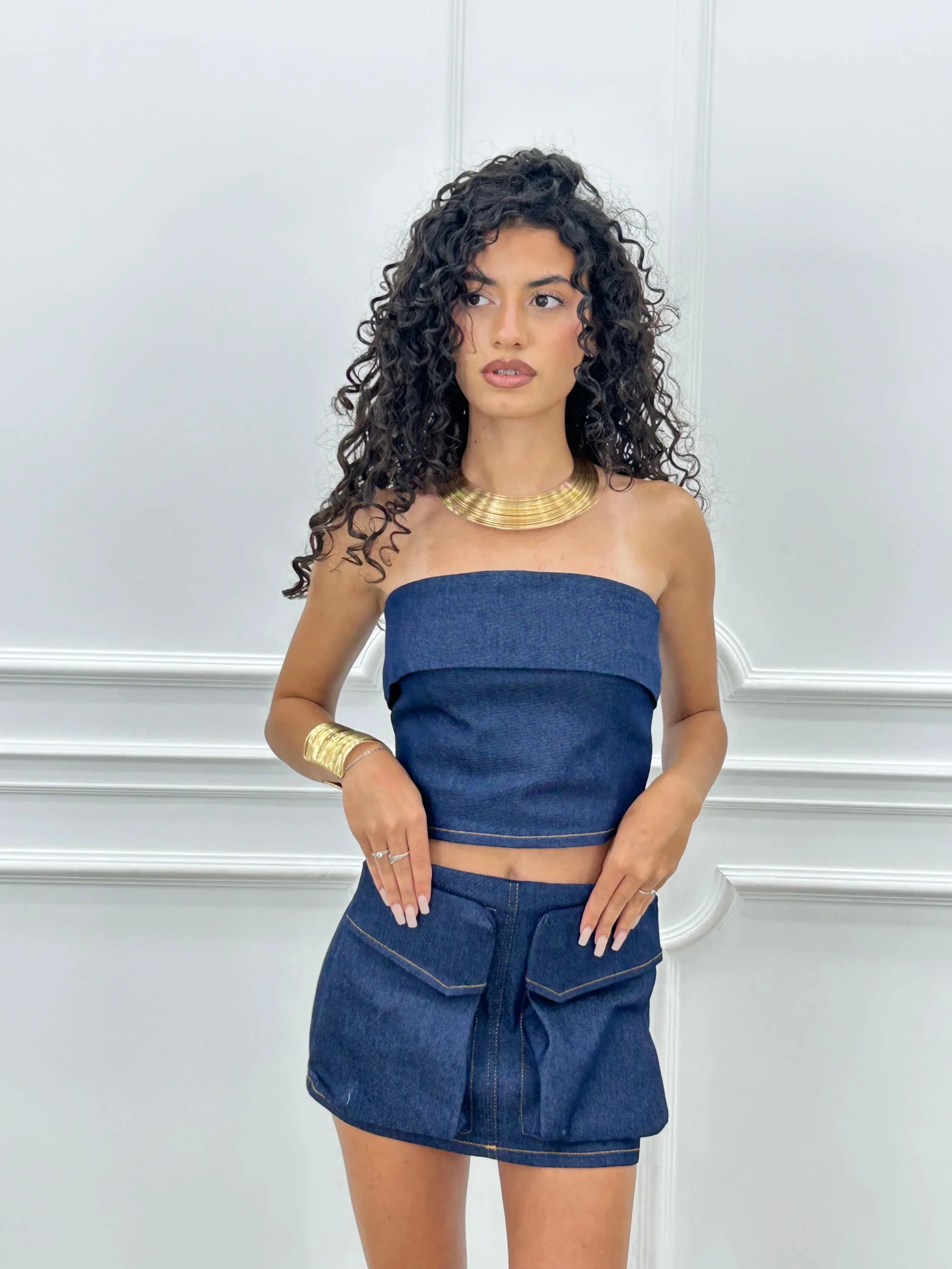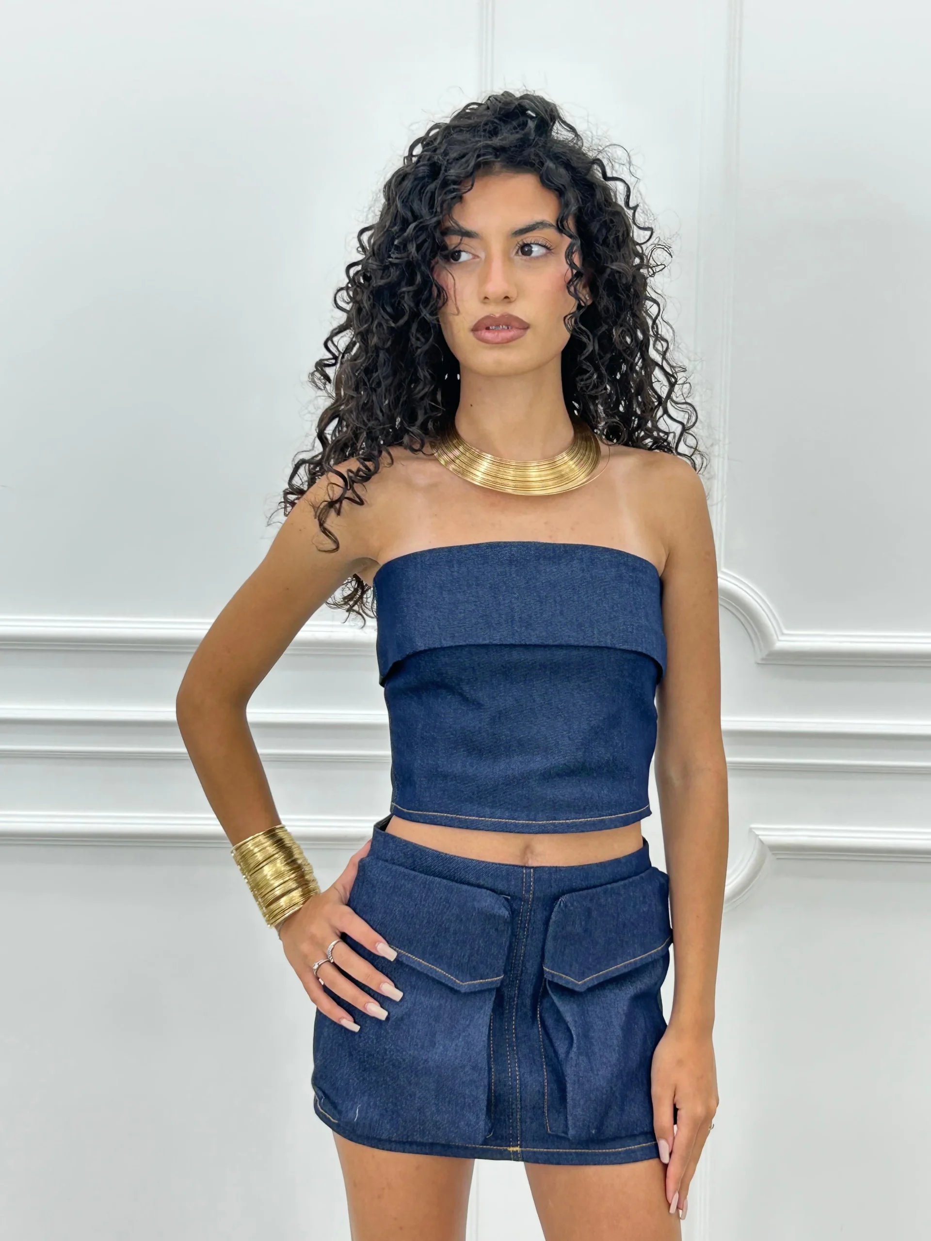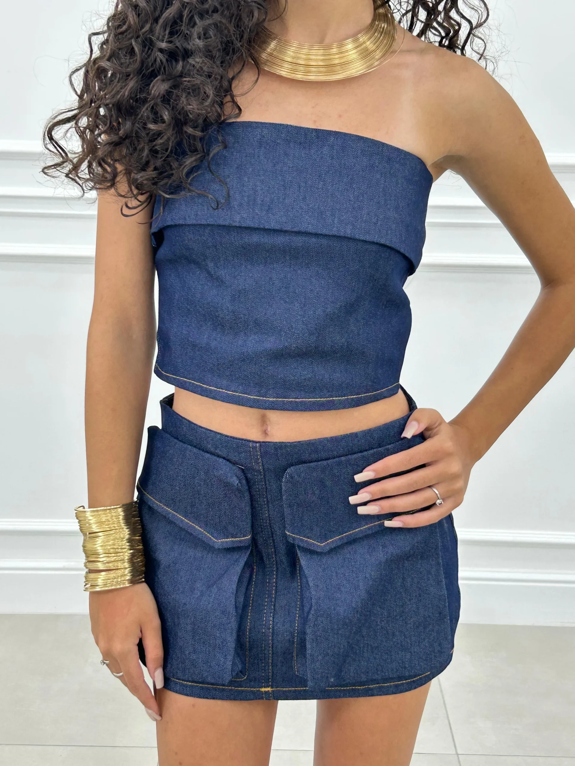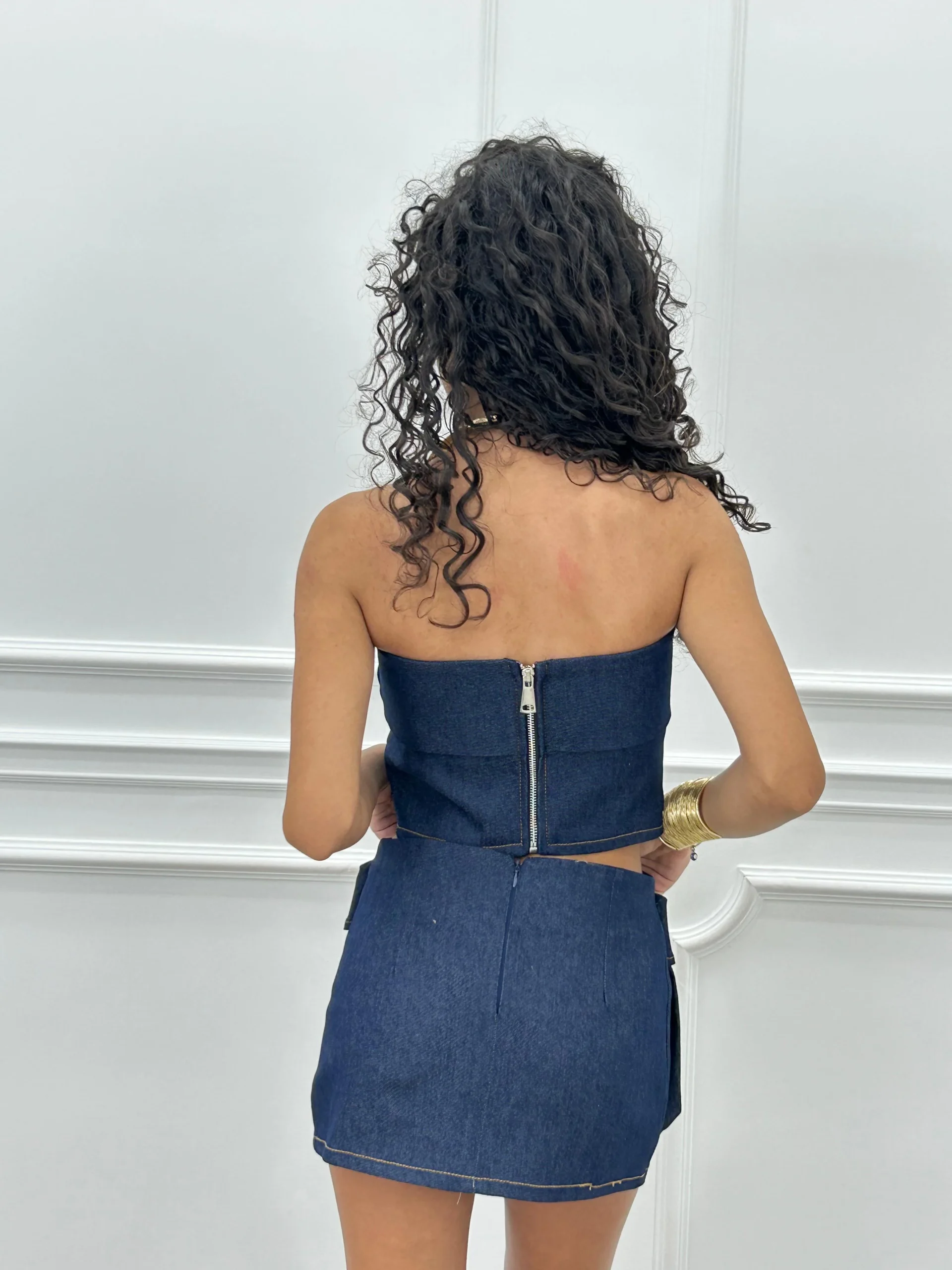 Coordinato in denim con top fascia e gonna con tasconi , chiusura zip posteriore
