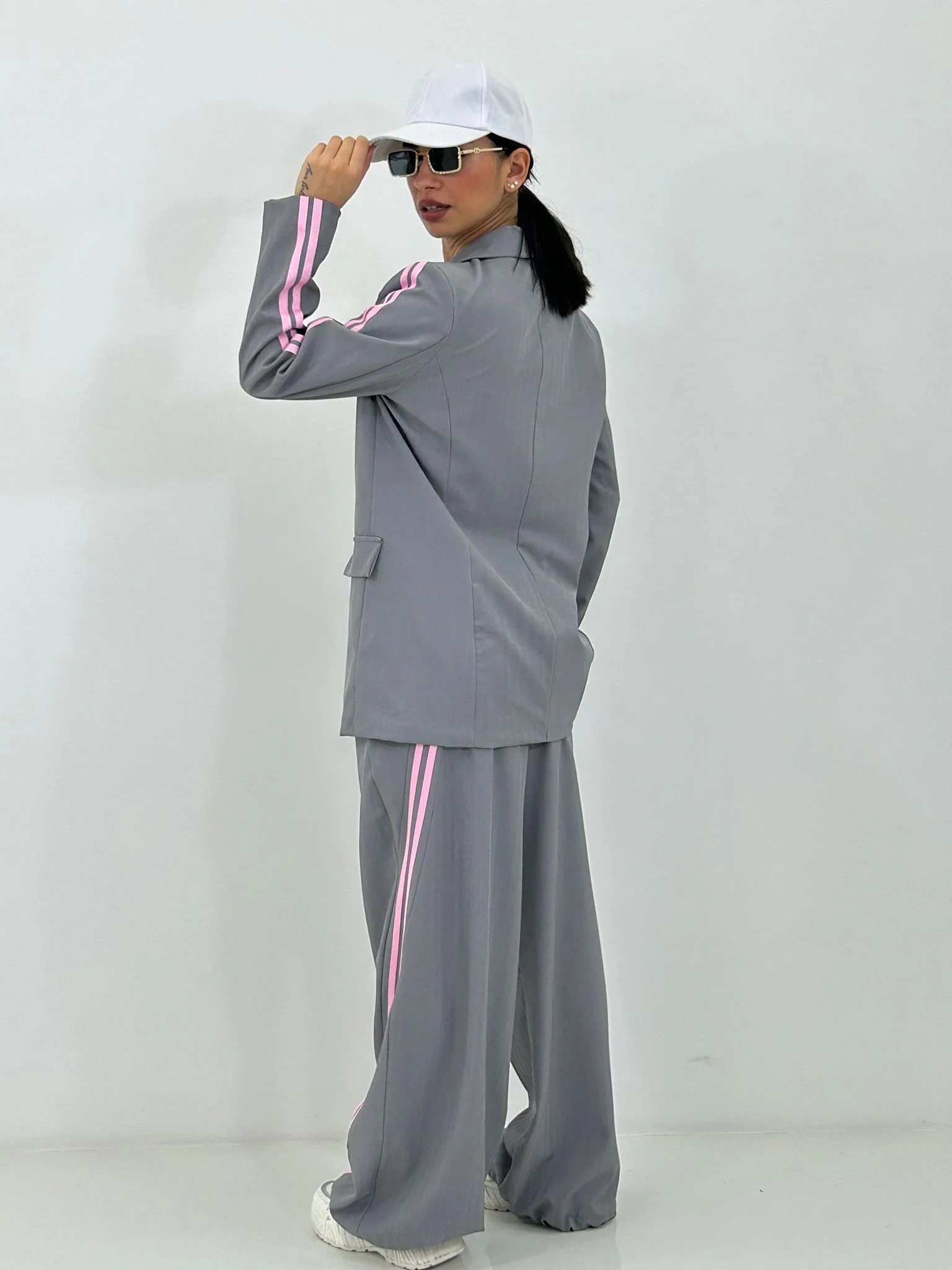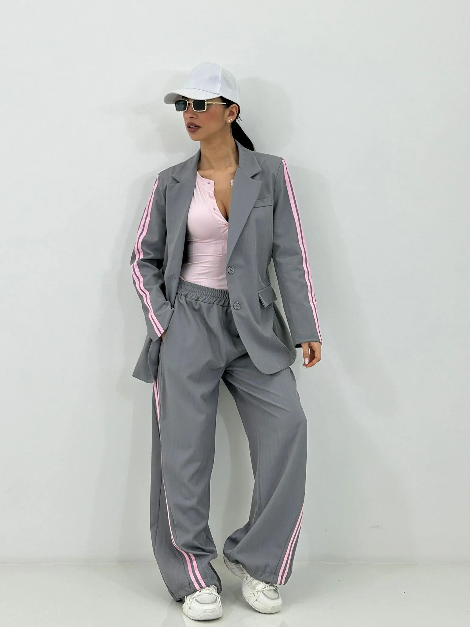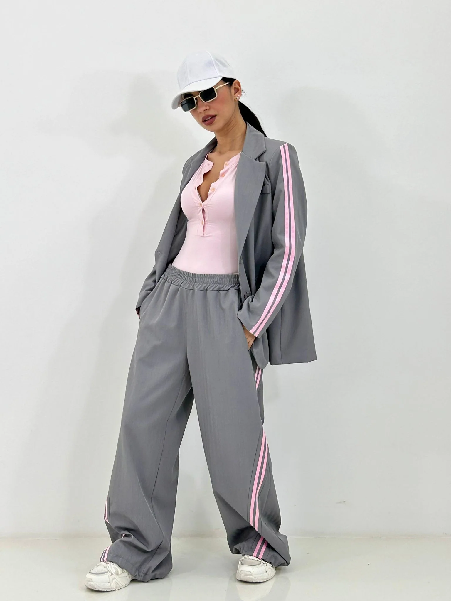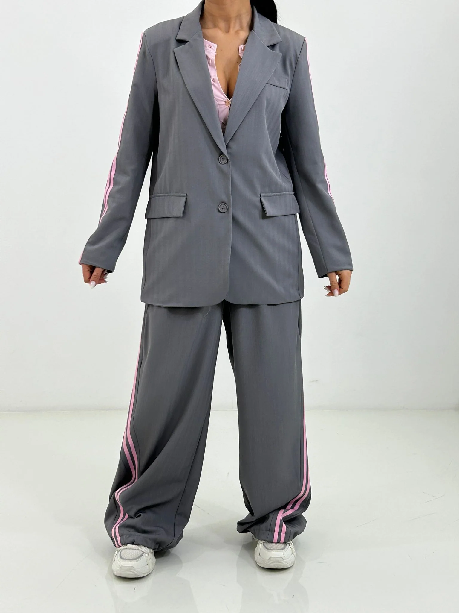 Coordinato con stripe laterali giacca con bottoni(internofoderata) e pantalone con elastico in vita e tasche