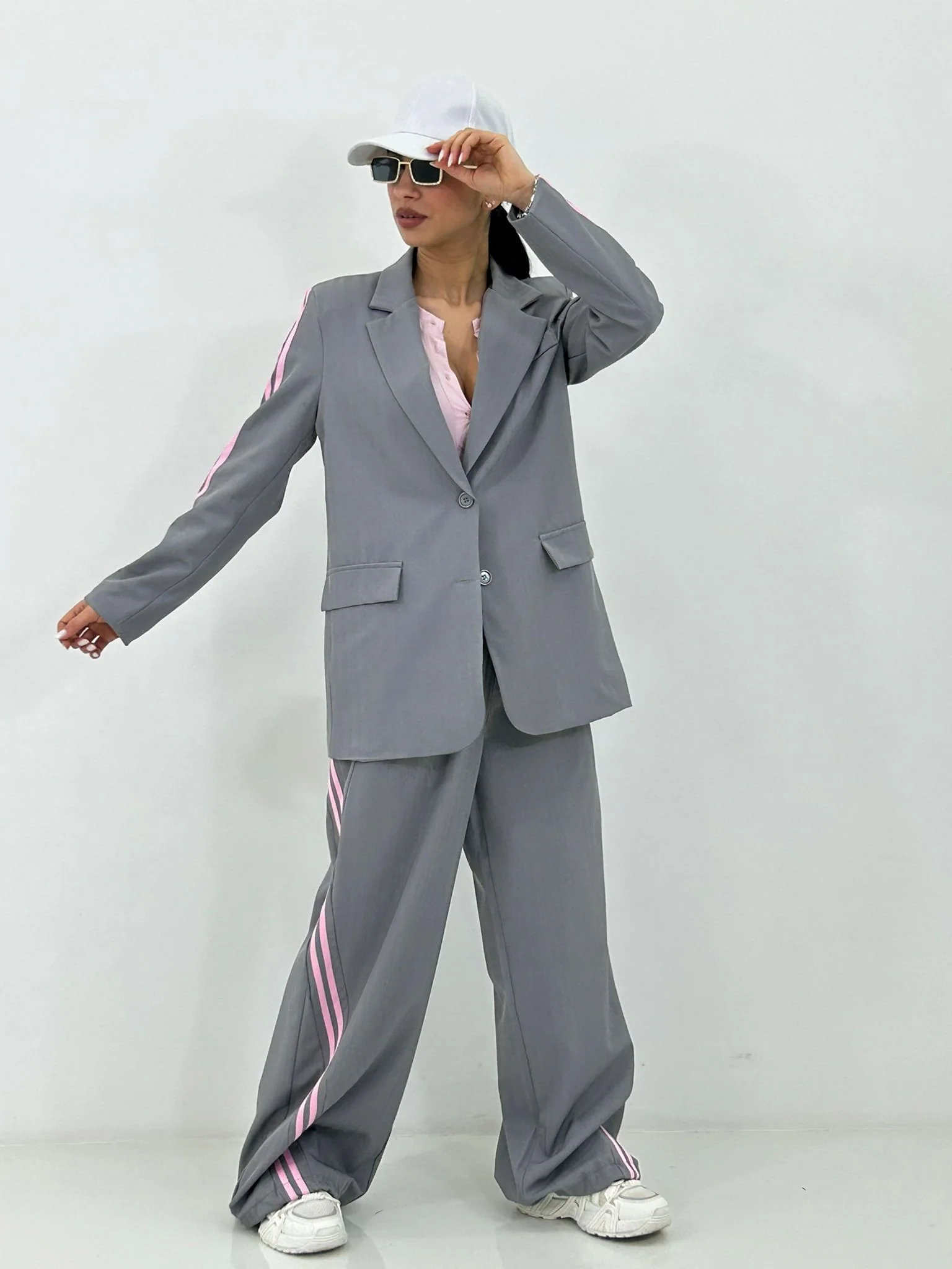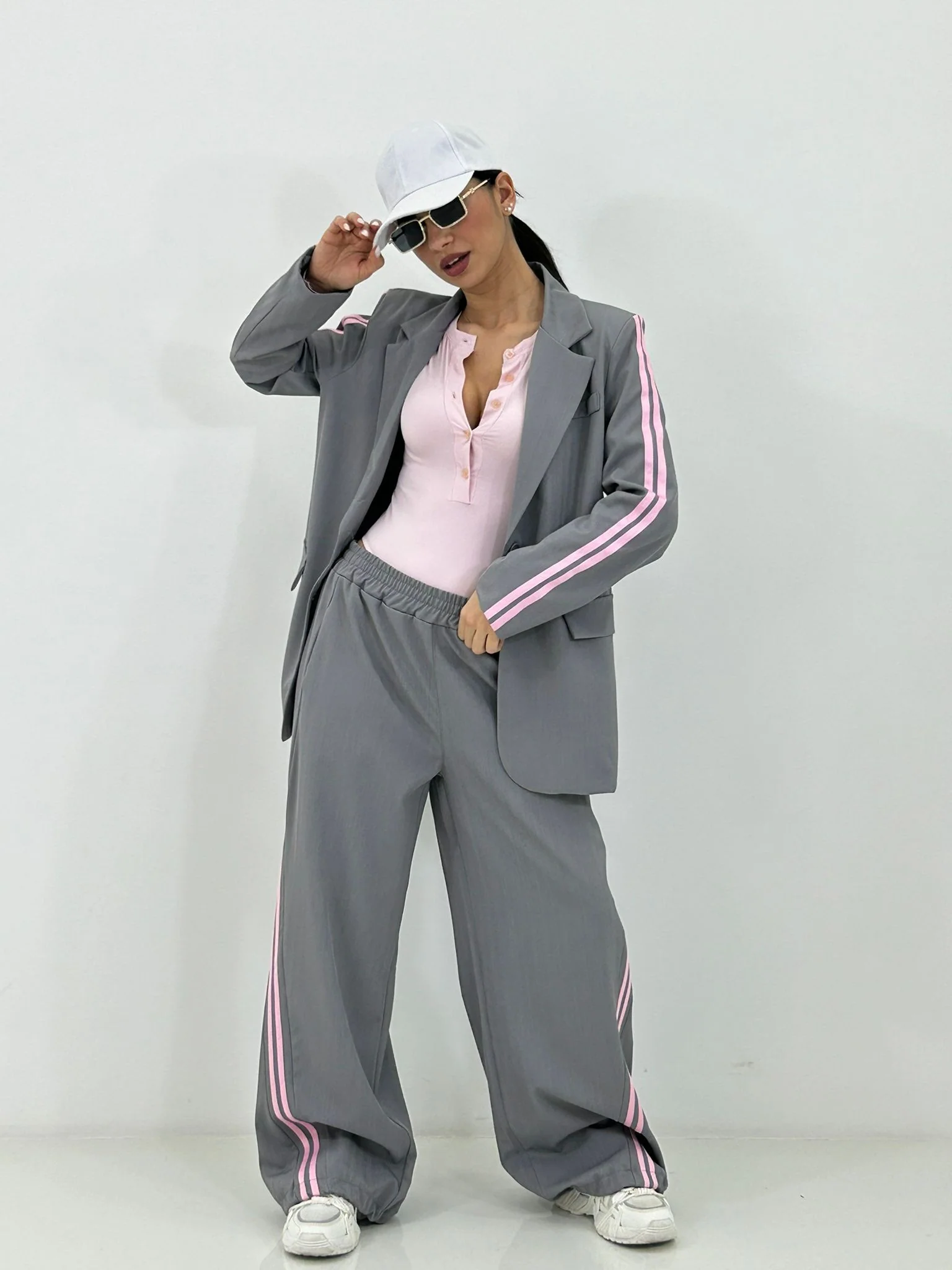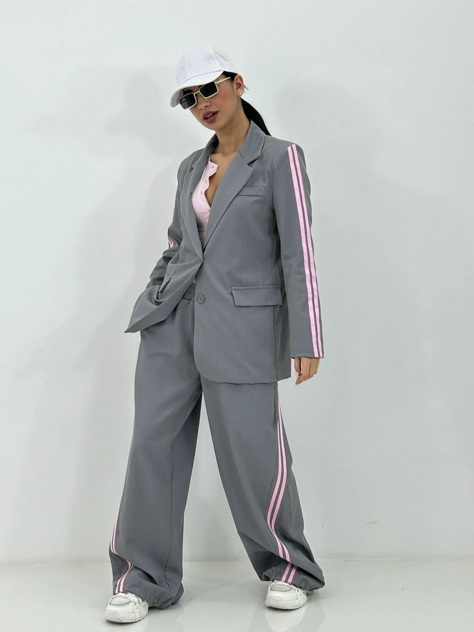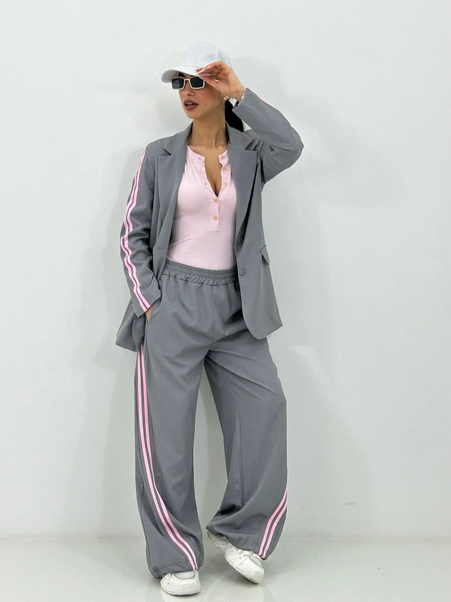 Coordinato con stripe laterali giacca con bottoni(internofoderata) e pantalone con elastico in vita e tasche