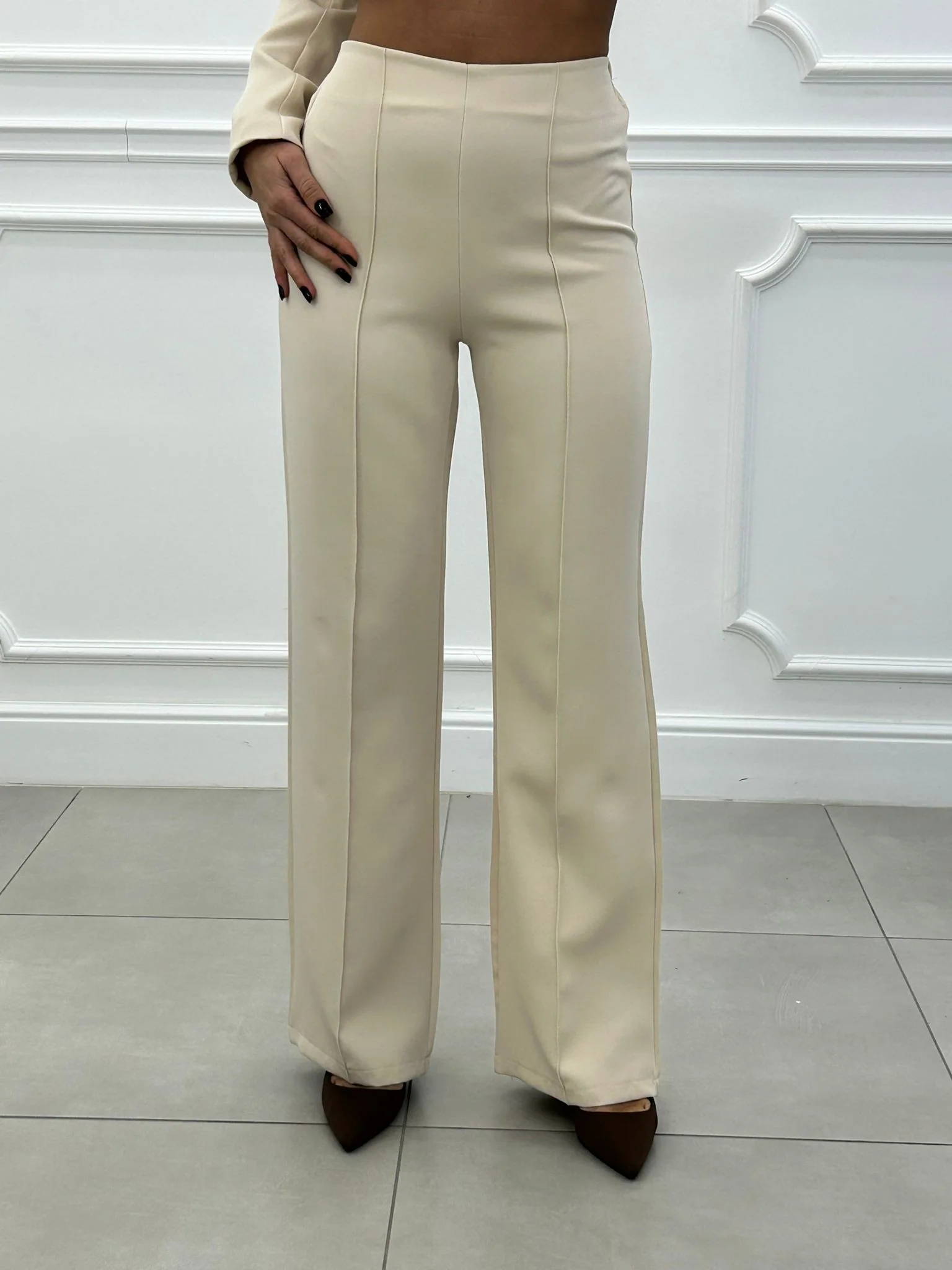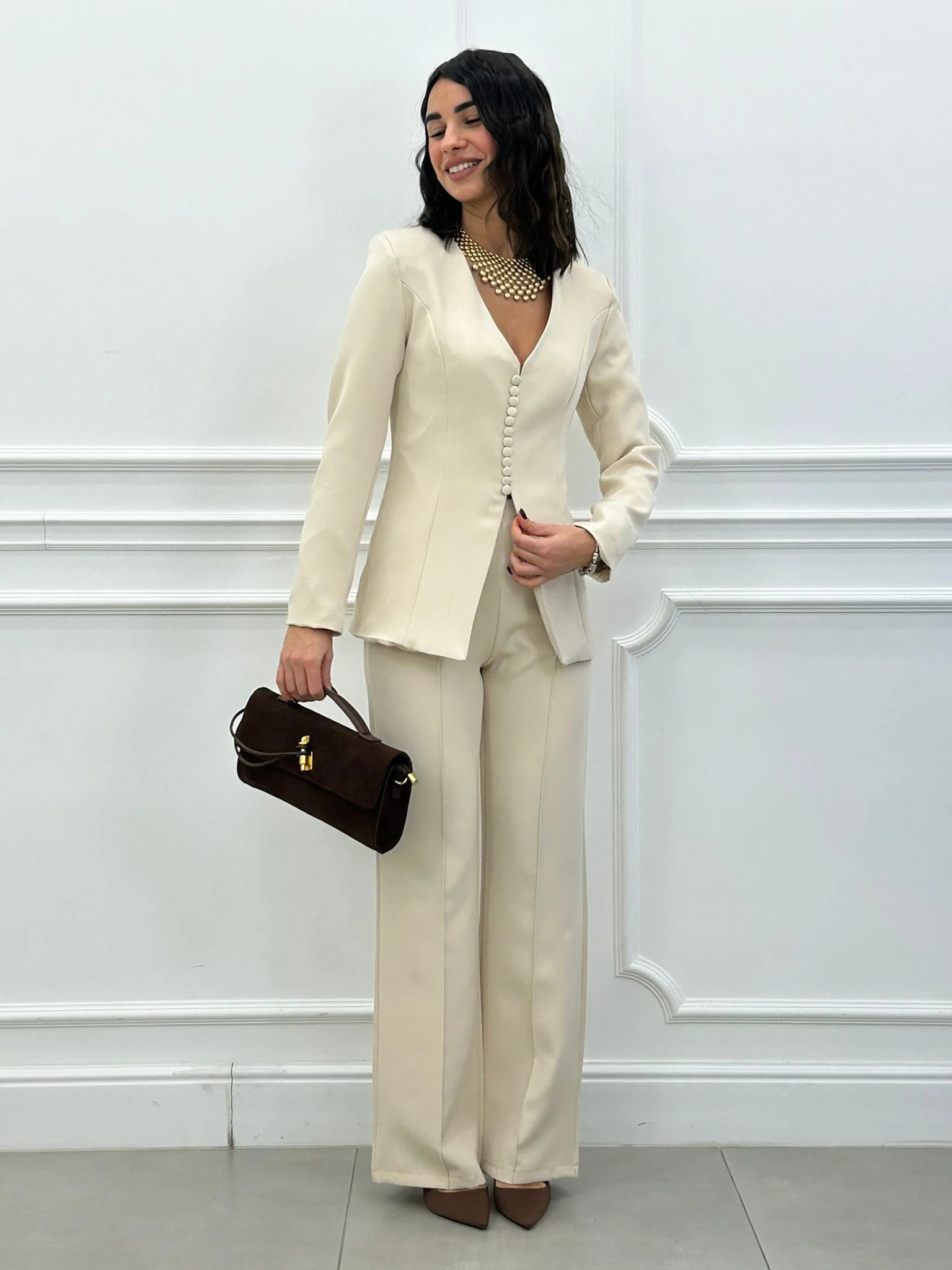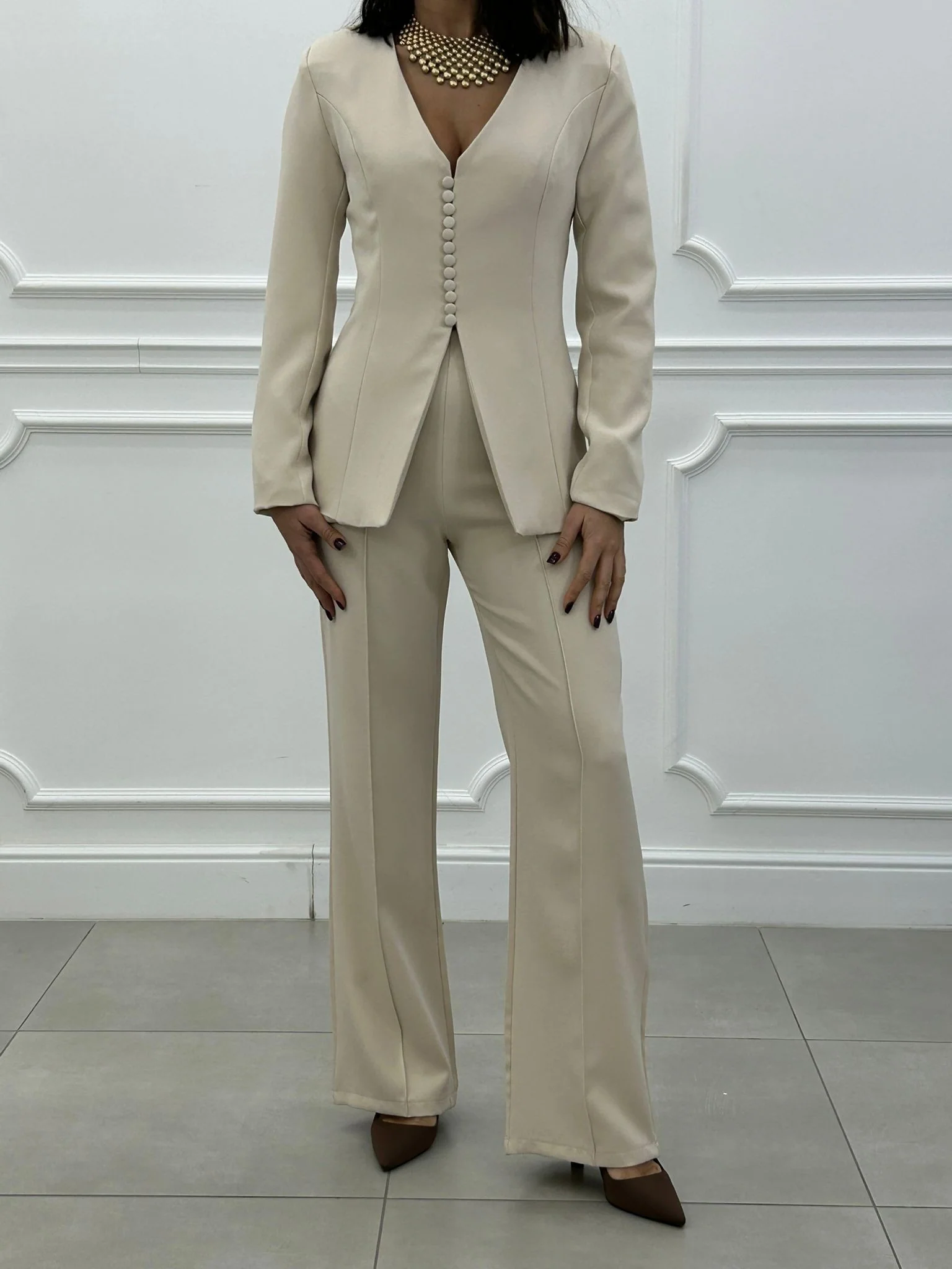 Coordinato, giacca con bottoncini e spalline (interno foderata), pantalone vita alta con elastico in vita