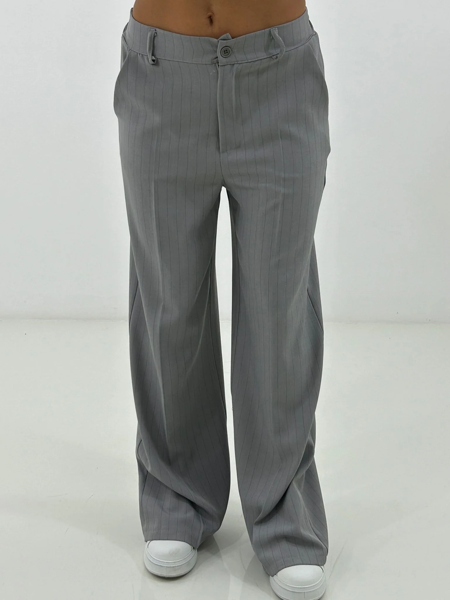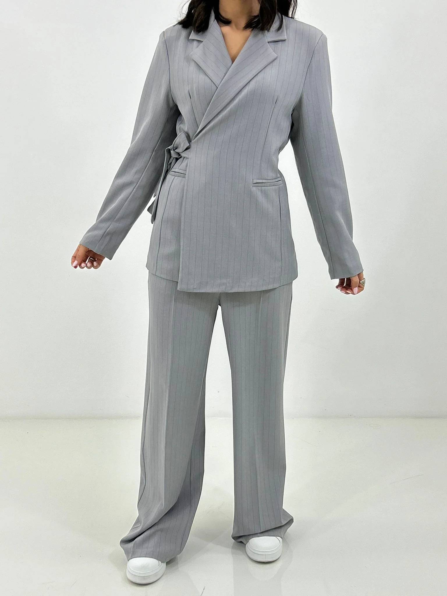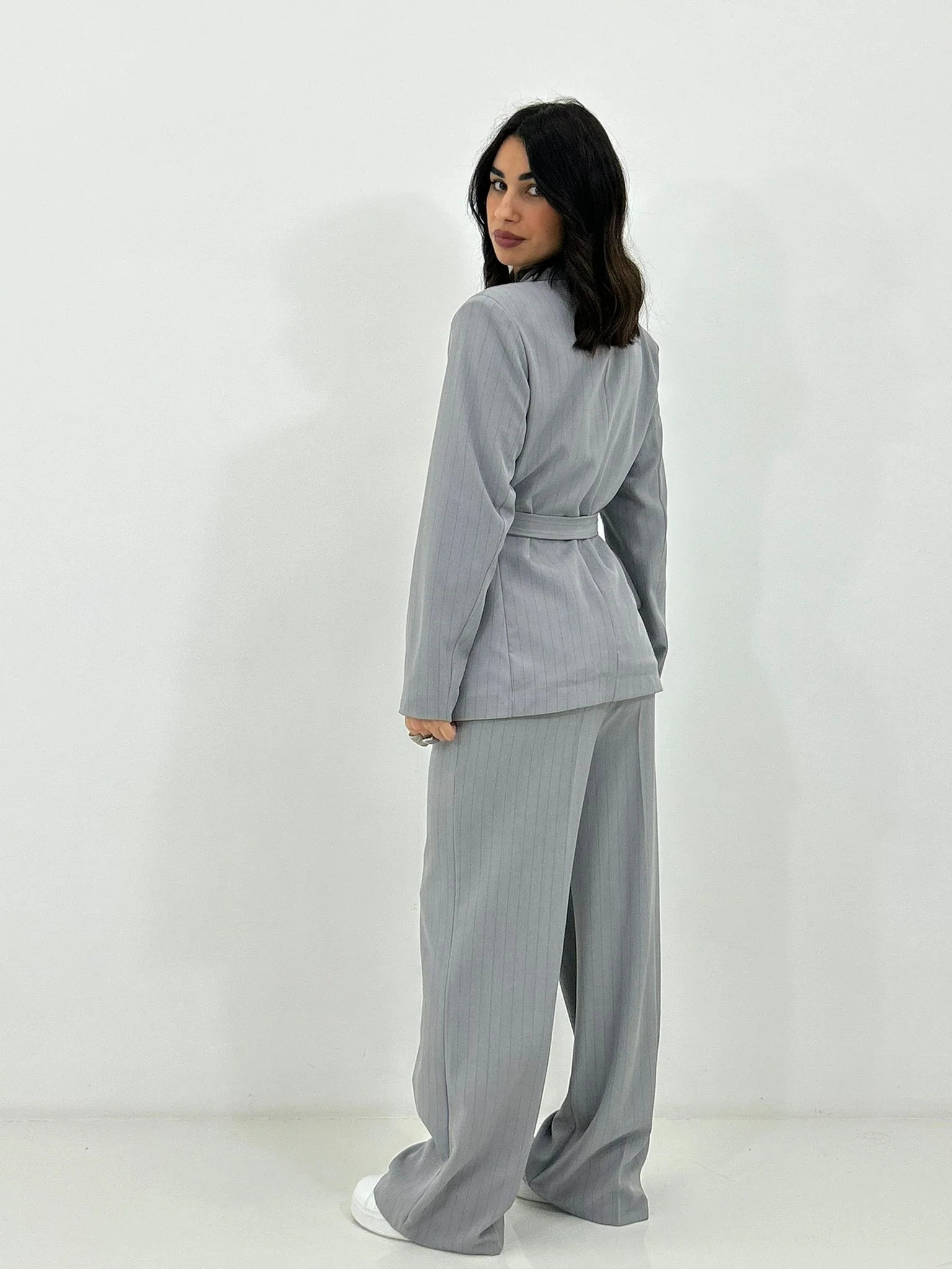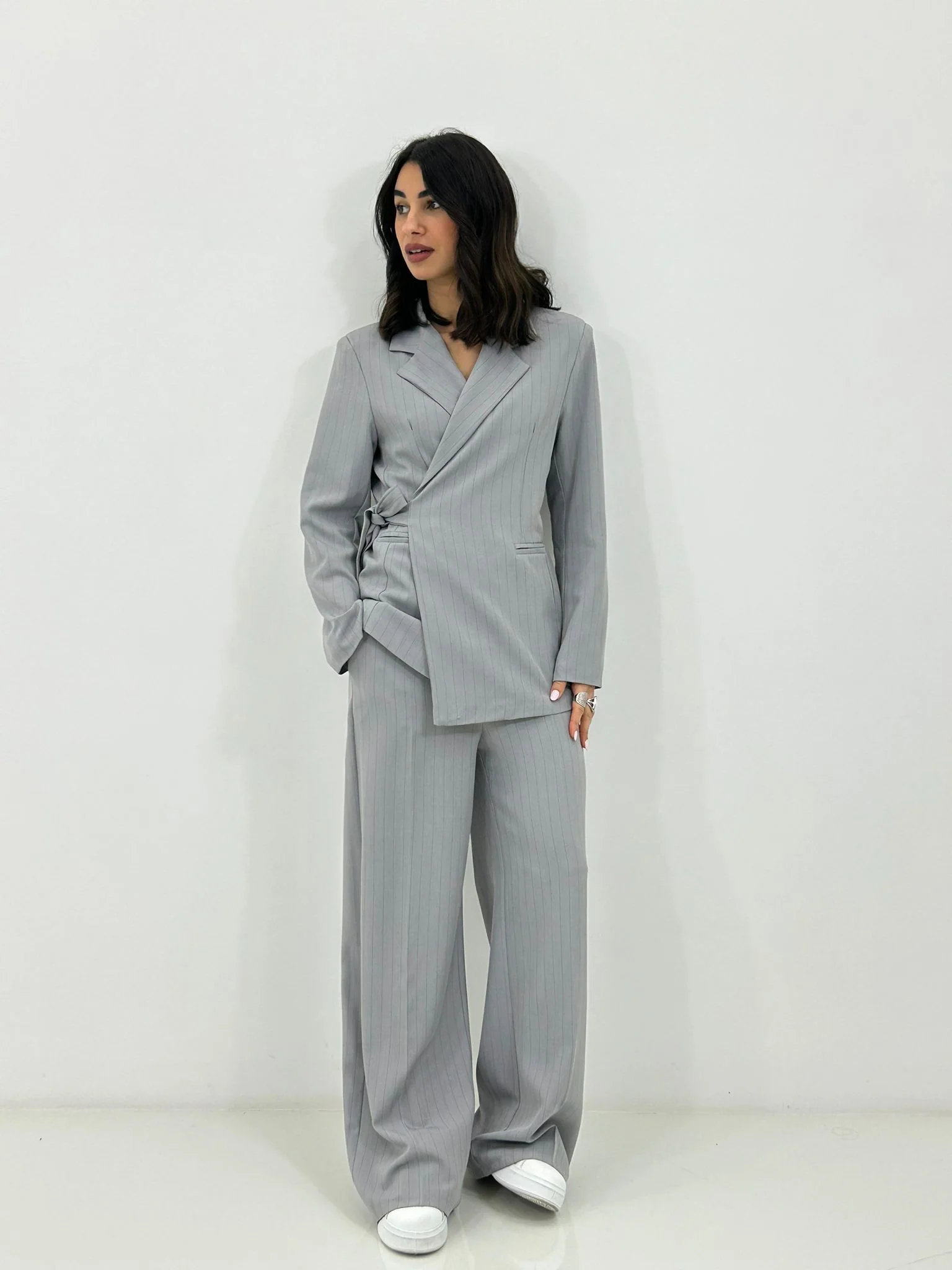 Coordinato gessato giacca con spalline e fiocco laterale , interno foderata , pantalone con tasche