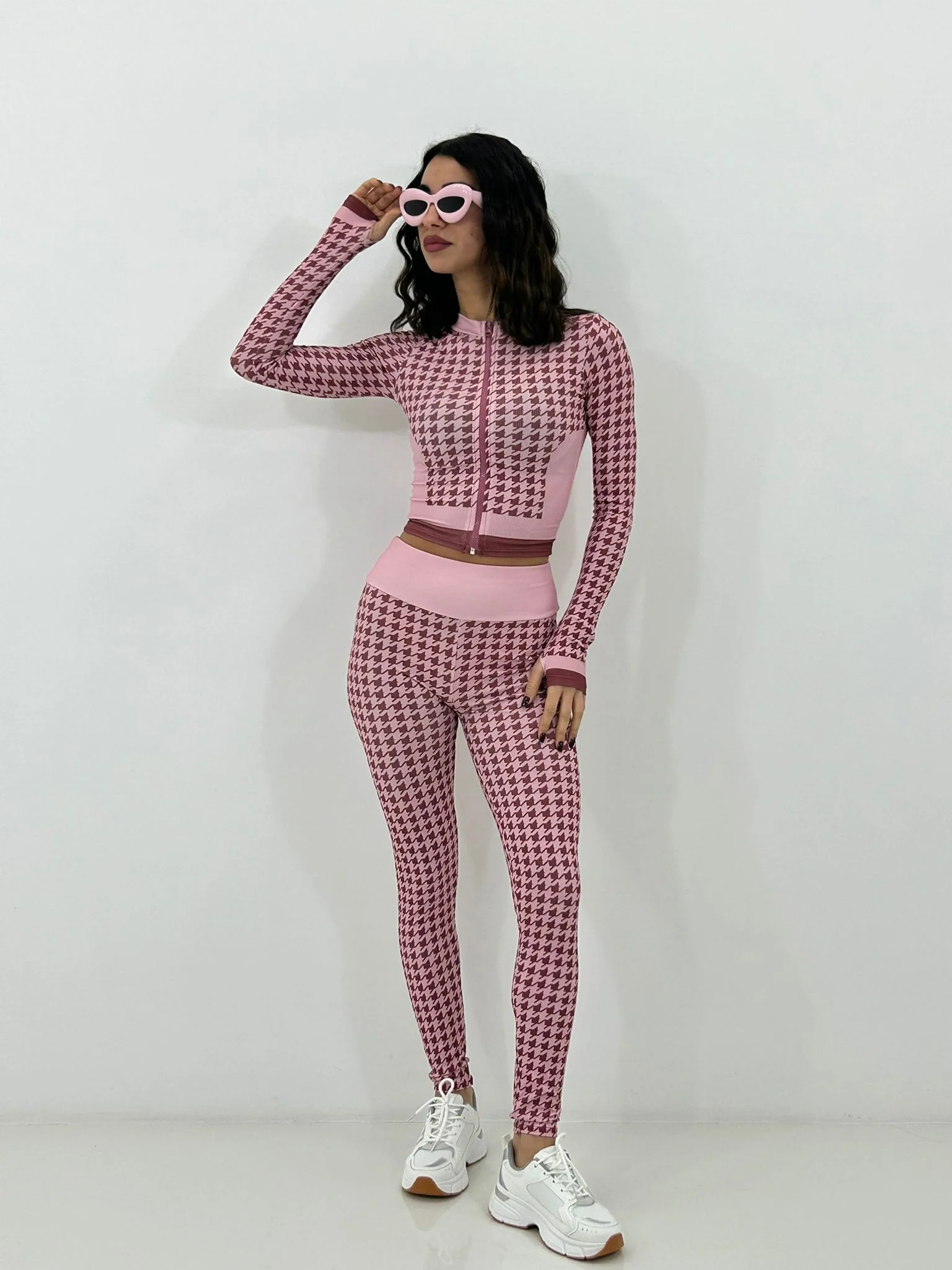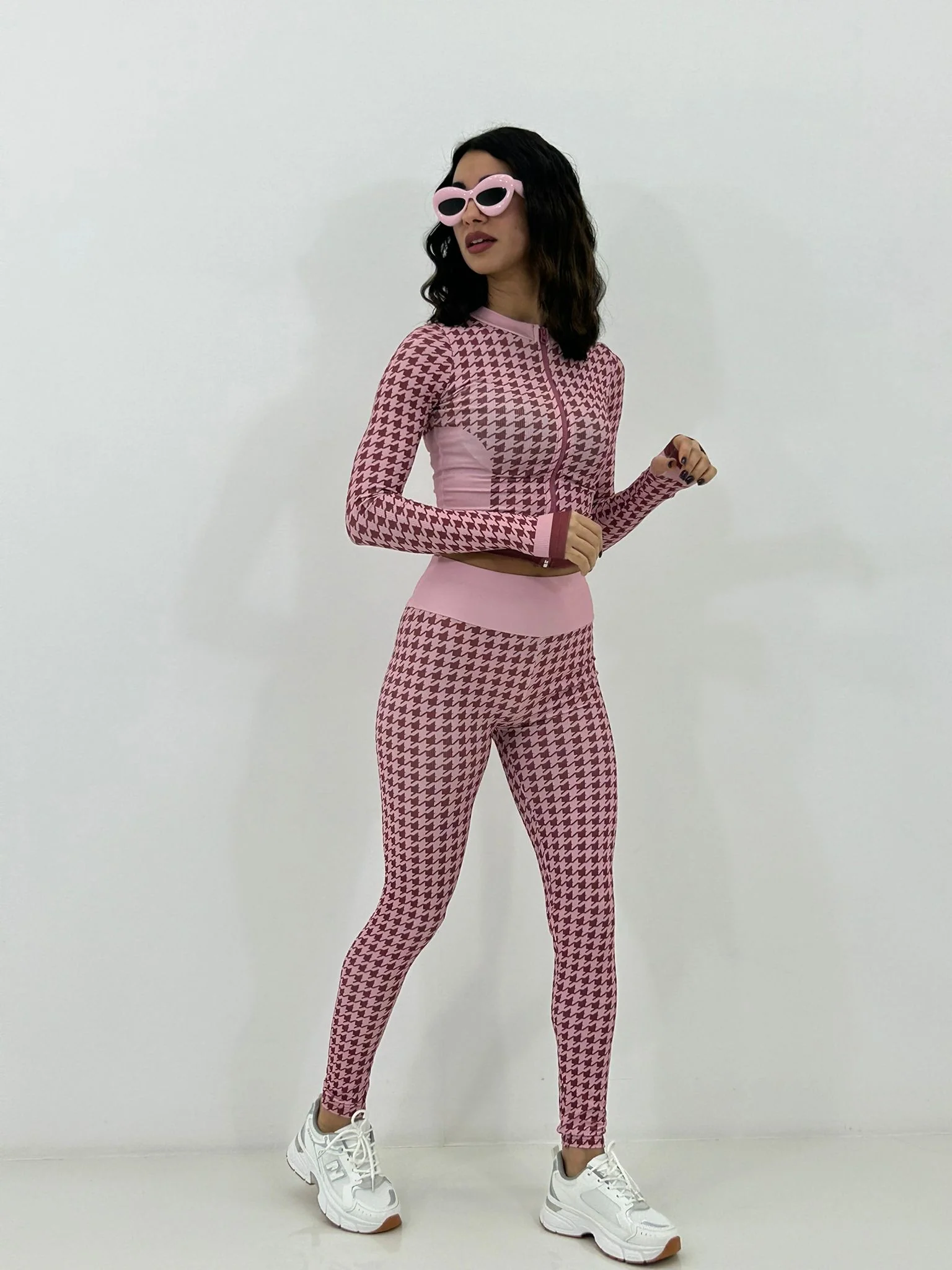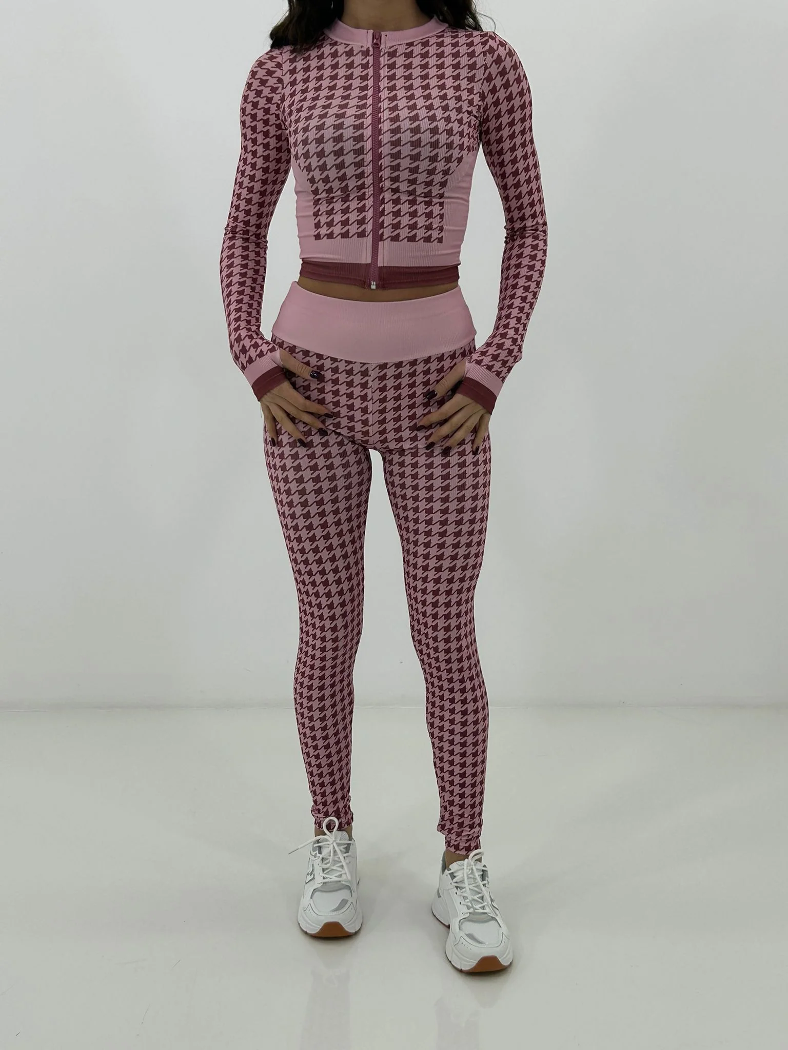 Coordinato fitness trama pied de poul ,felpina con zip e leggins vita alta