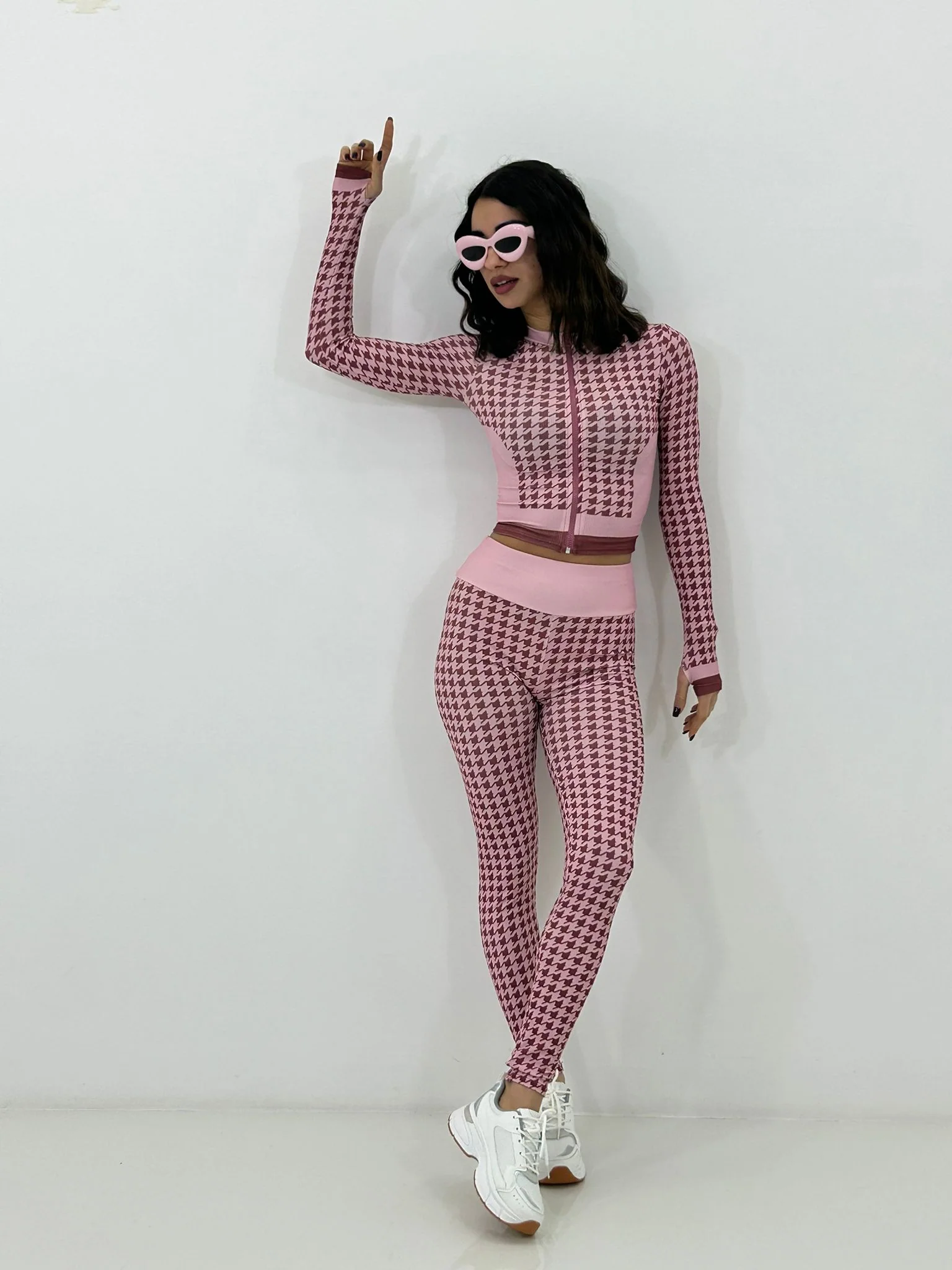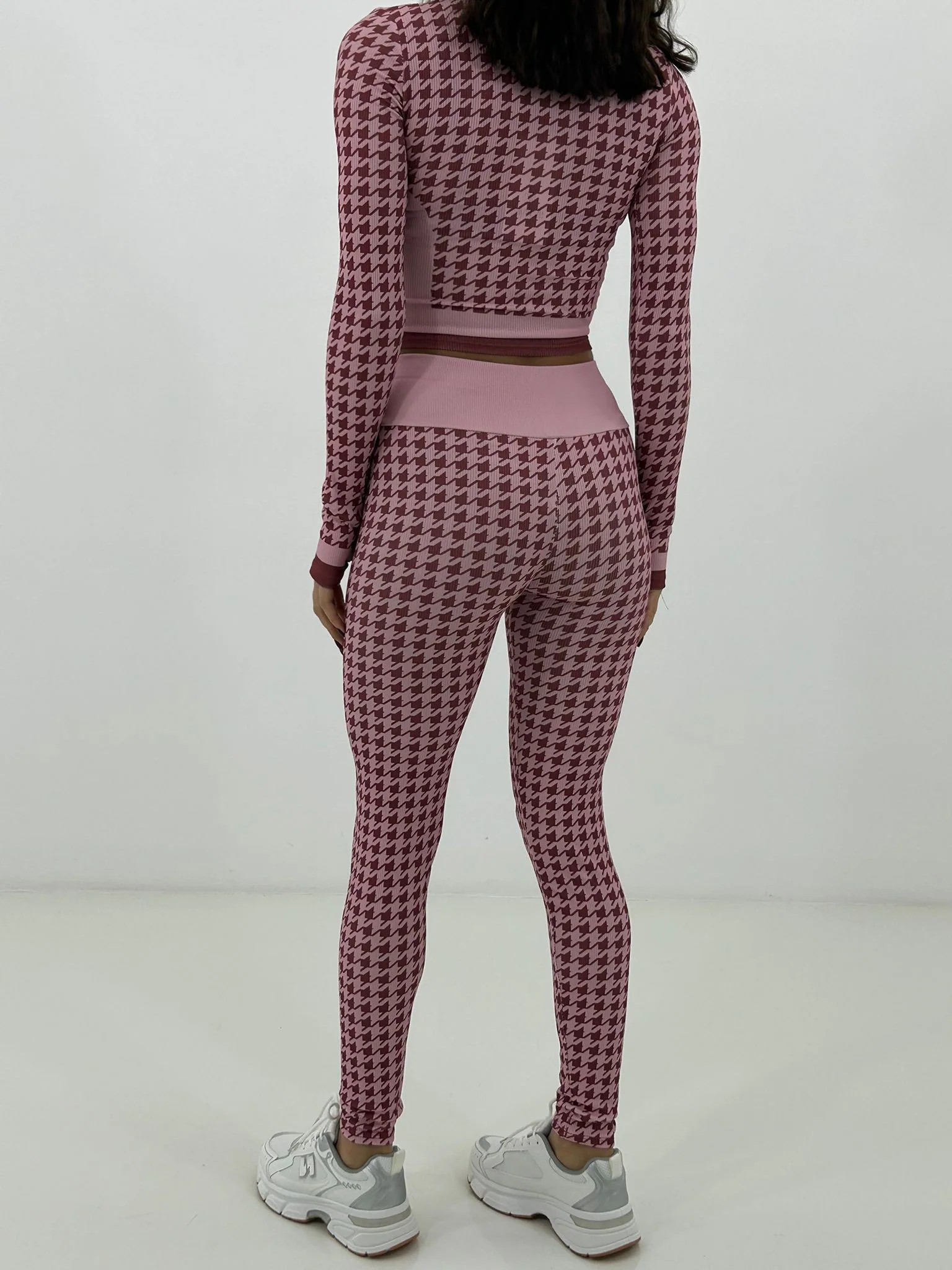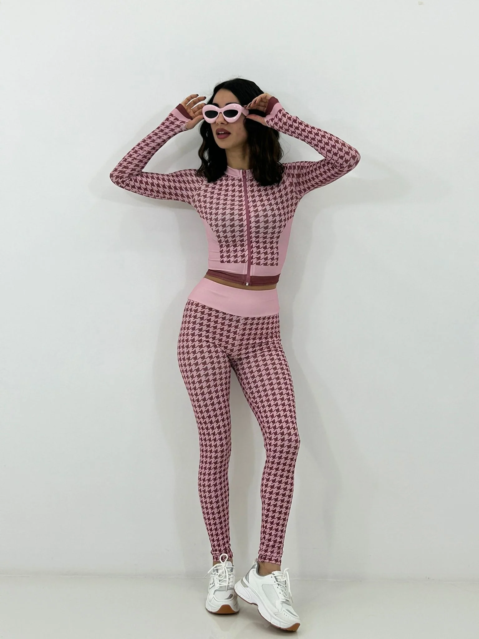 Coordinato fitness trama pied de poul ,felpina con zip e leggins vita alta