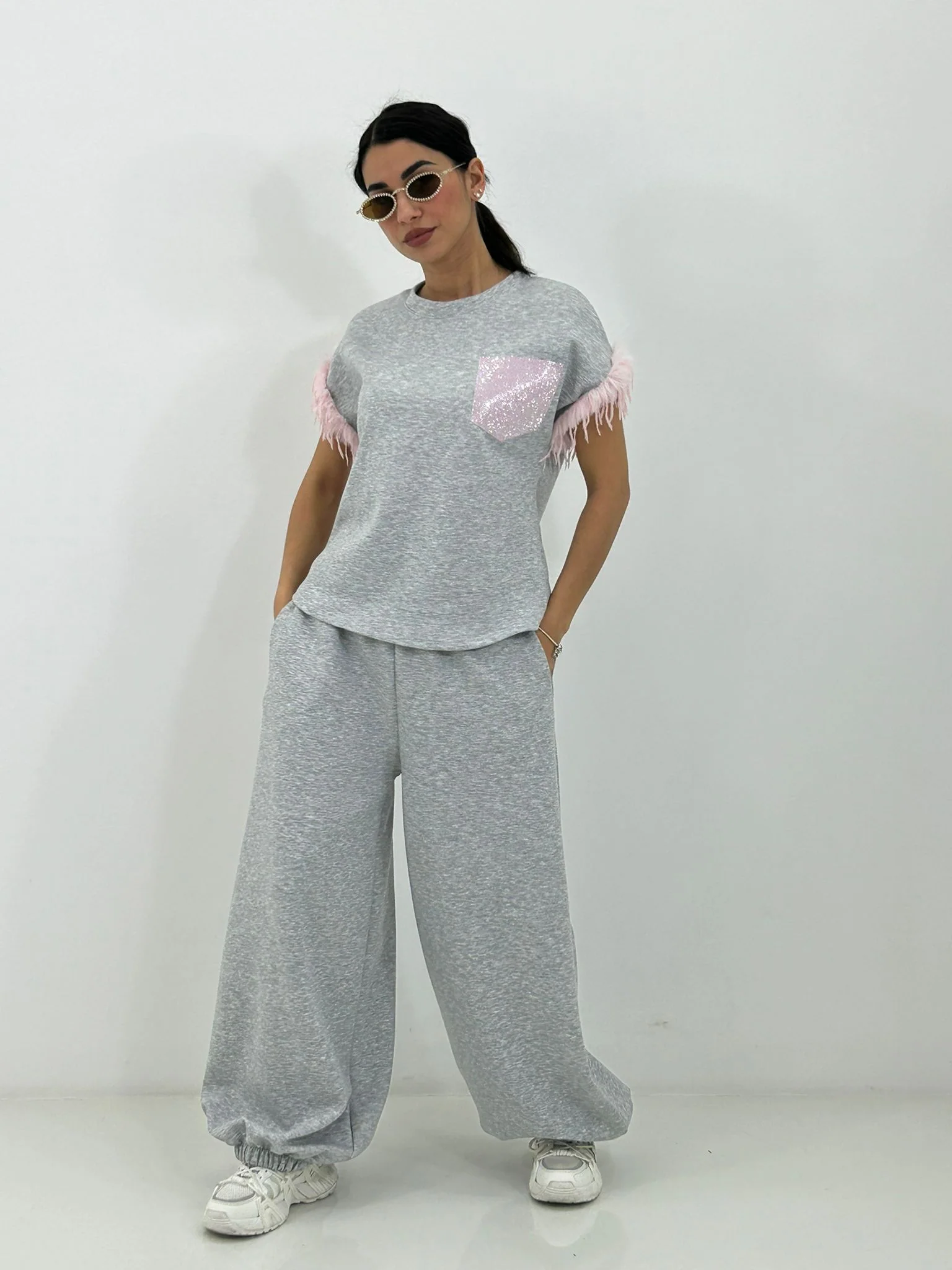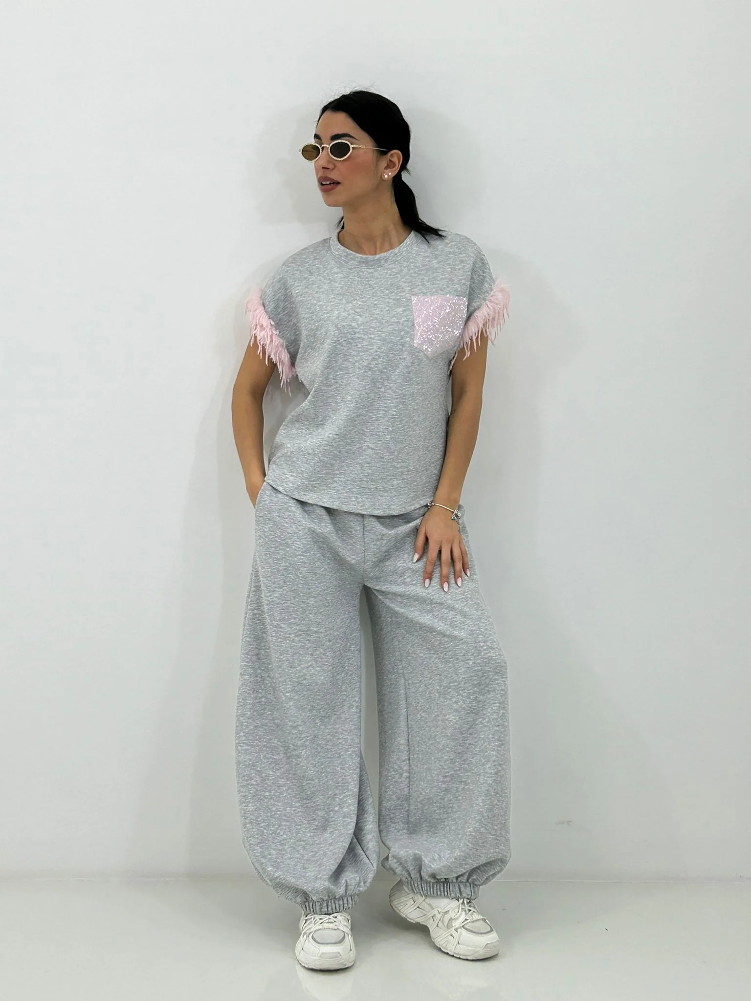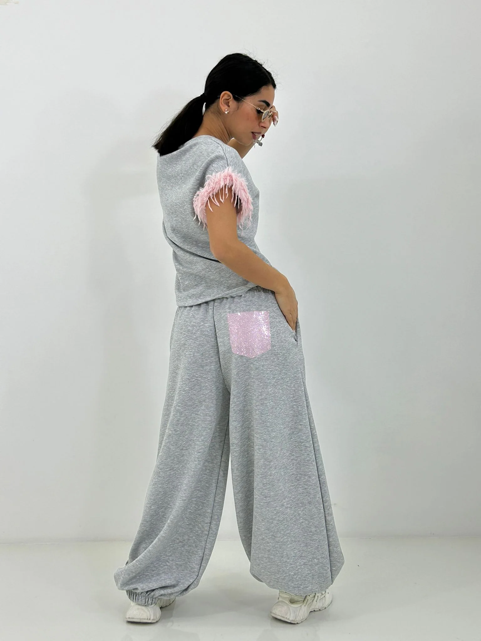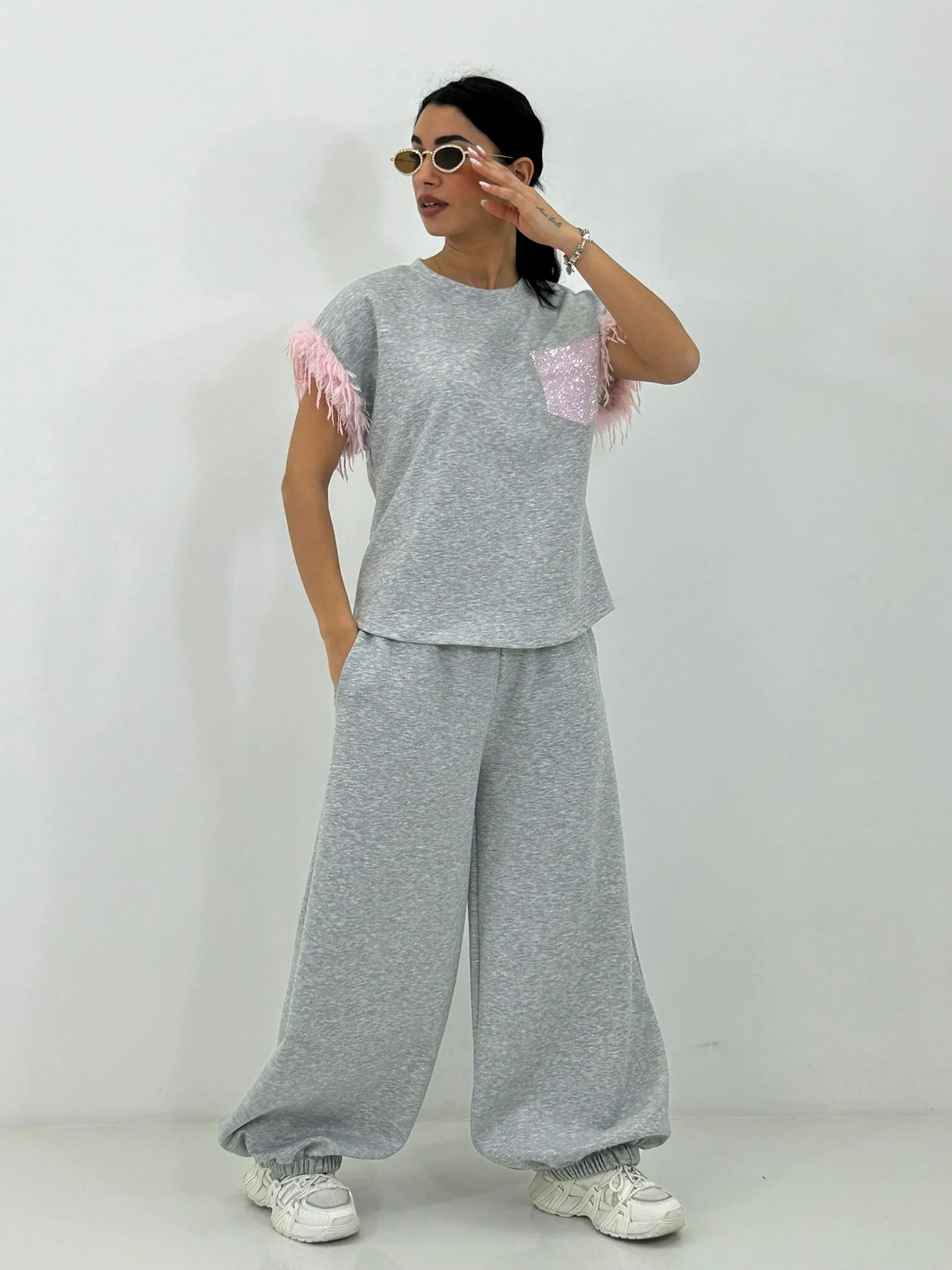 Coordinato tuta con maglia maniche piume e pantalone tasca strass sul retro , coulisse alle caviglie