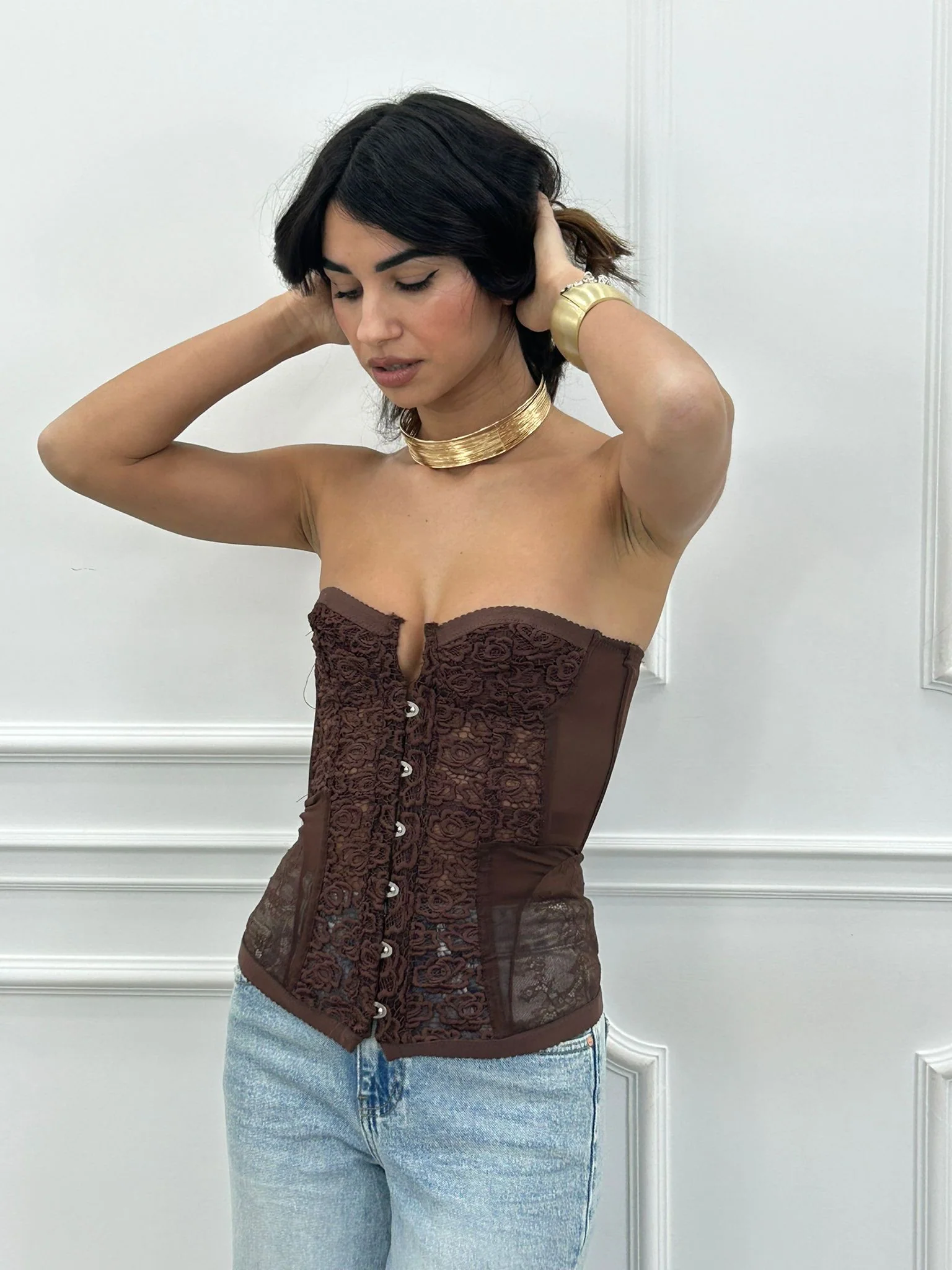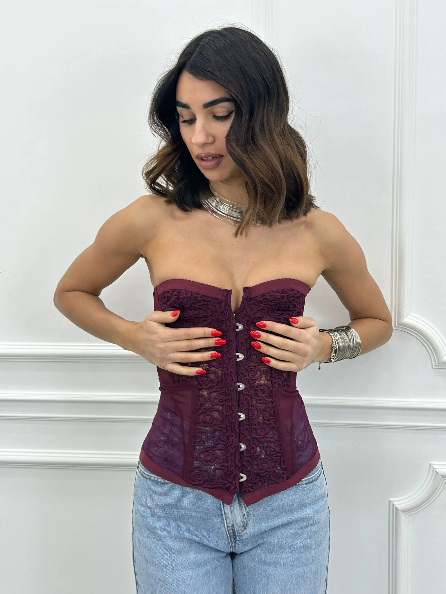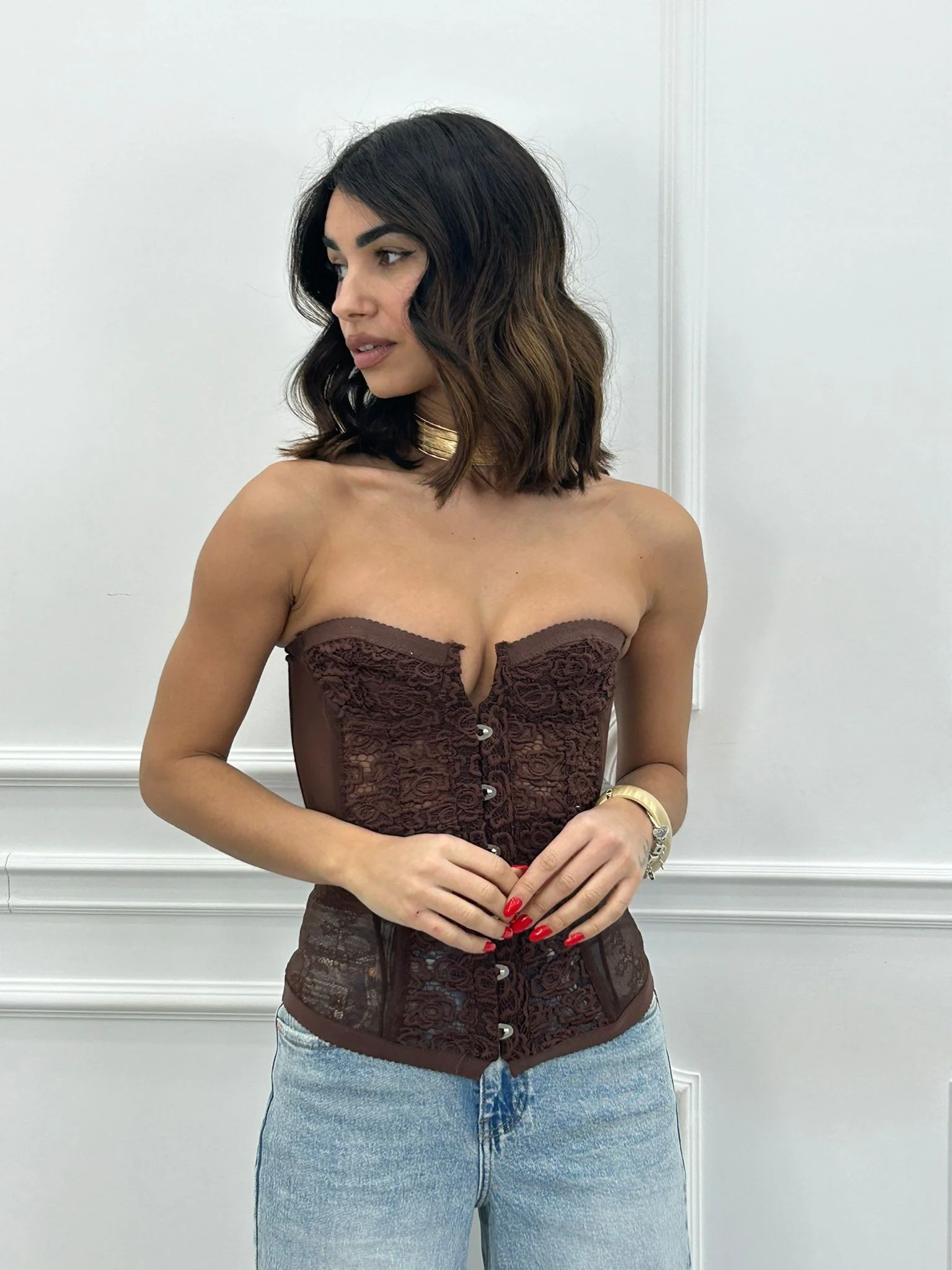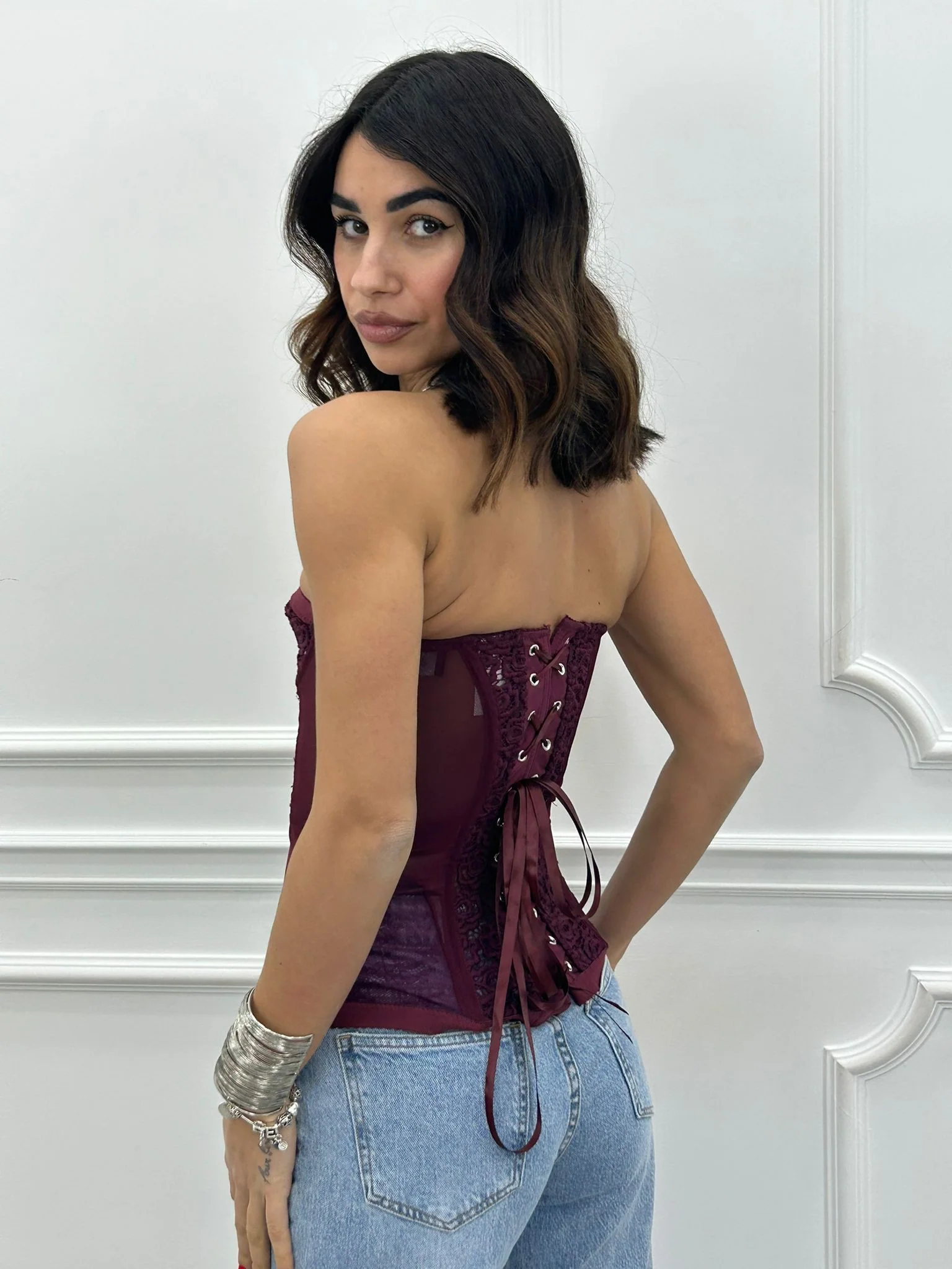 Corpetto velato con dettagli in pizzo ,stringhe posteriori