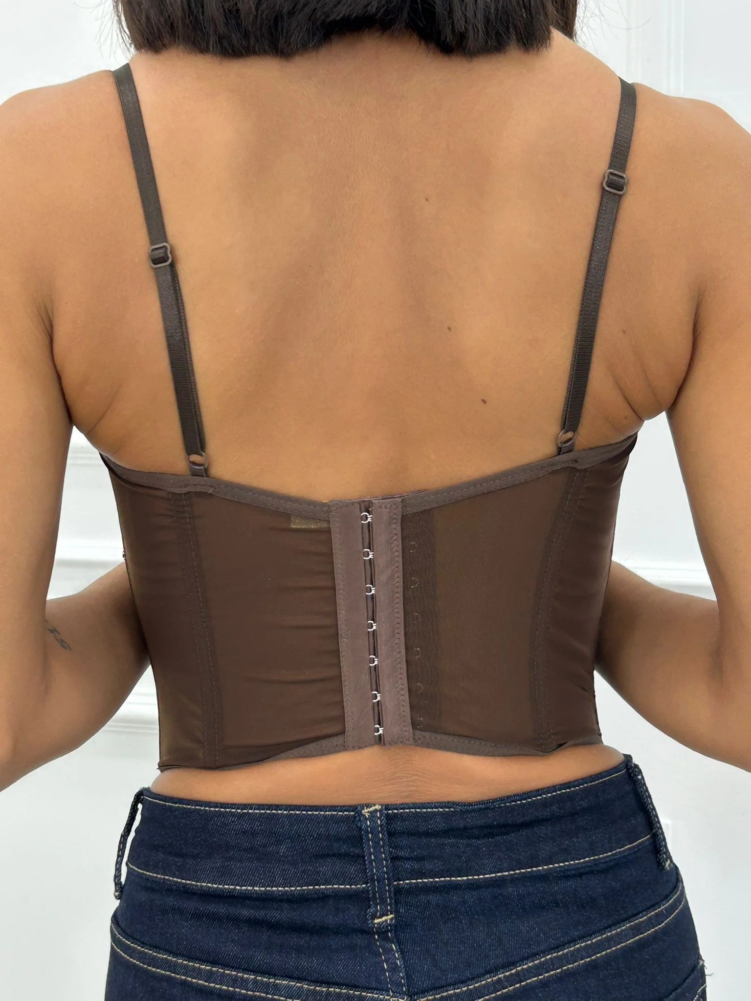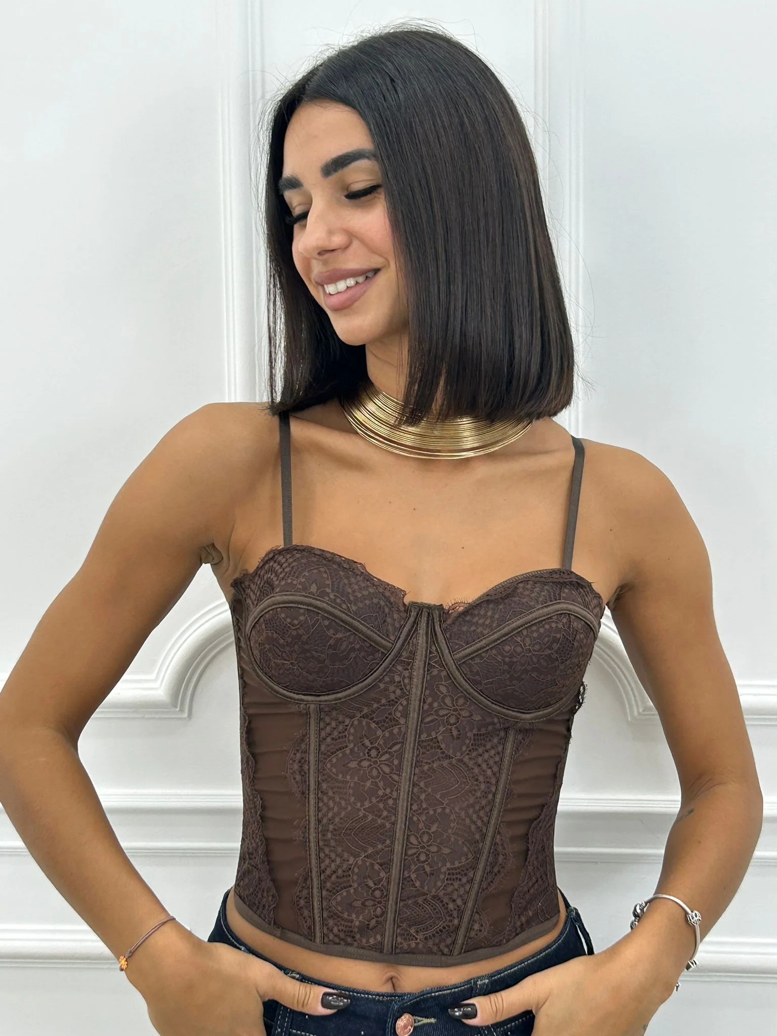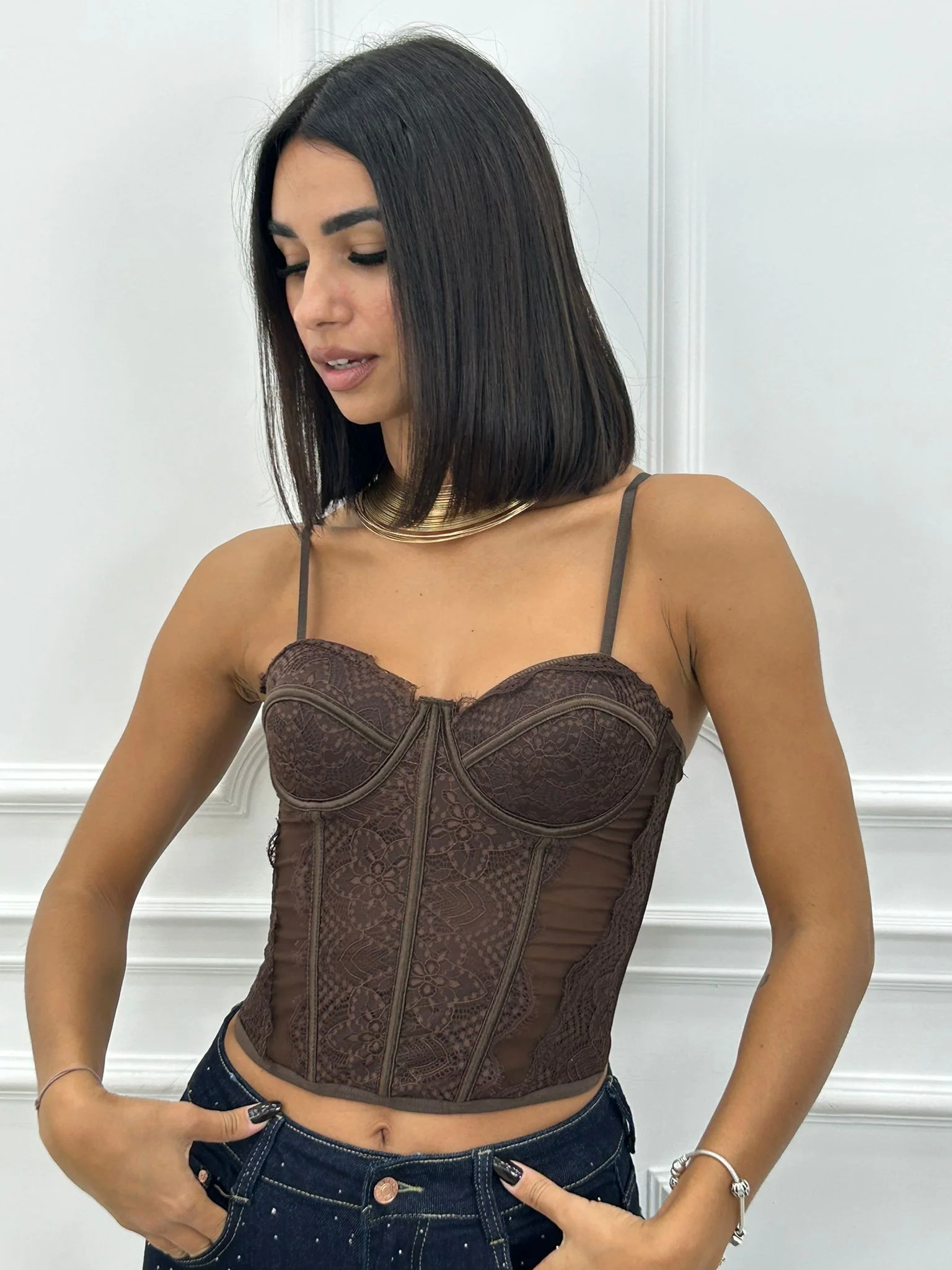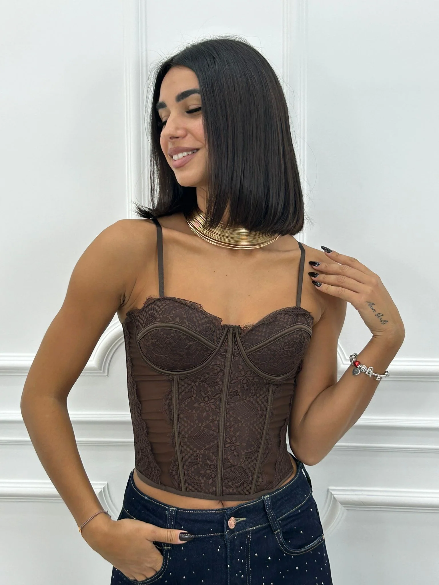 Corpetto in pizzo velato , con coppe al seno e bretelline regolabili