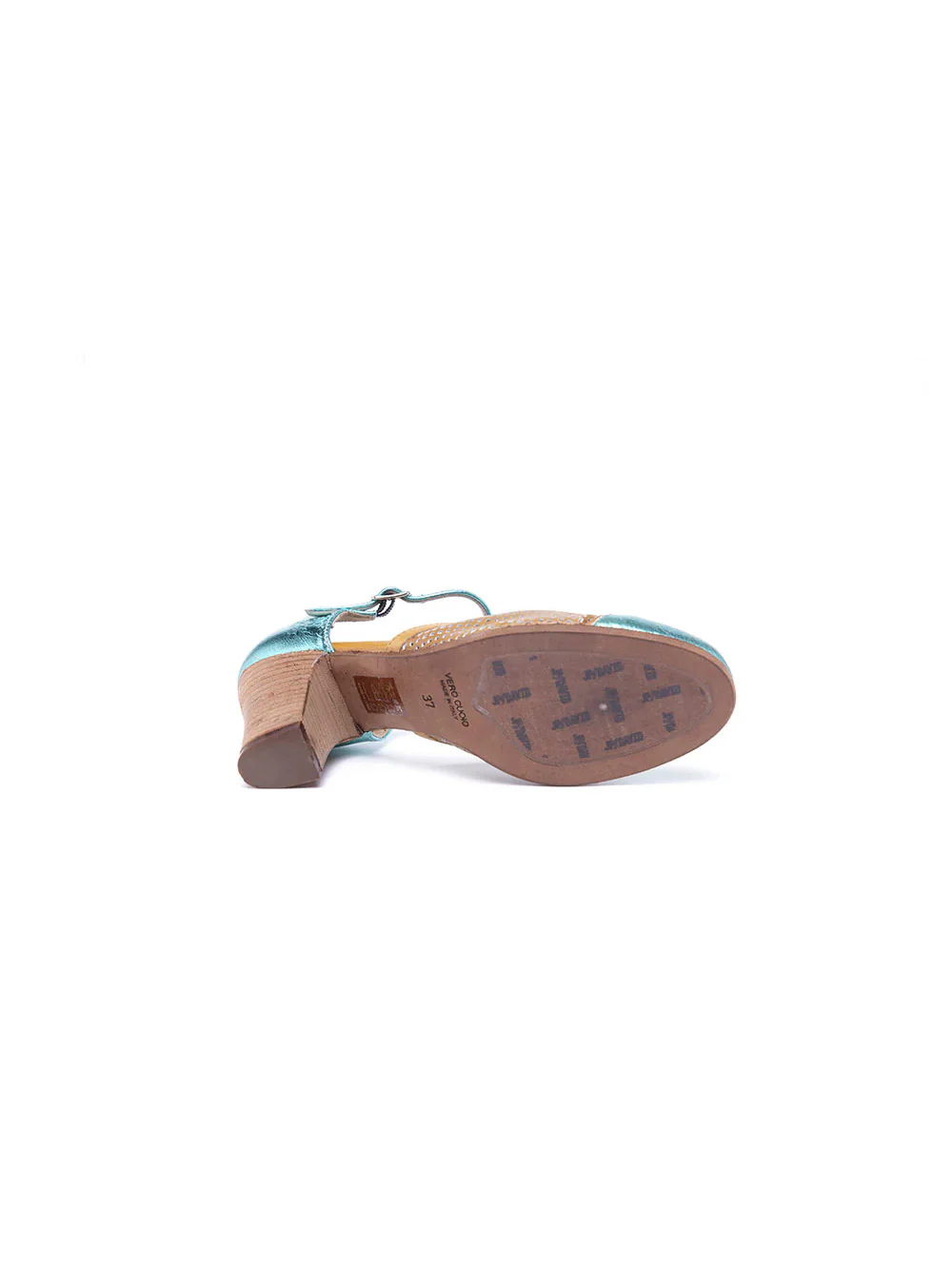 Decolleté da donna di agnello tinta a mano, color ocra più smeraldo, con calzata regolare ideale per la primavera/estate.