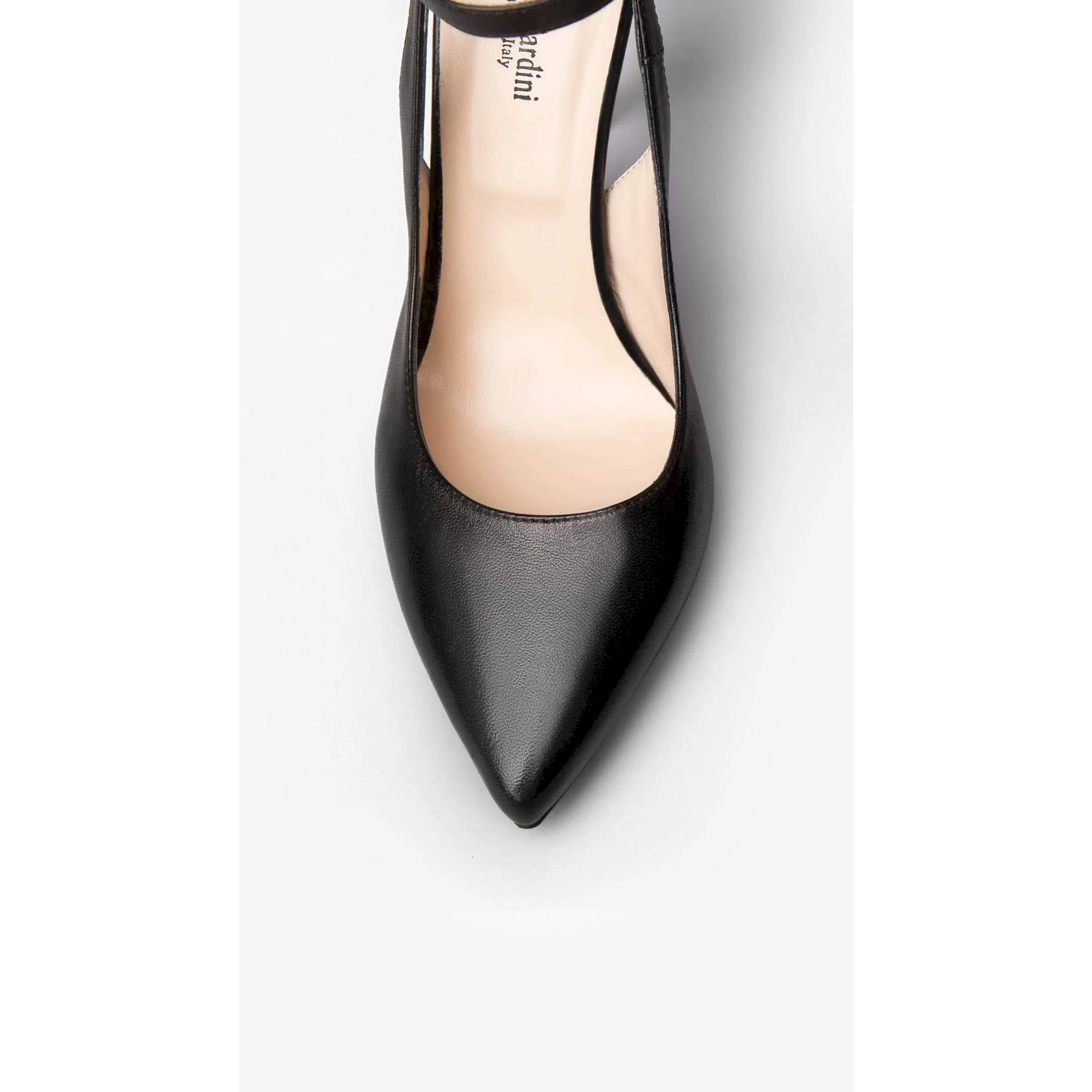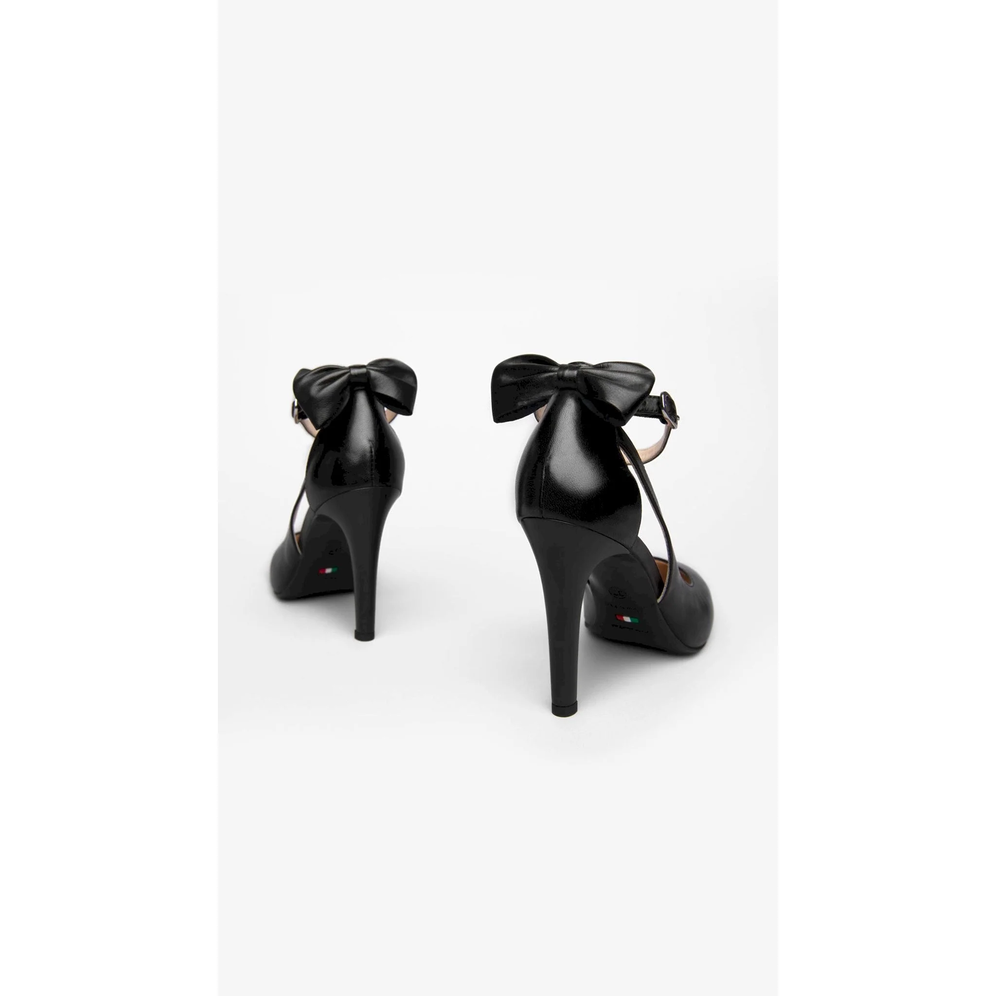 Decolte’ in morbida nappa con fiocco posizionato nella parte posteriore della calzatura , aperture laterali e cinturino alla caviglia .punta affusolata tacco a stiletto cm.10.design raffinato per un look chic e ricercato