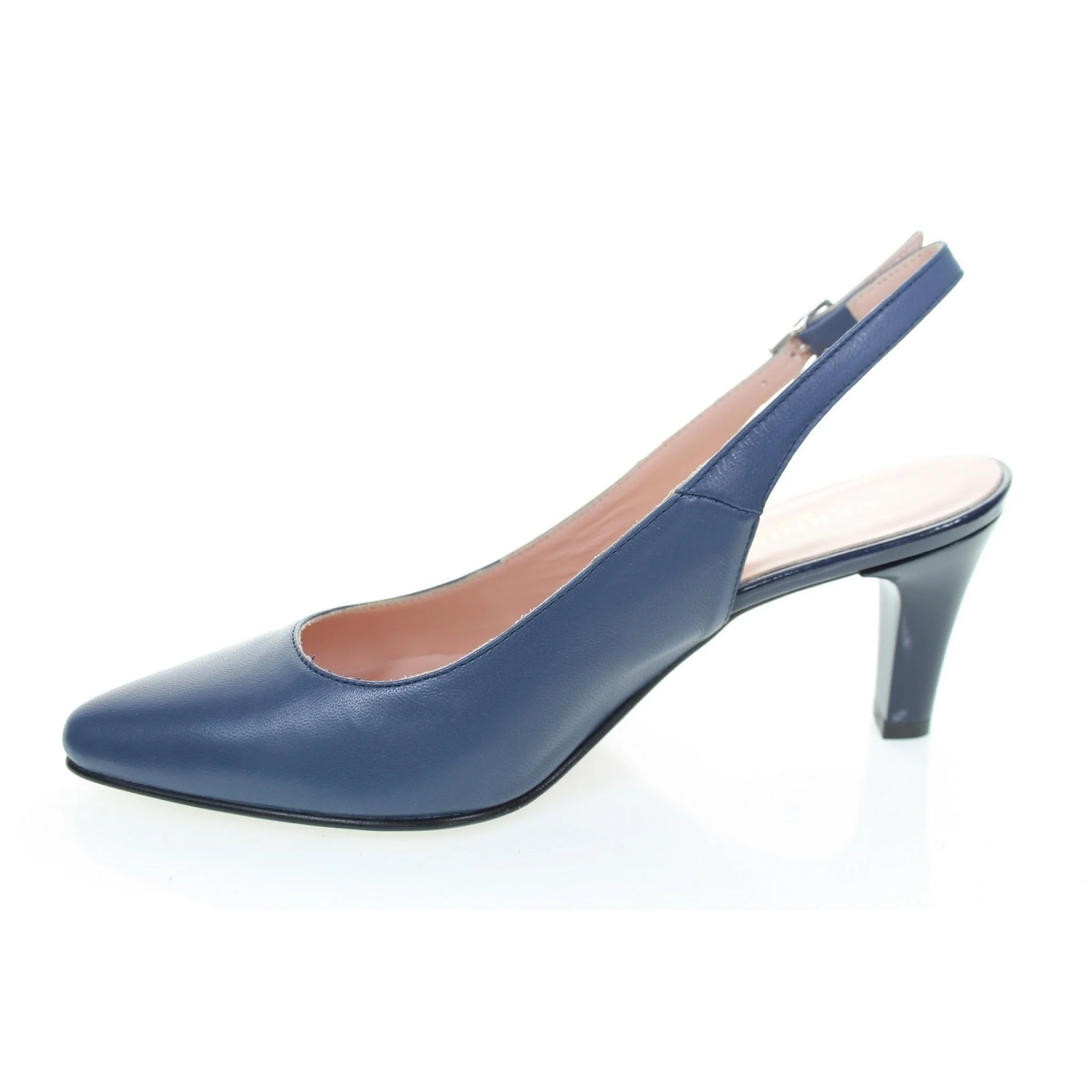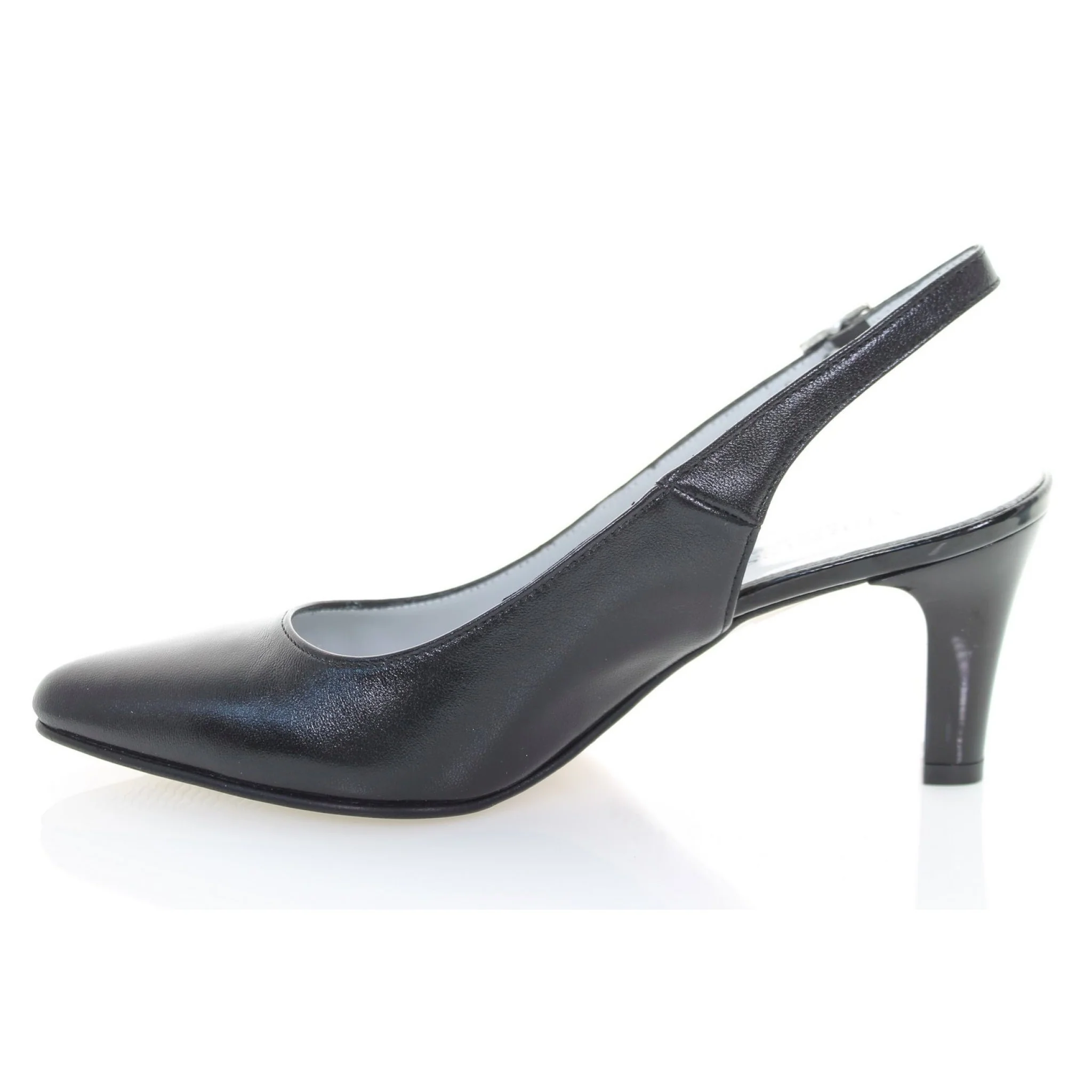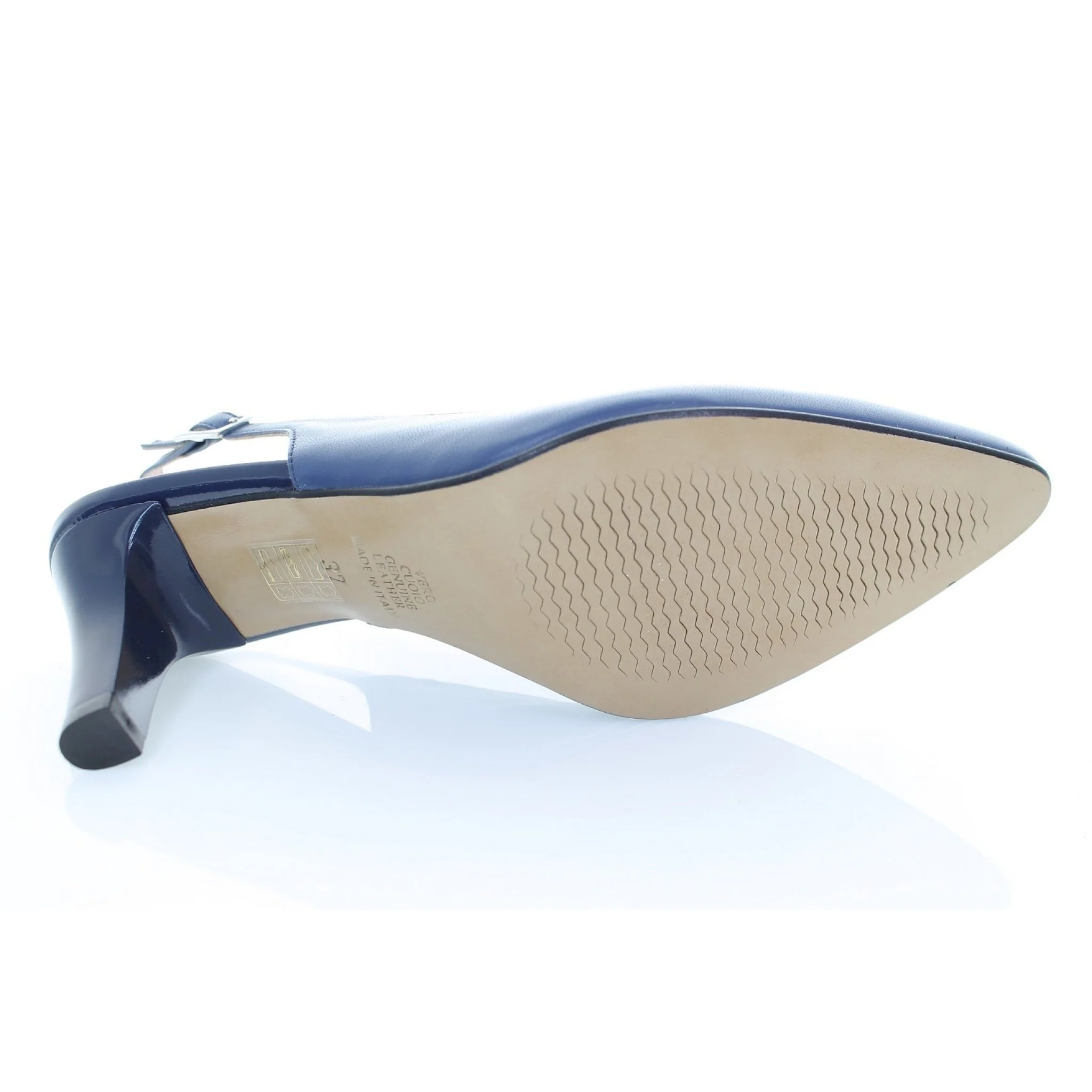 Décolleté in pelle nappata semi aperta, cinturino regolabile con fibbia, fodera e sottopiede pelle, suola in vero cuoio, tacco laccato altezza cm 7,3. made in italy