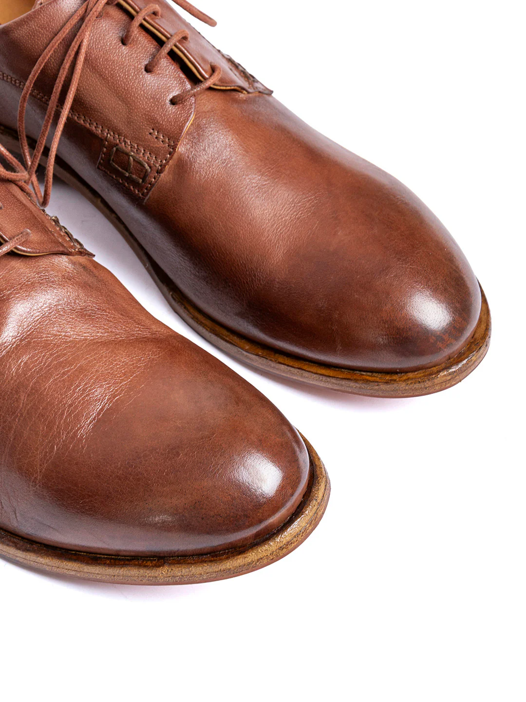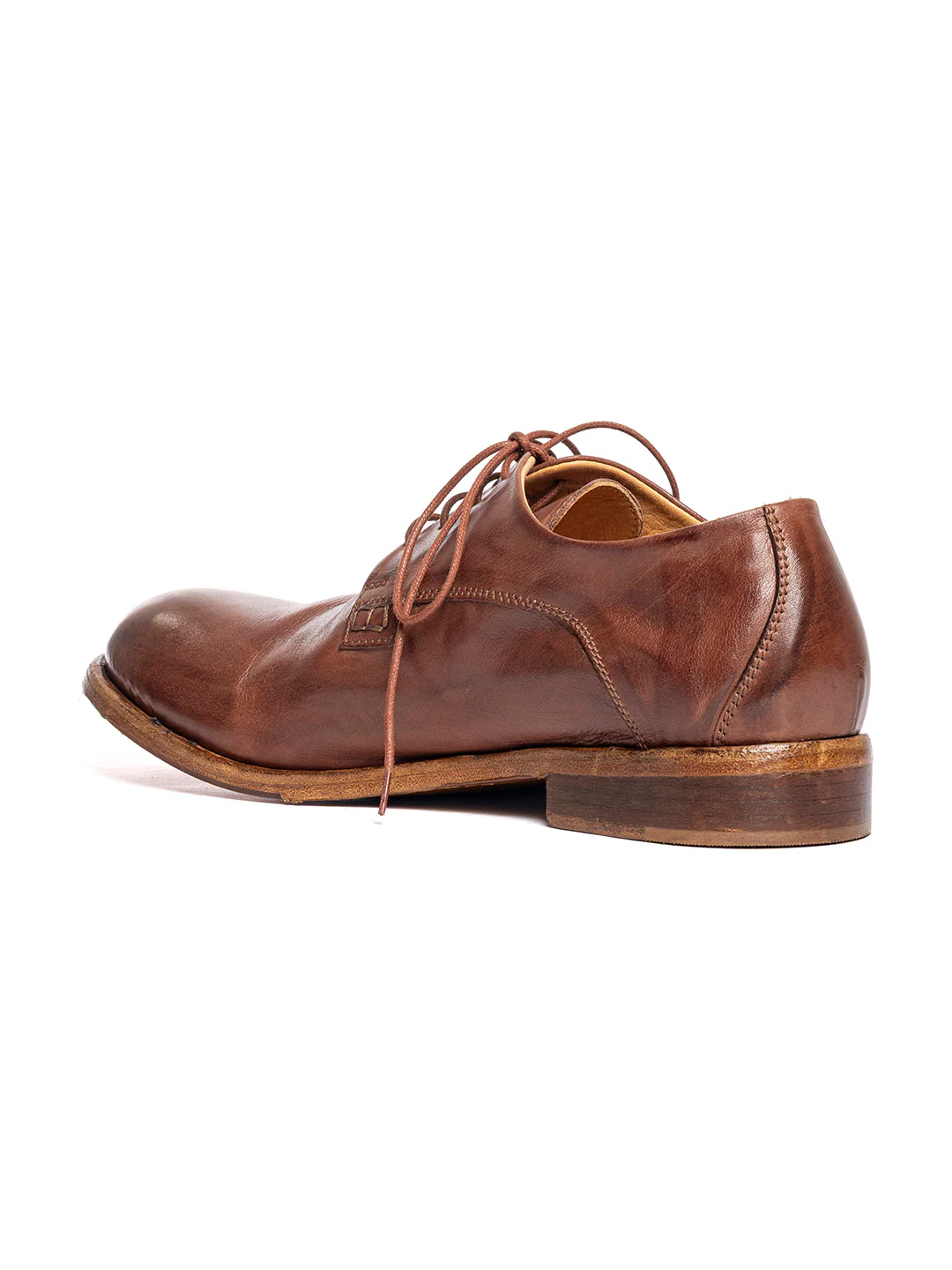Tipo di lavorazione: pellame in vitellino tinto in botte, tirato e spazzolato. La suola è fissata alla tomaia tramite la cucitura «Blake»