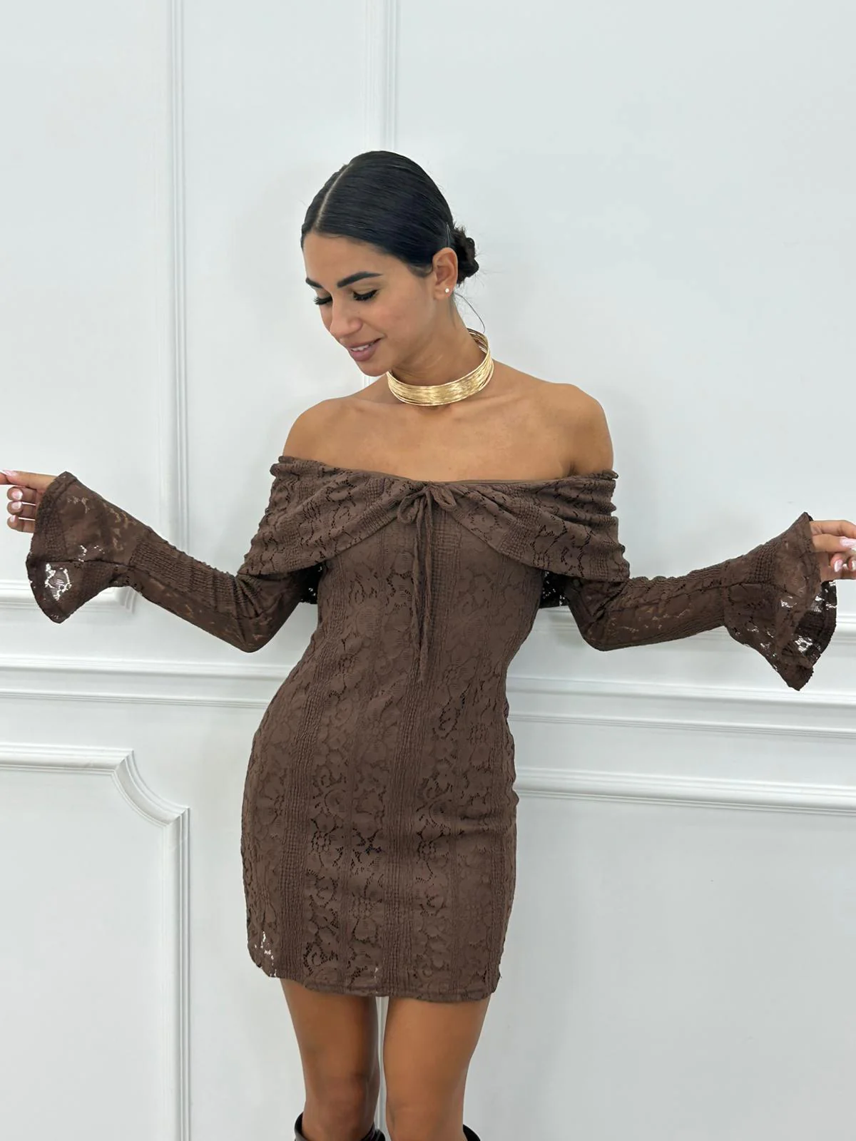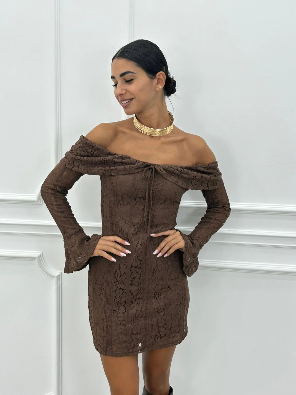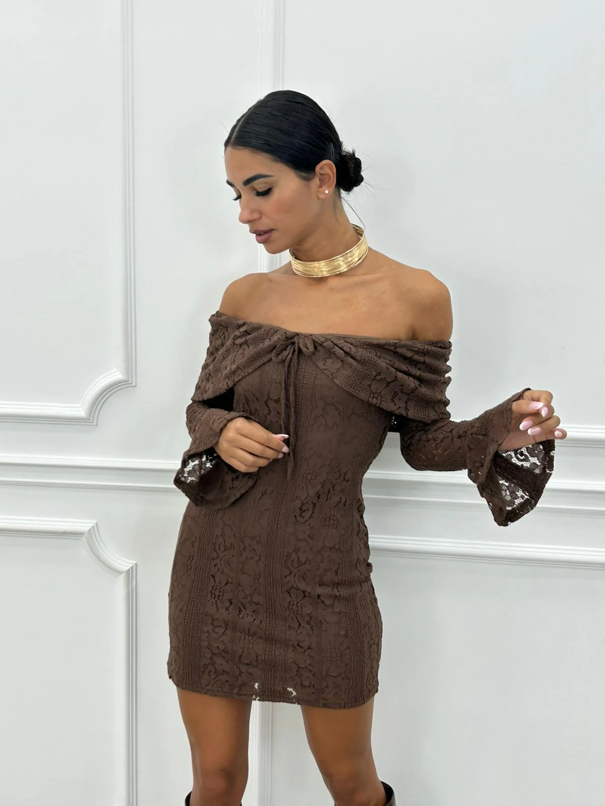Vestito corto in pizzo con manica rouche