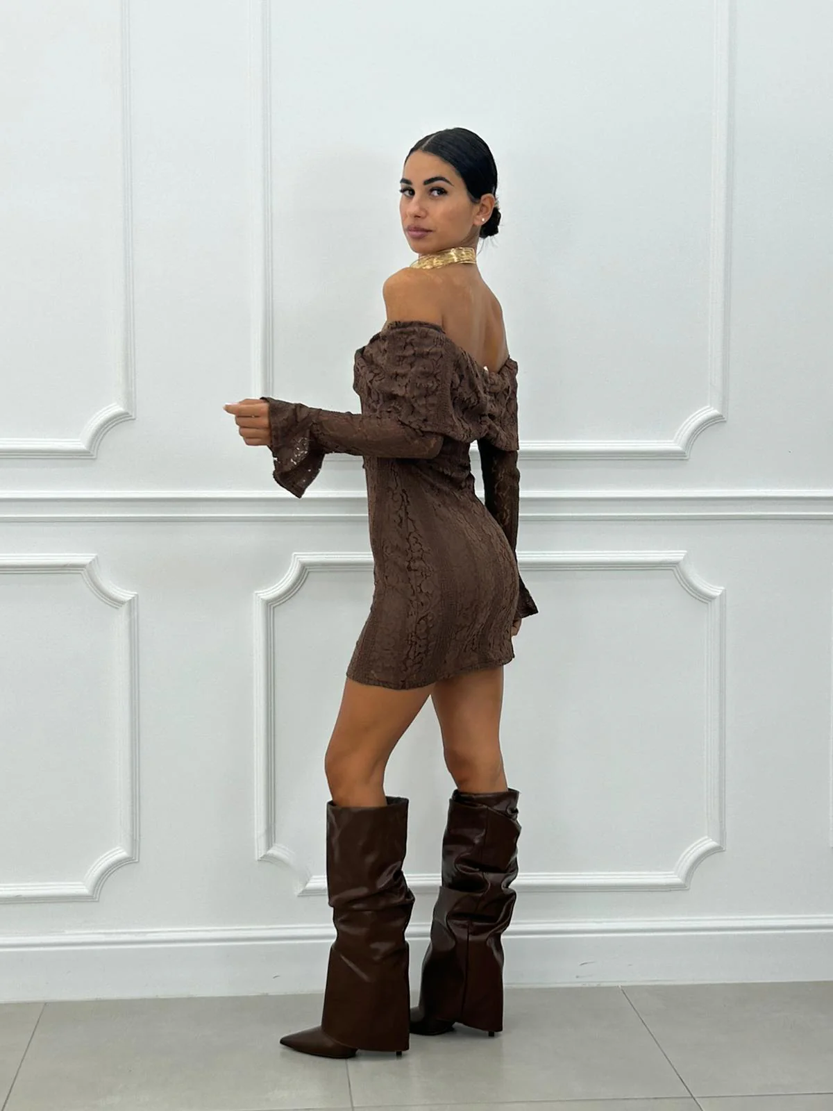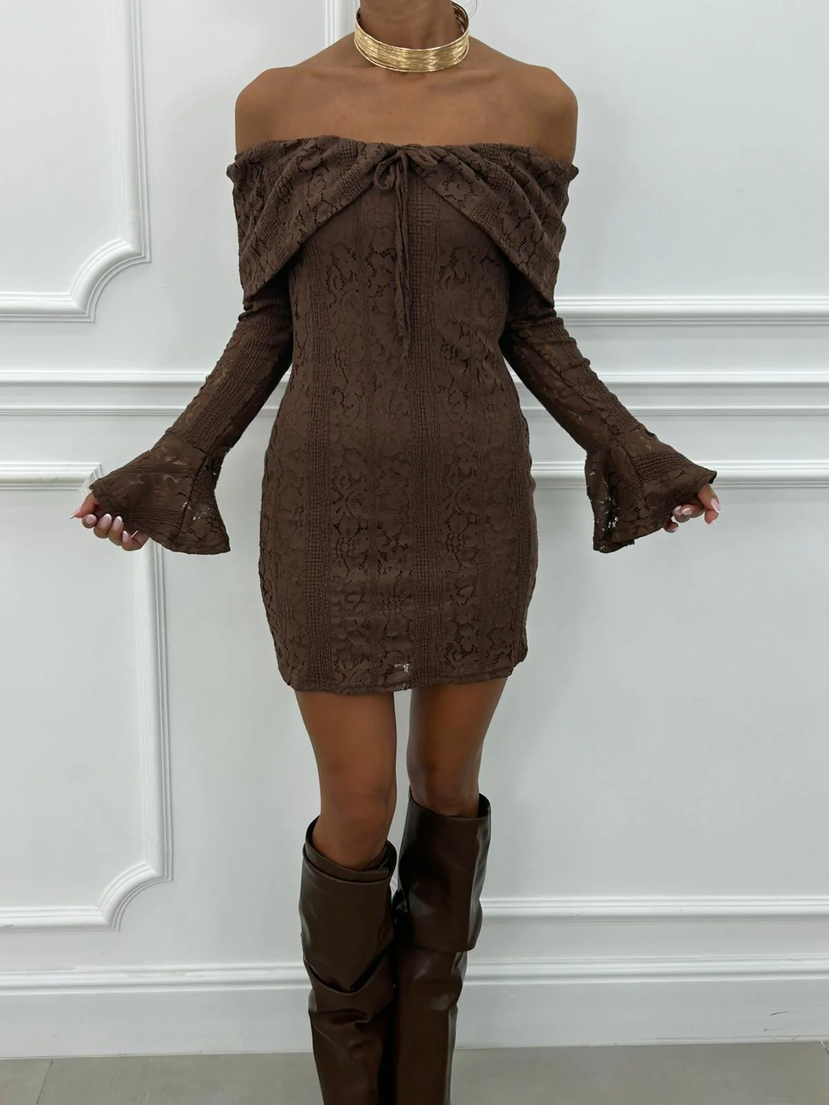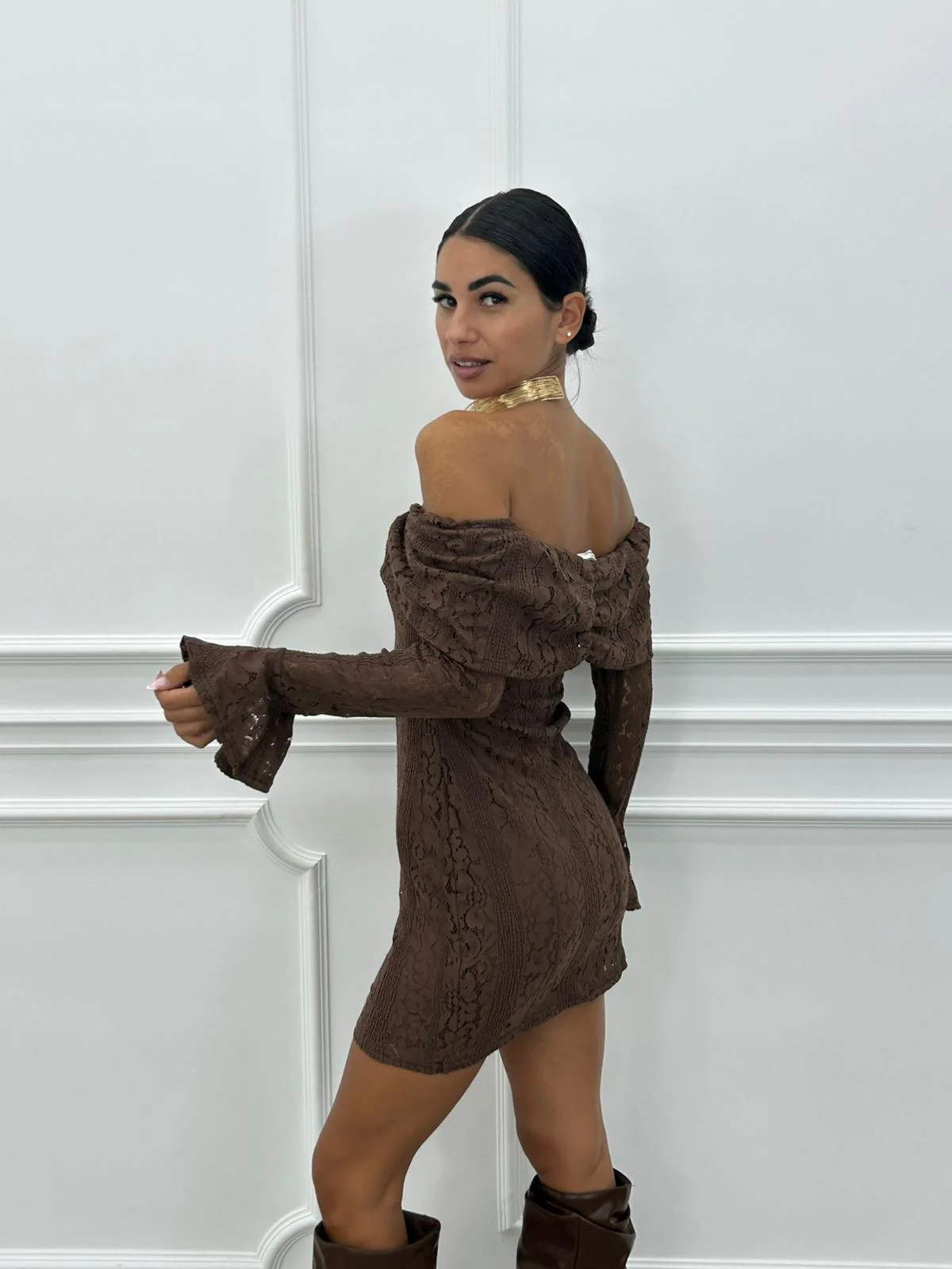 Vestito corto in pizzo con manica rouche