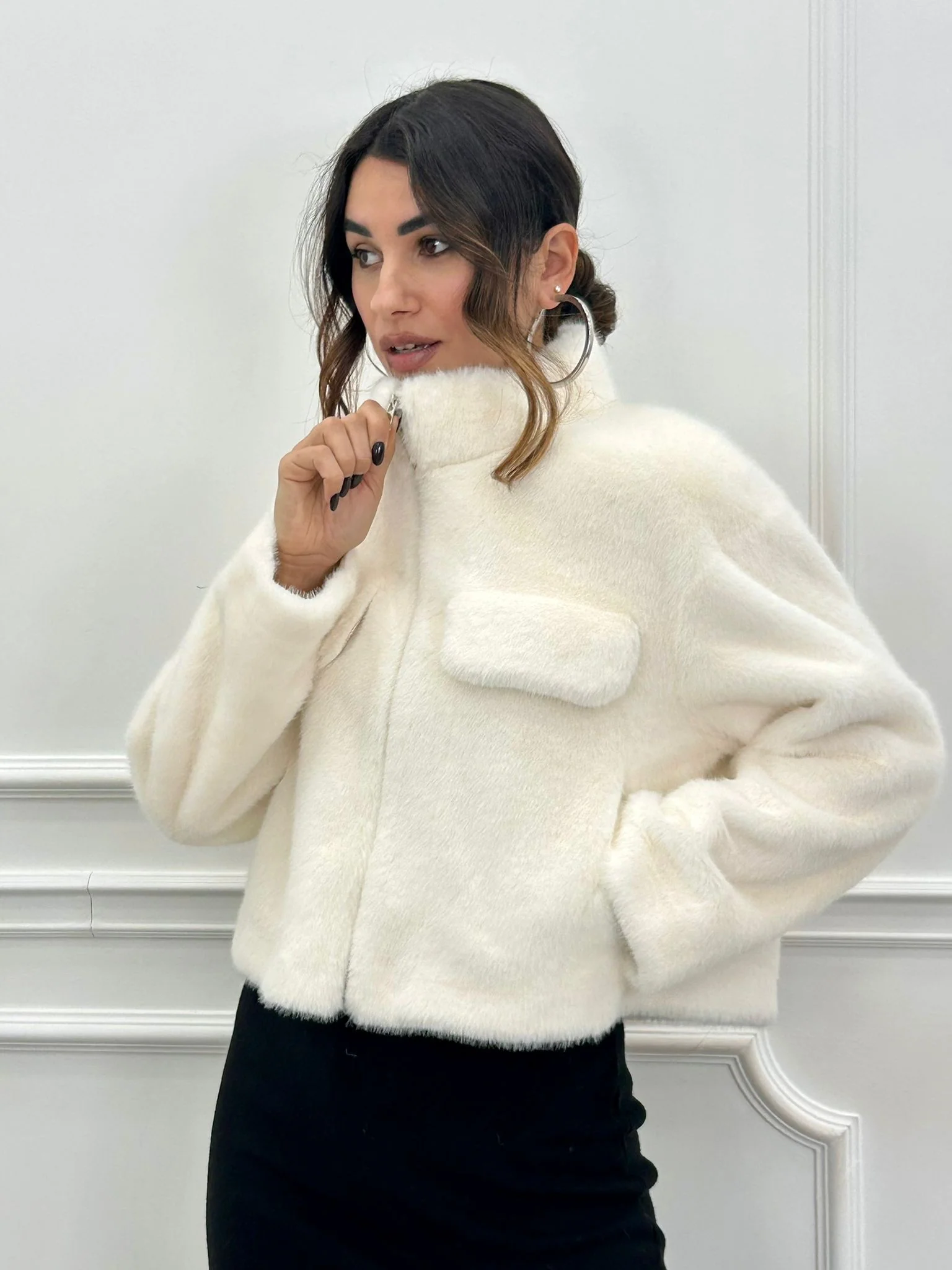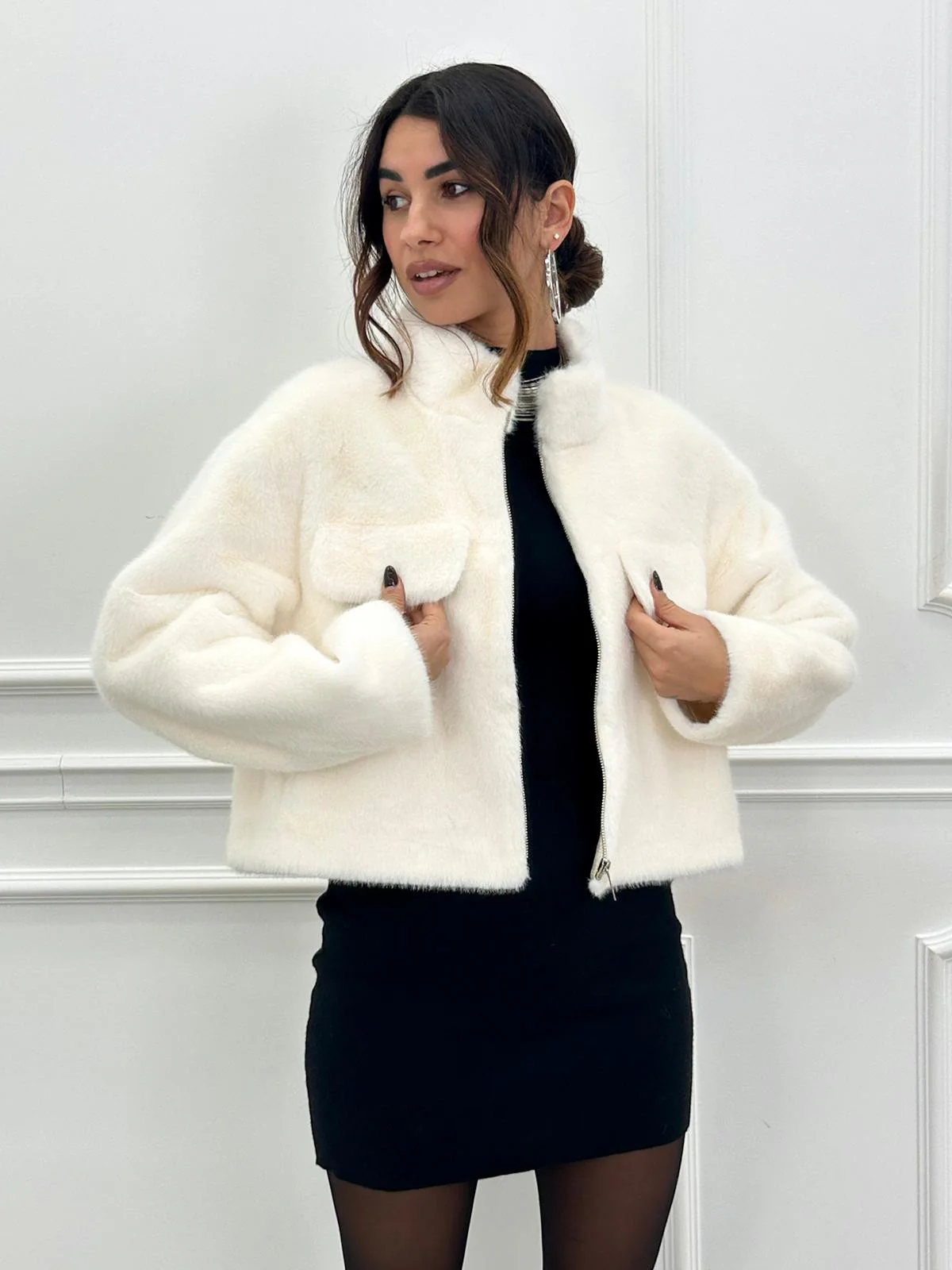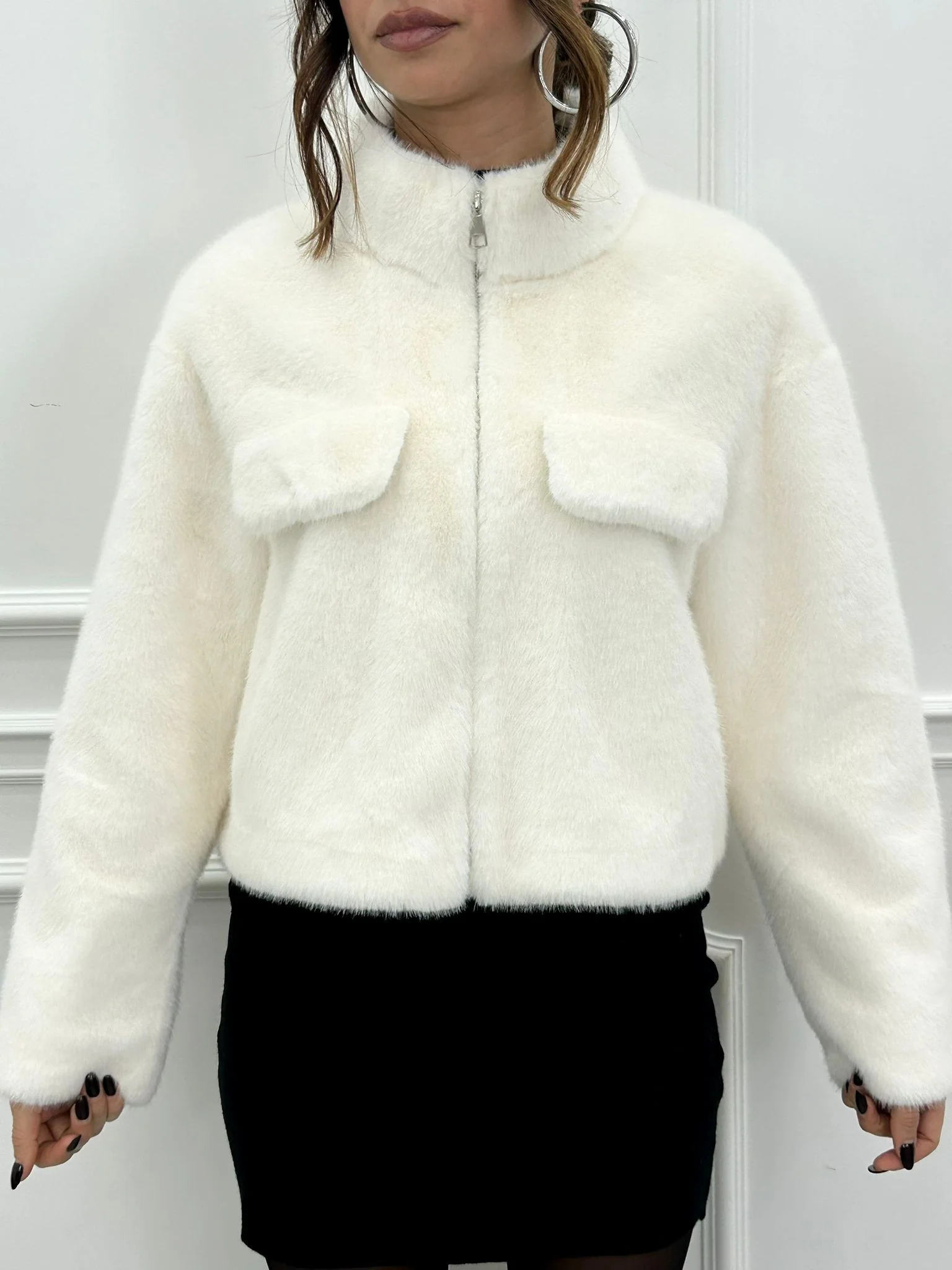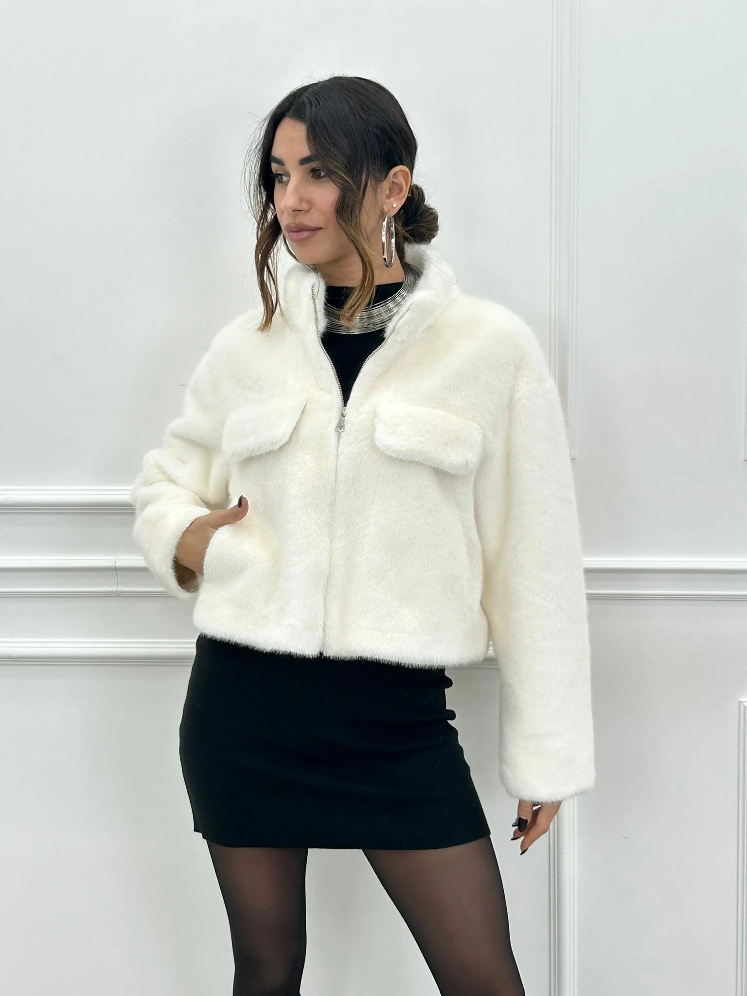 Ecopelliccia crop con tasche , chiusura zip
