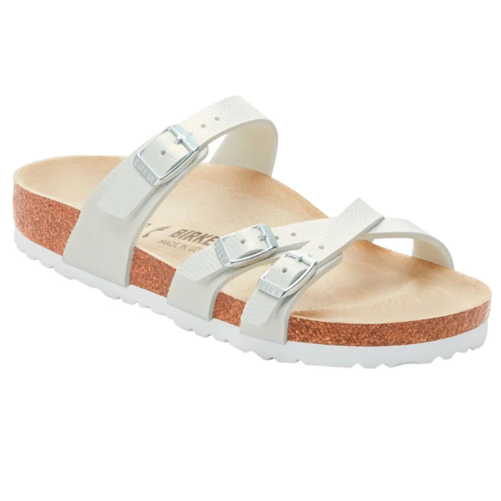 Birkenstock franca è un sandalo dinamico con sottili cinturini incrociati. la riuscita combinazione di design e comodità accompagna con eleganza e praticità le donne che amano la moda, tutto il giorno. questo sandalo è stato reinterpretato con uno stravagante look metallizzato. il laminato lucido dona nuova brillantezza a questo classico, rendendo ogni outfit un vero schianto. la tomaia è in birko-flor®, un materiale sintetico resistente all’usura e delicato per la pelle, presente sul modello in una nuova versione stampata che conferisce a questo sandalo il suo carattere tutto particolare.