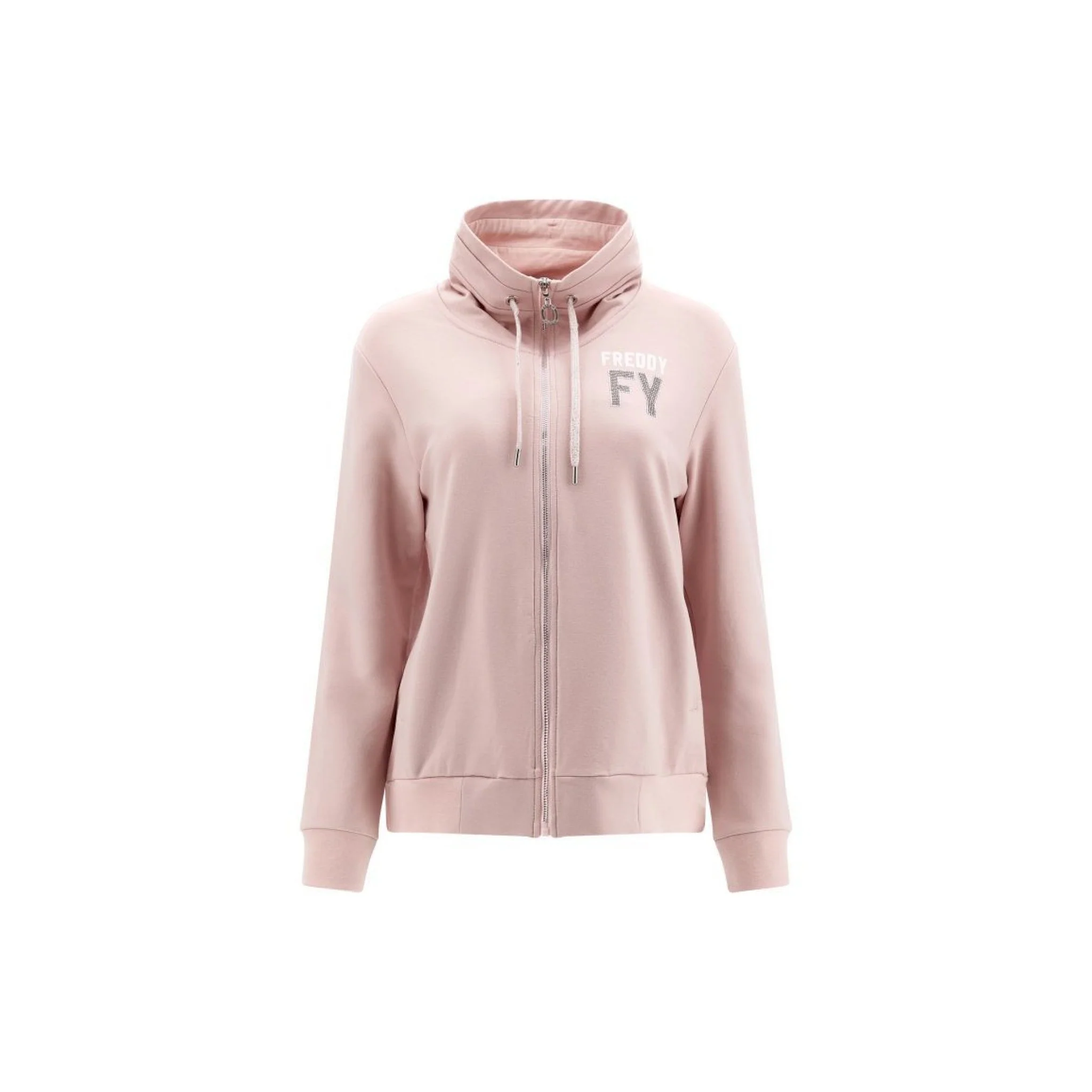 Felpa comfort fit in felpa leggera modal con collo alto ampio e decorata sul lato cuore dalla grafica frontale fy in strass cristallo accompagnata dalla scritta freddy in glitter bianco. il modello presenta coulisse per regolare il collo, chiusura a full zip, tasche frontali interne, polsini in costina, fondo con i fianchi in costina e retro leggermente più lungo e stondato