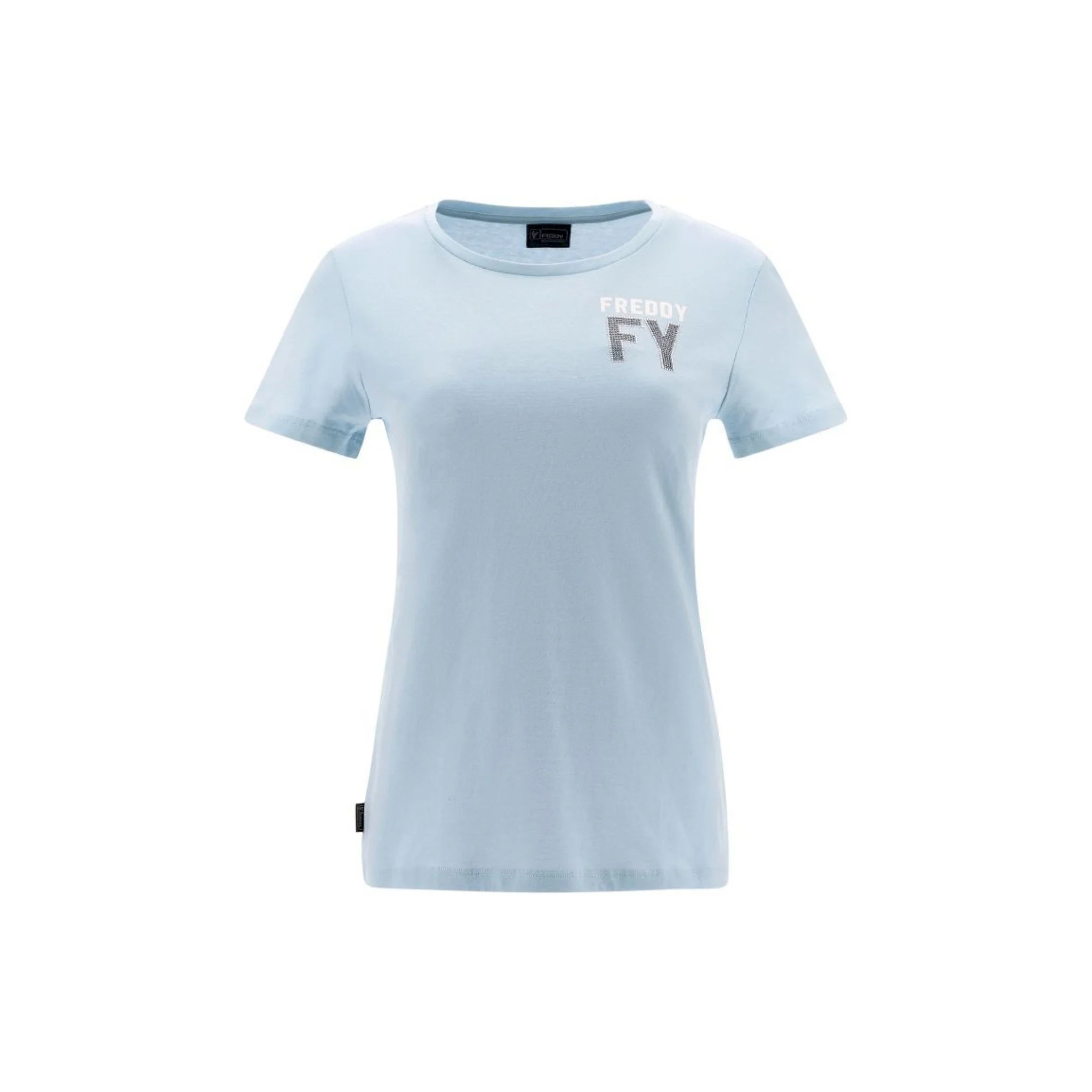 T-shirt in jersey di cotone impreziosita sul lato cuore dalla grafica fy in strass cristallo accompagnata dalla scritta freddy in glitter bianco.