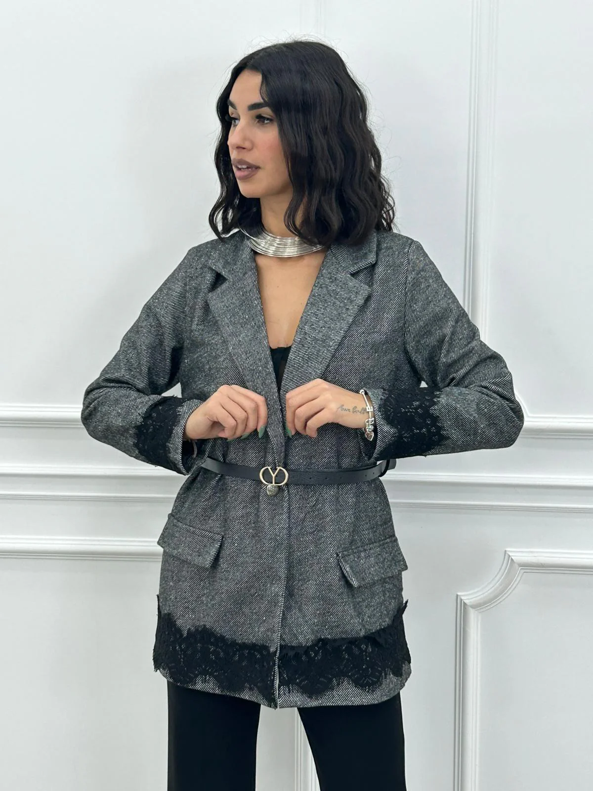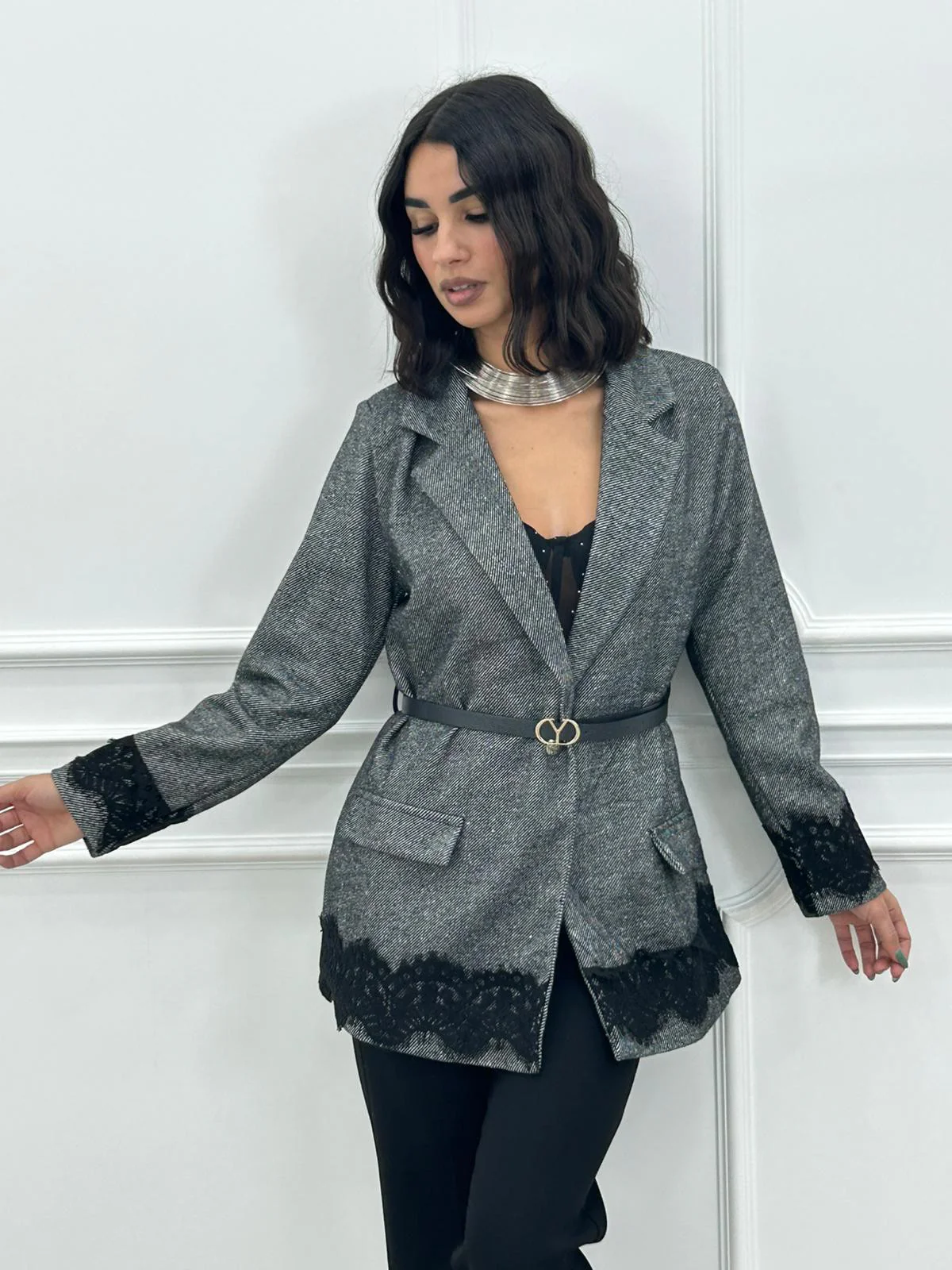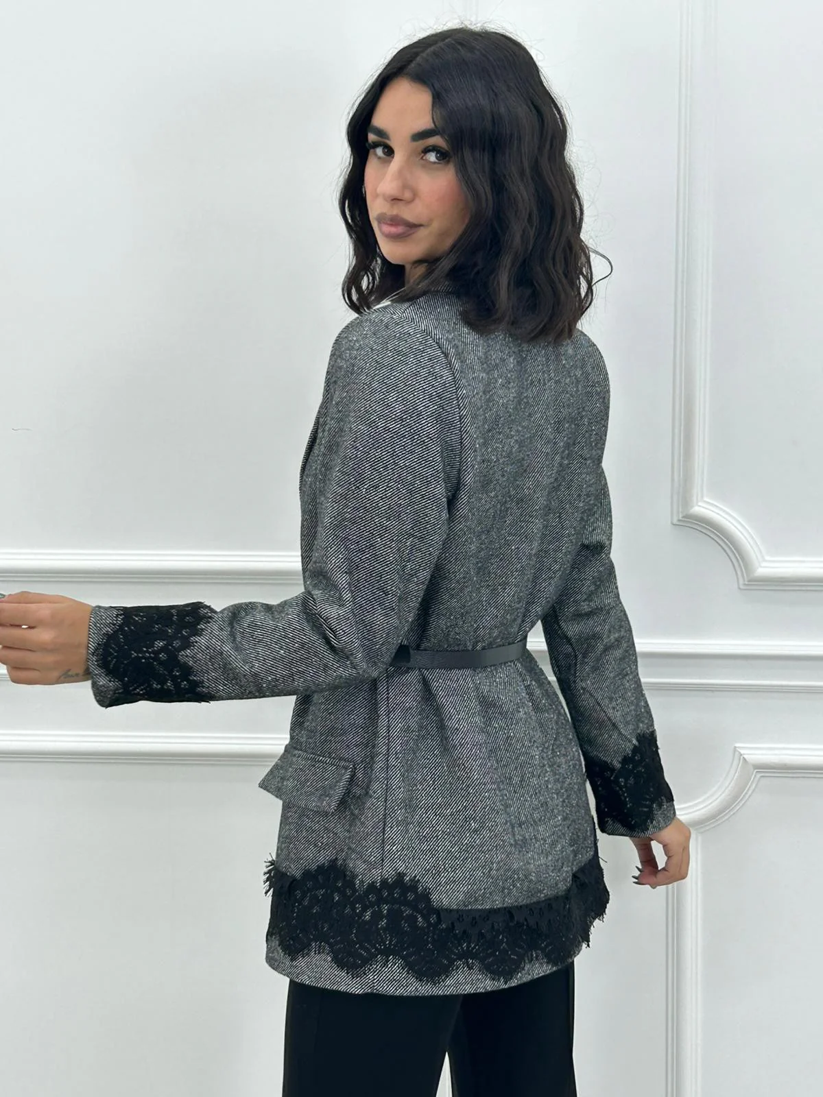 Giacca spiagata con dettaglio in pizzo , cinturino in vita,interno foderato