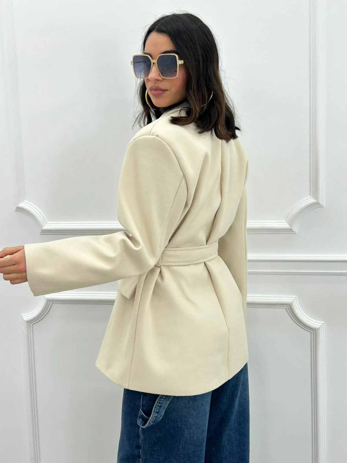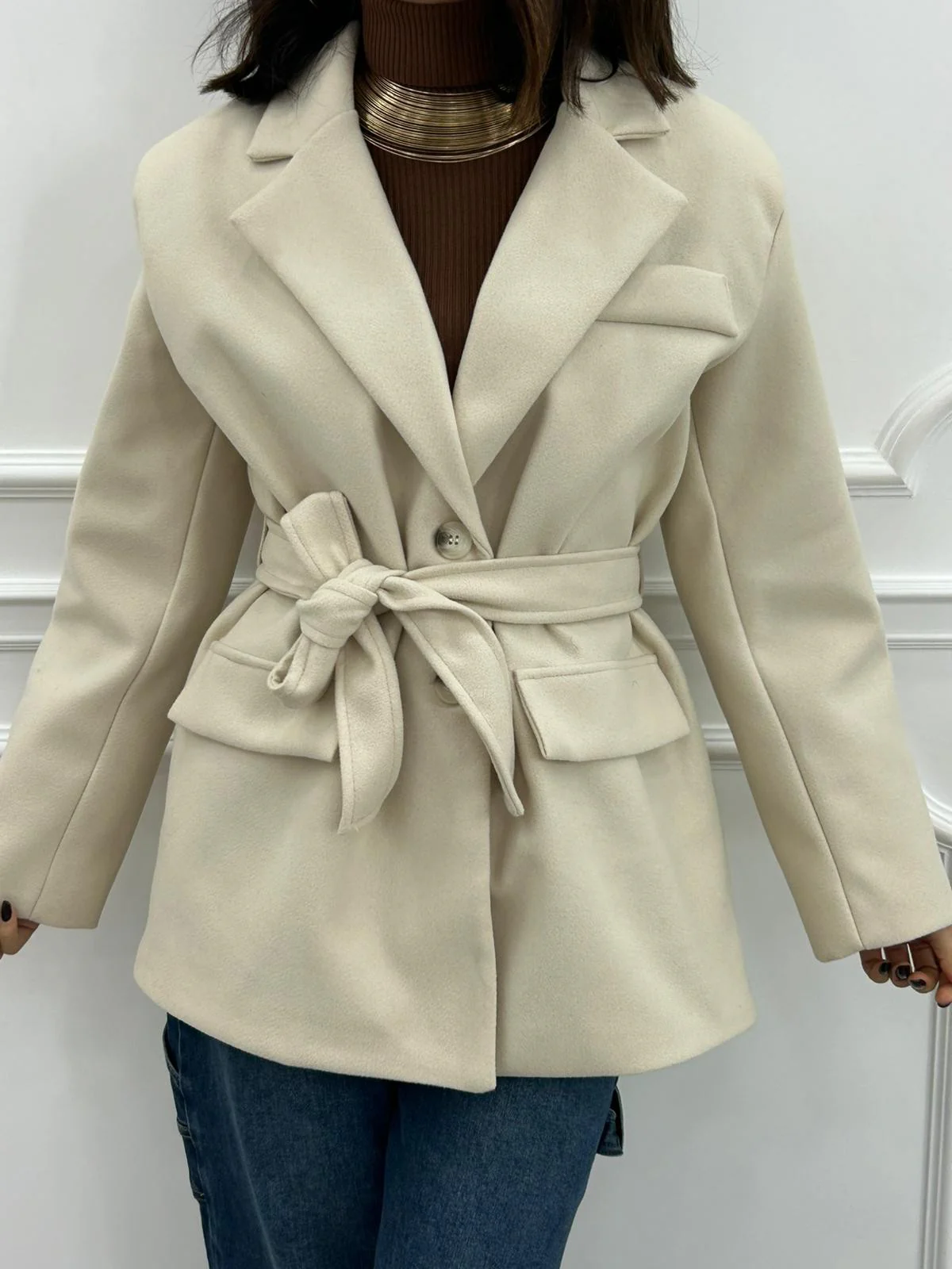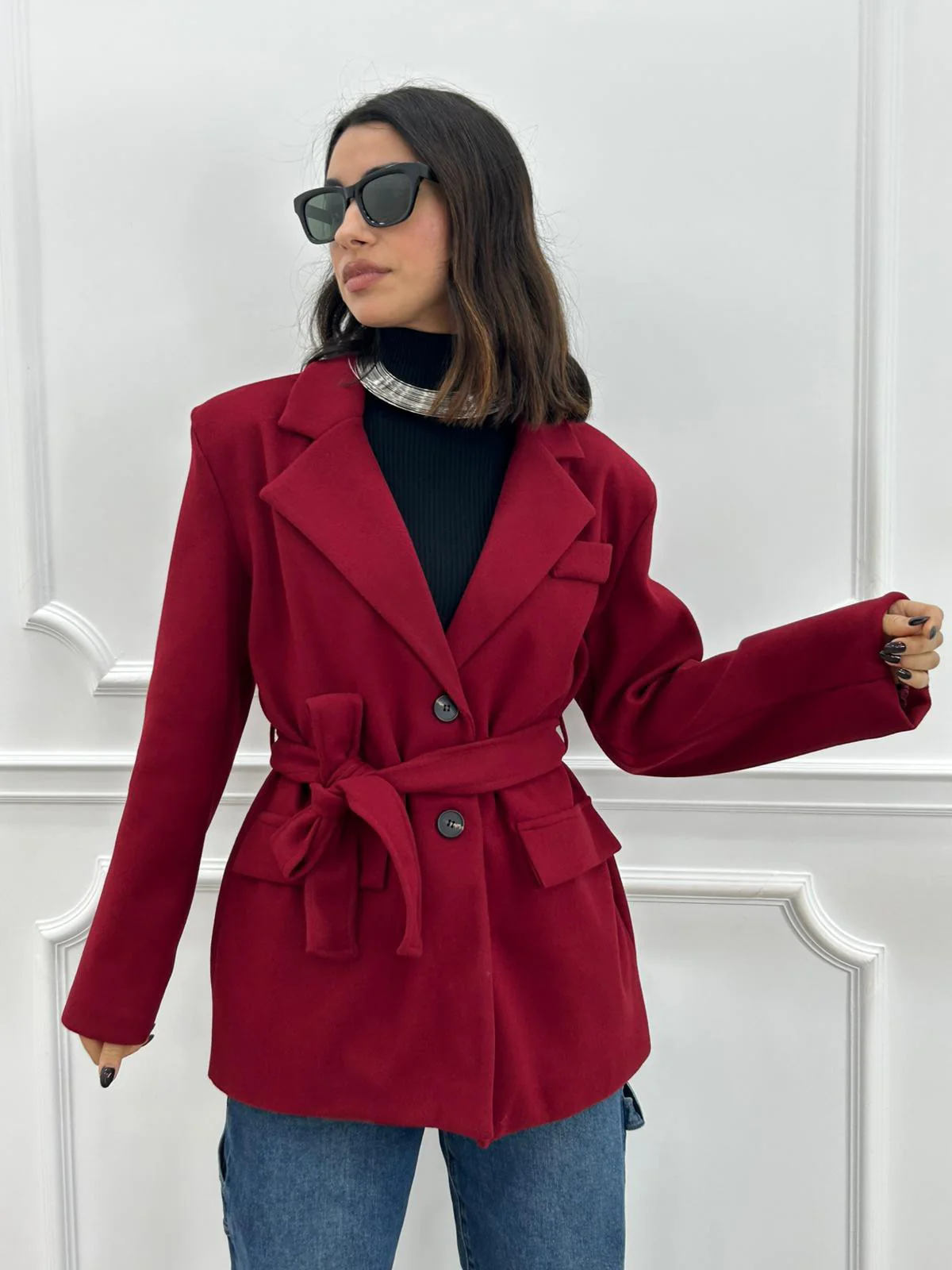 Giacca in panno con cintura , chiusura due bottoni e tasche,interno foderato