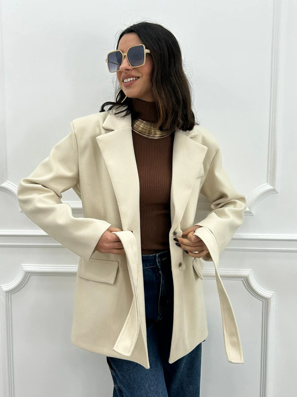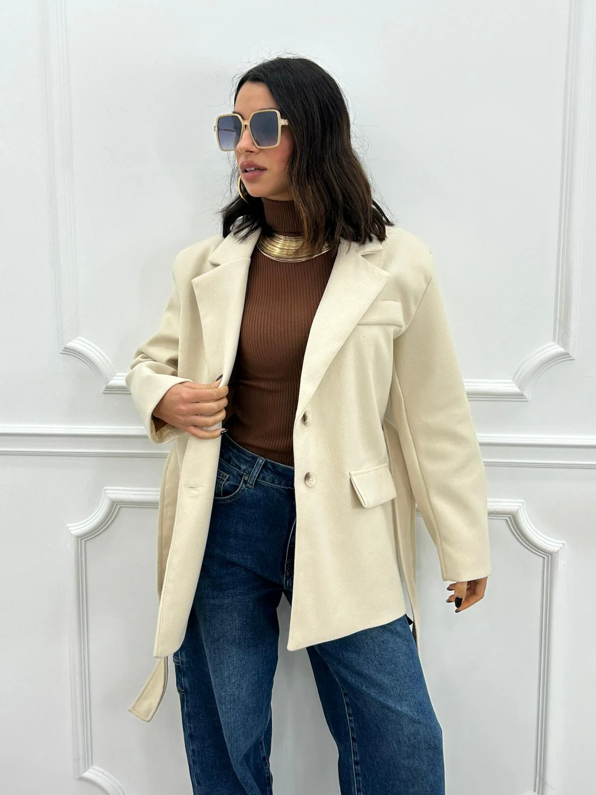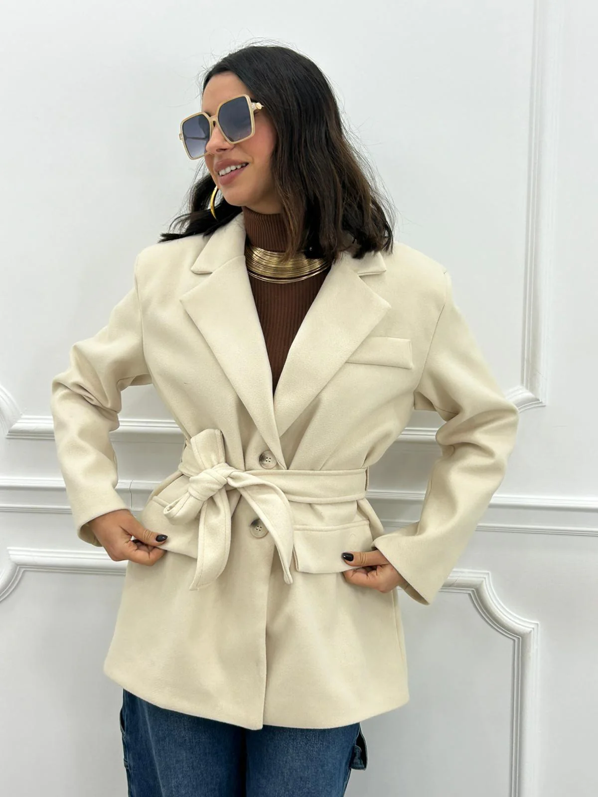Giacca in panno con cintura , chiusura due bottoni e tasche,interno foderato