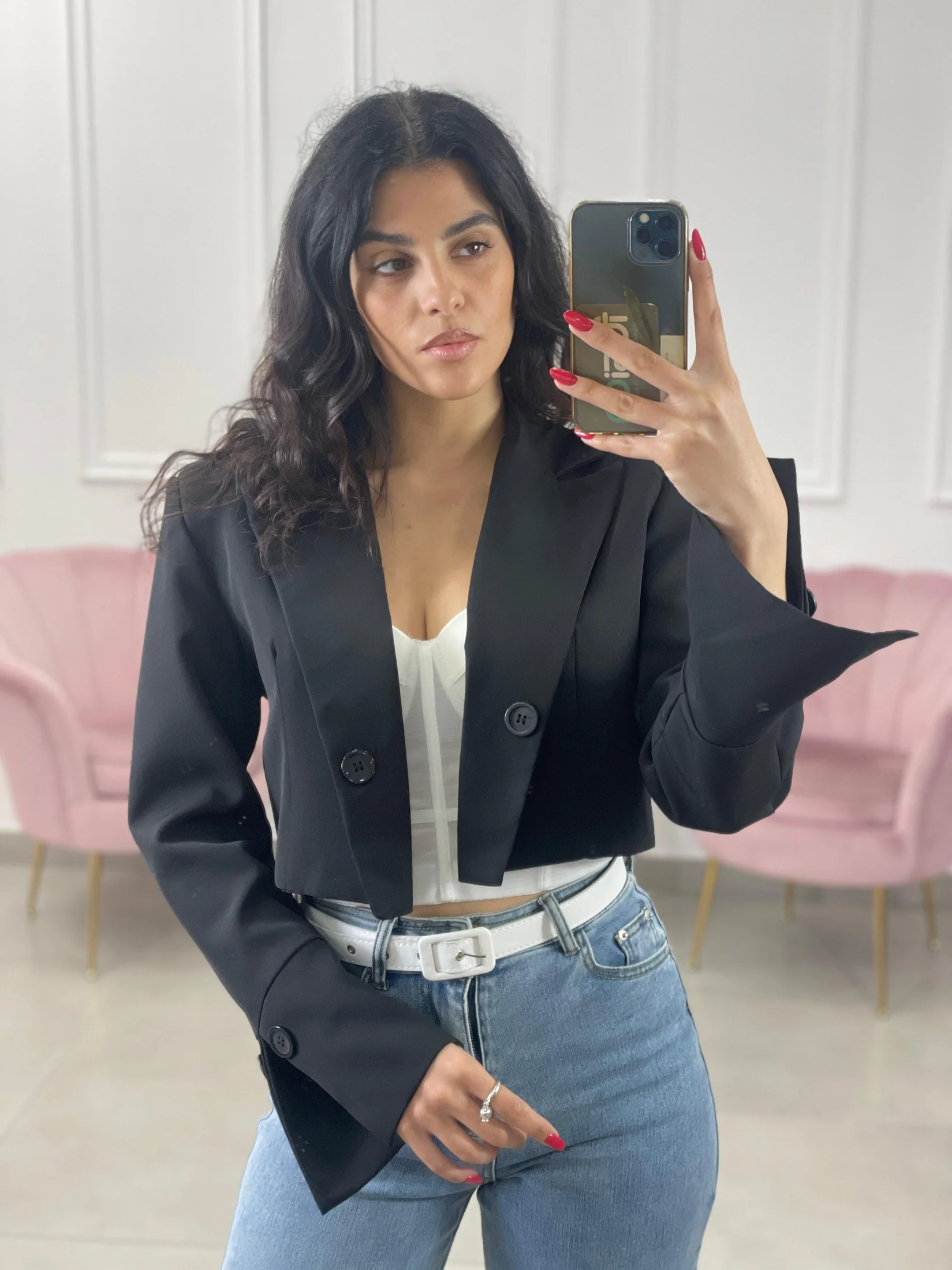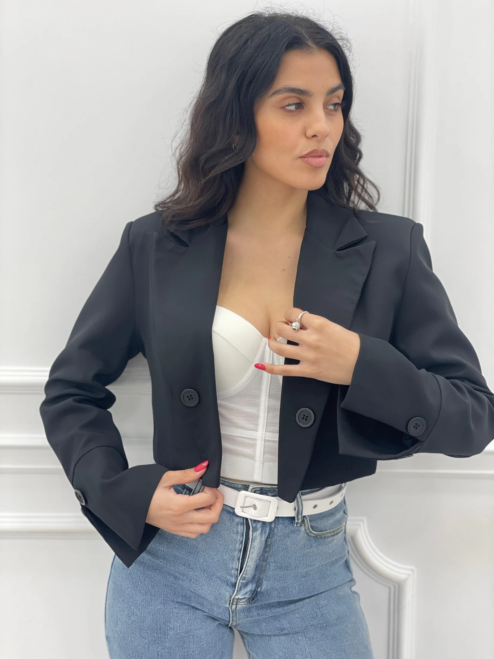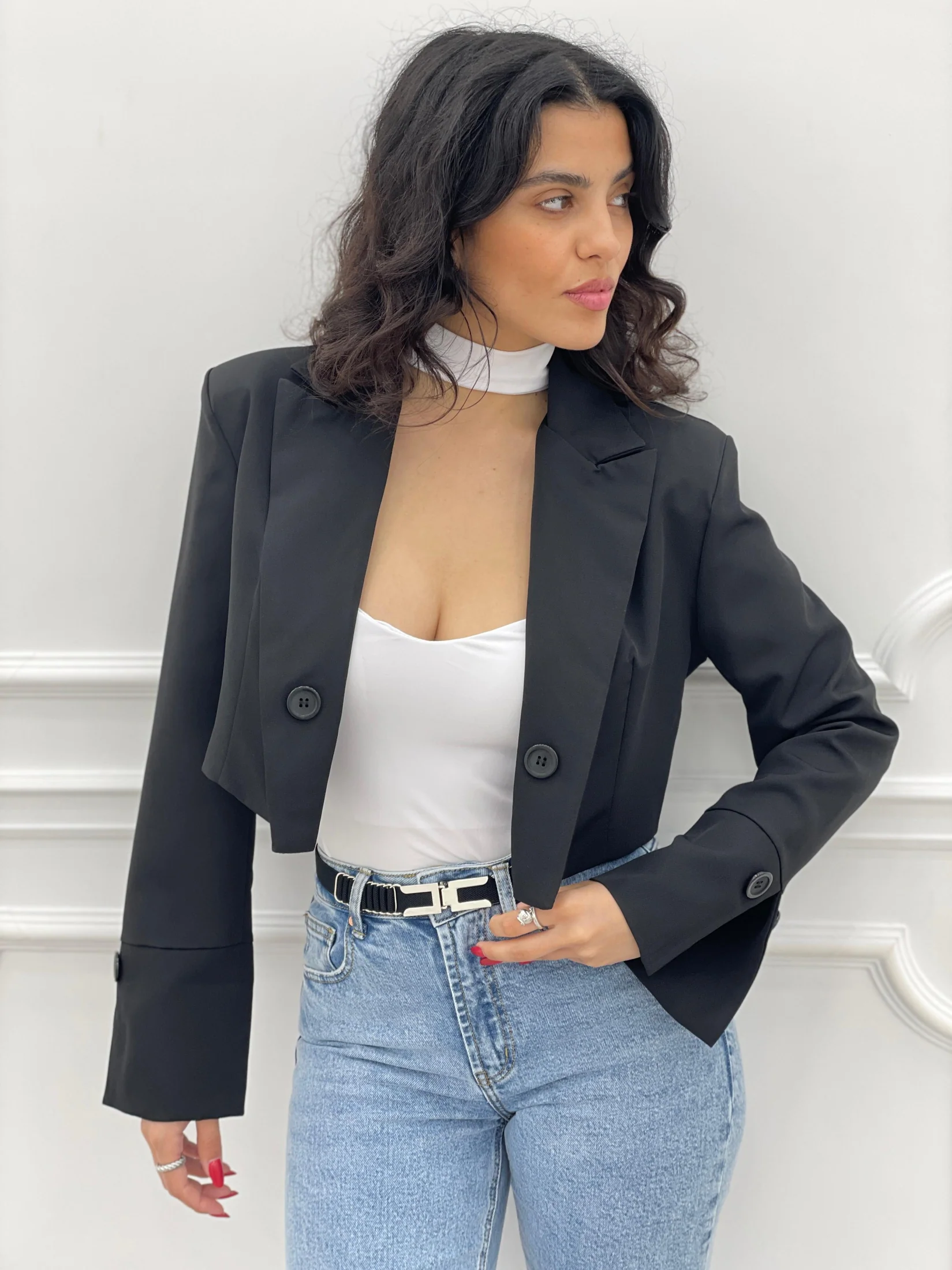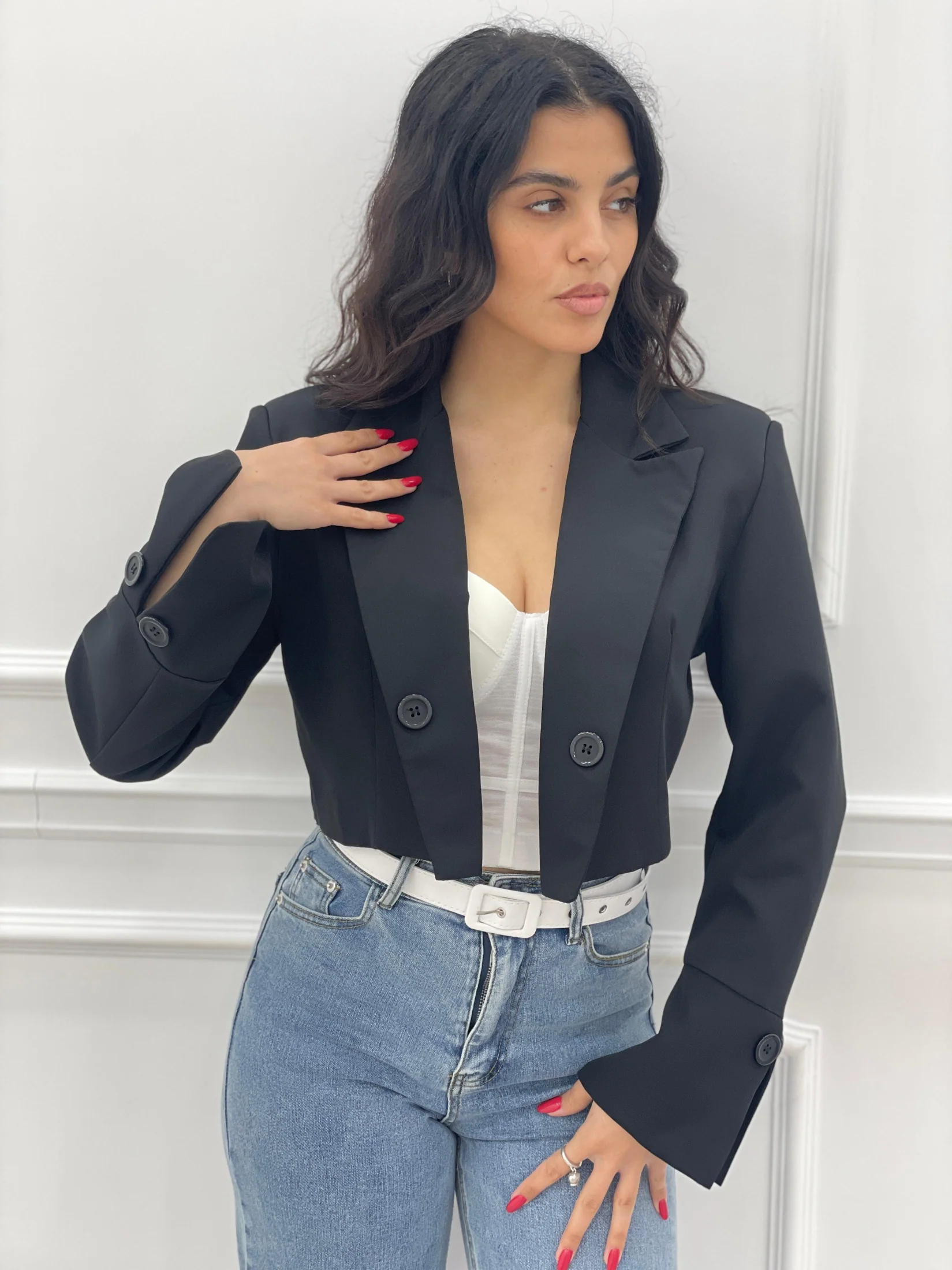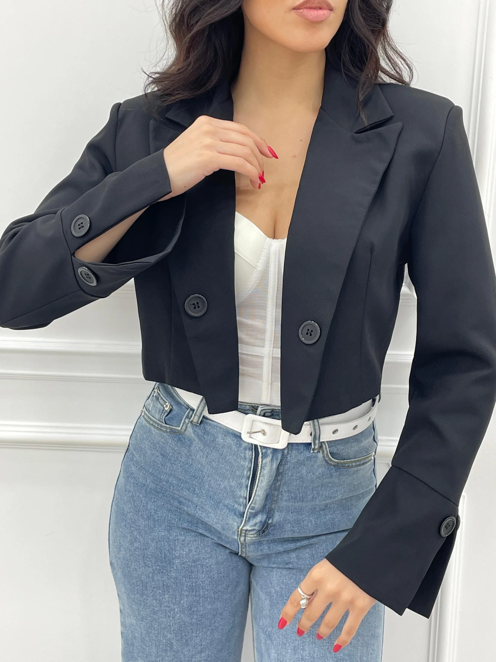Giacca crop con spalline e bottoni.Interno foderato