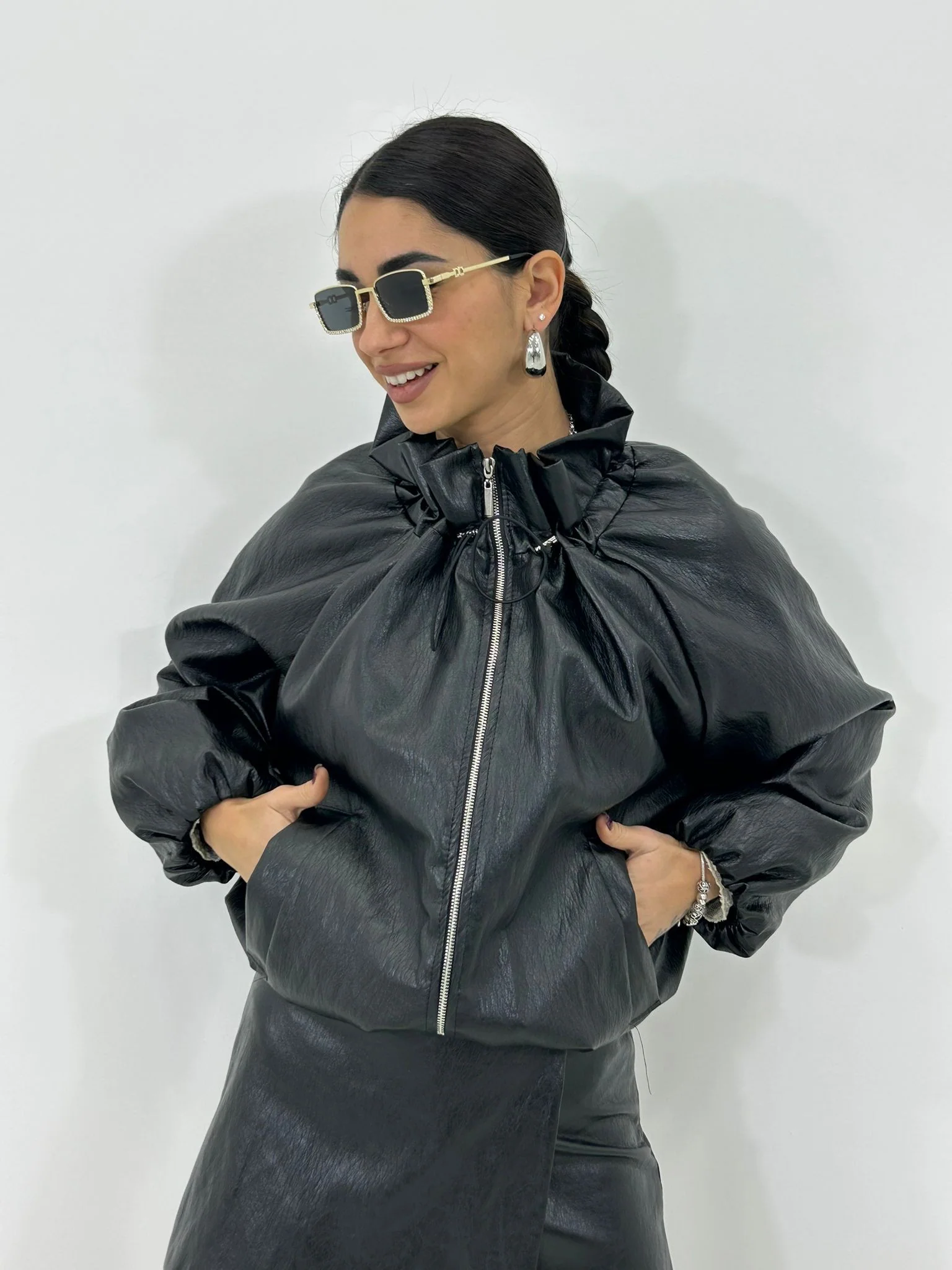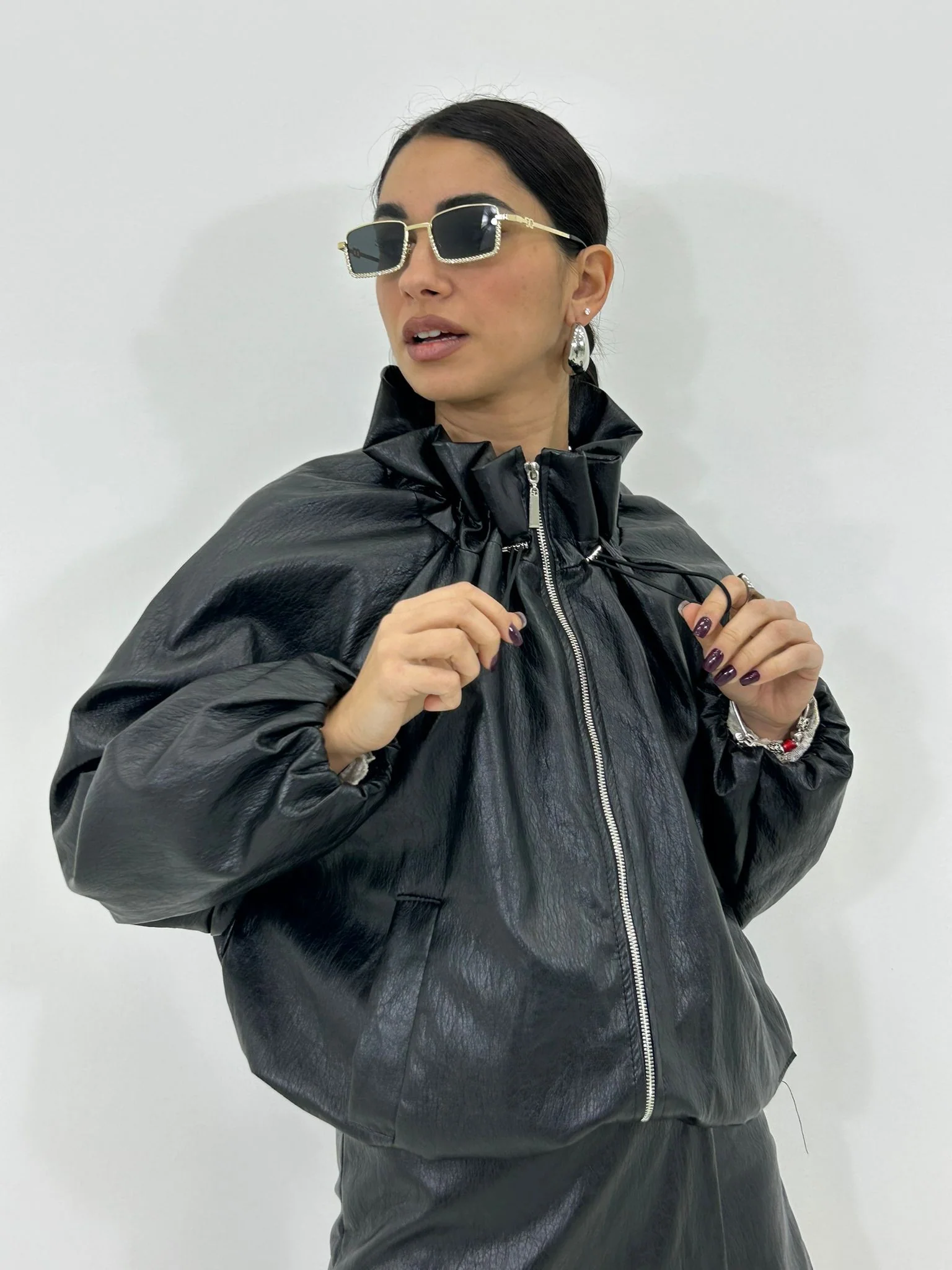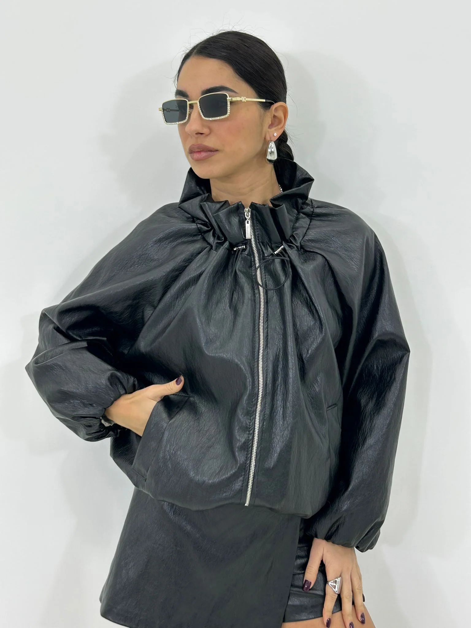 Giubbino balloon in ecopelle con collo arricciato,interno foderato