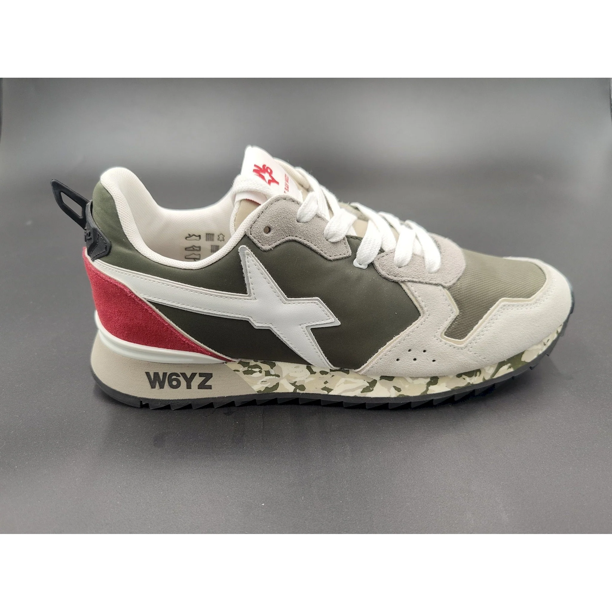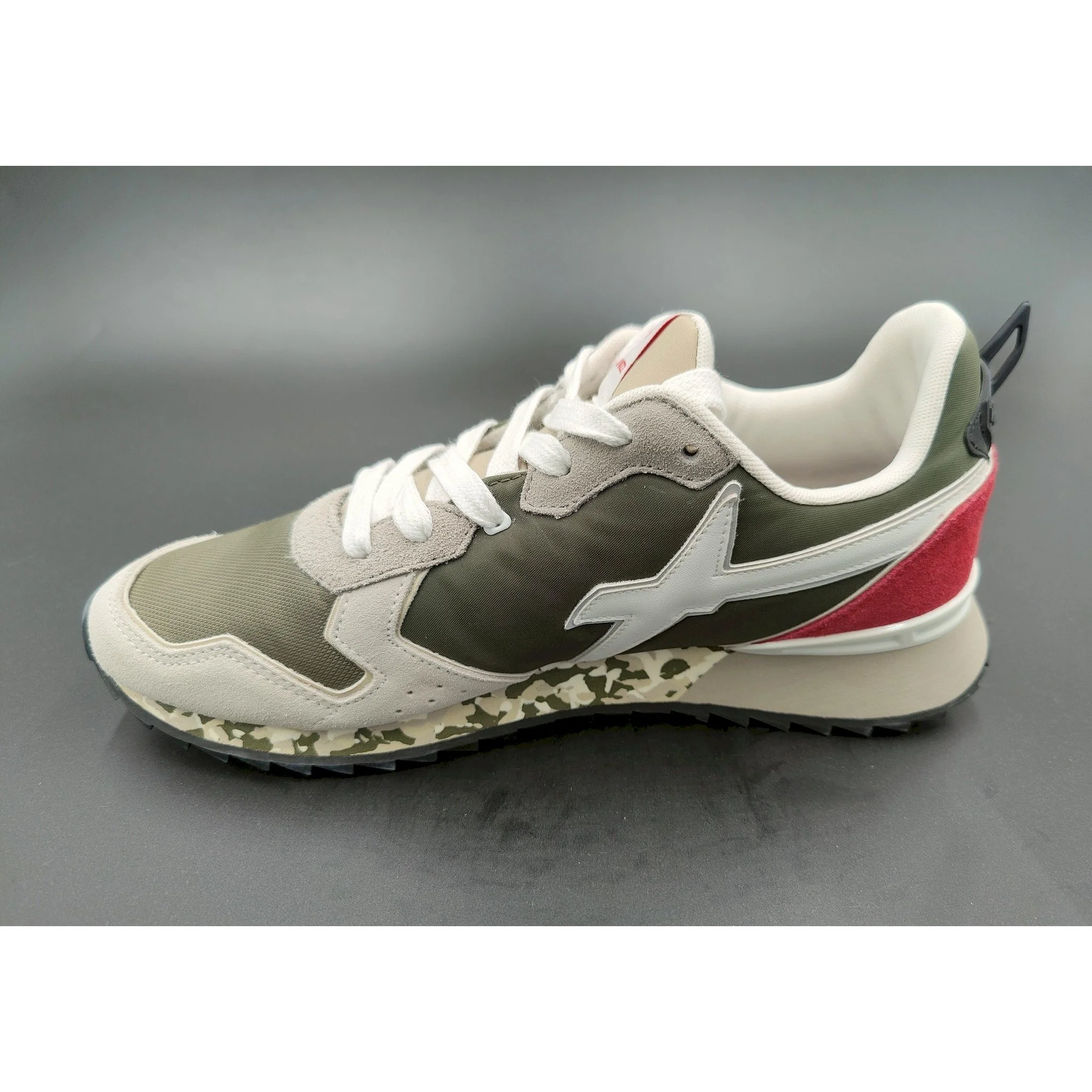 toni neutri e cromie d’impatto caratterizzano queste sneaker. la tomaia in tessuto tecnico è arricchita dai dettagli in suede e profili a contrasto, che disegnano la costruzione della scarpa. il fondo in gomma ultra leggera è decorato con una stampa pittorica e completato dal logo inserito sotto il tallone.