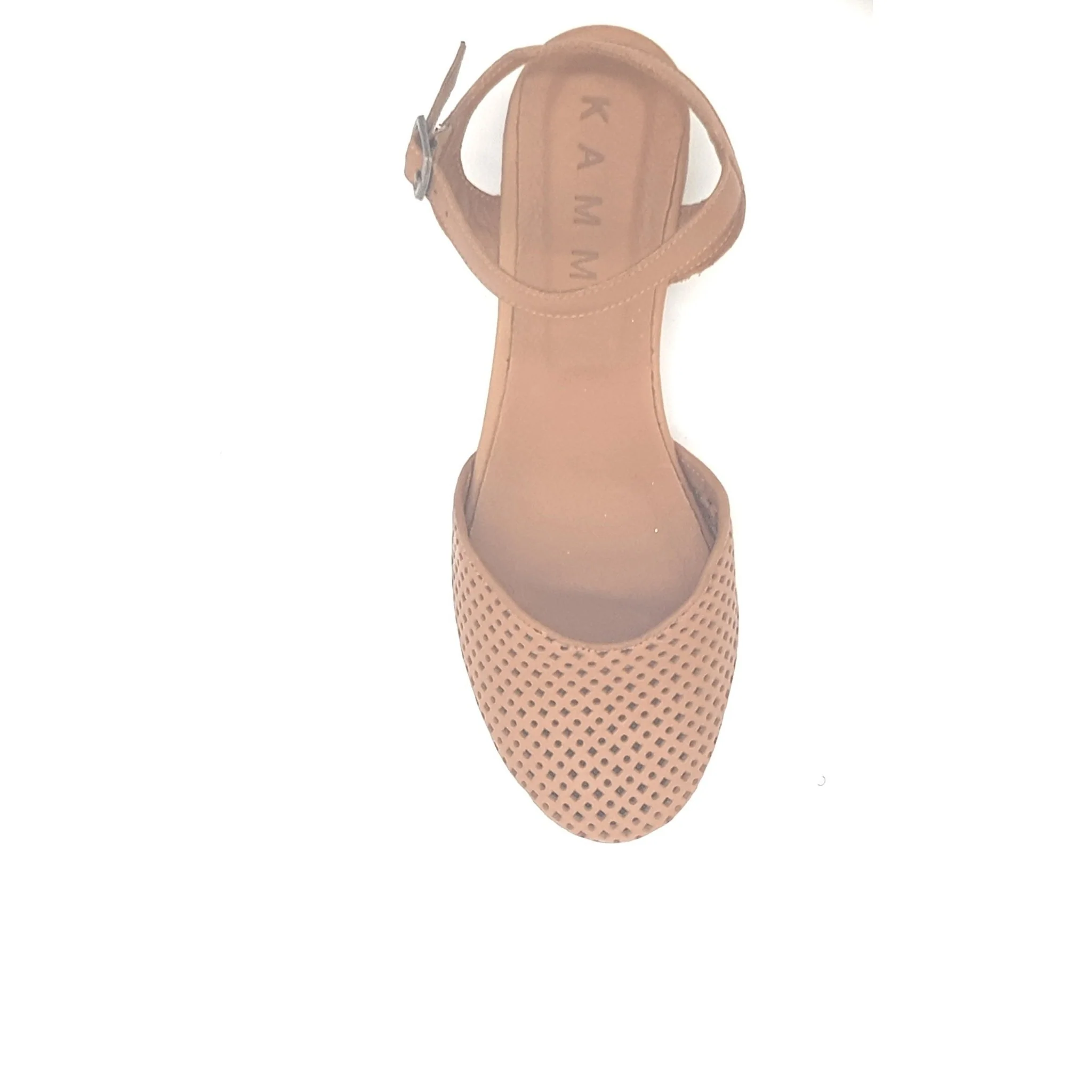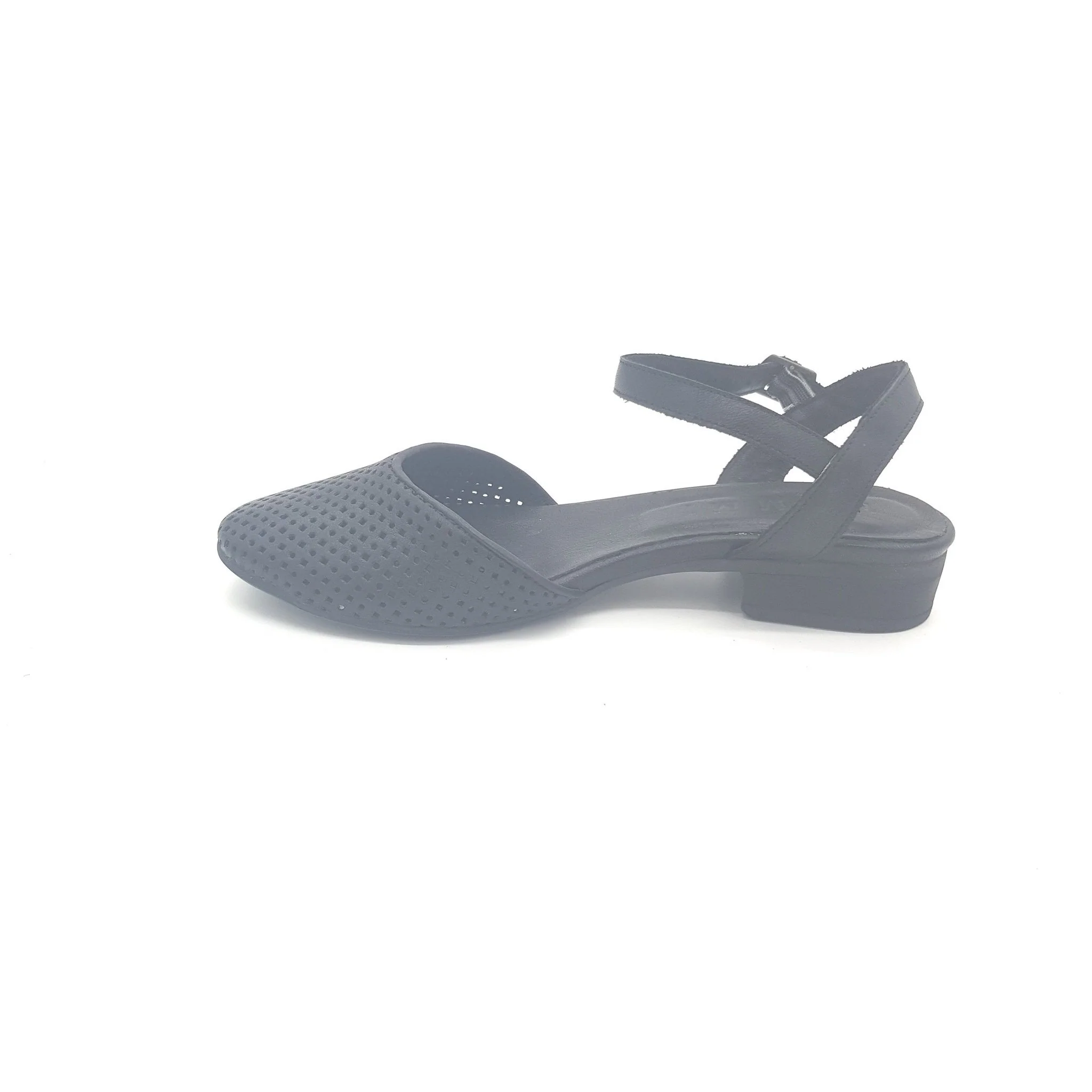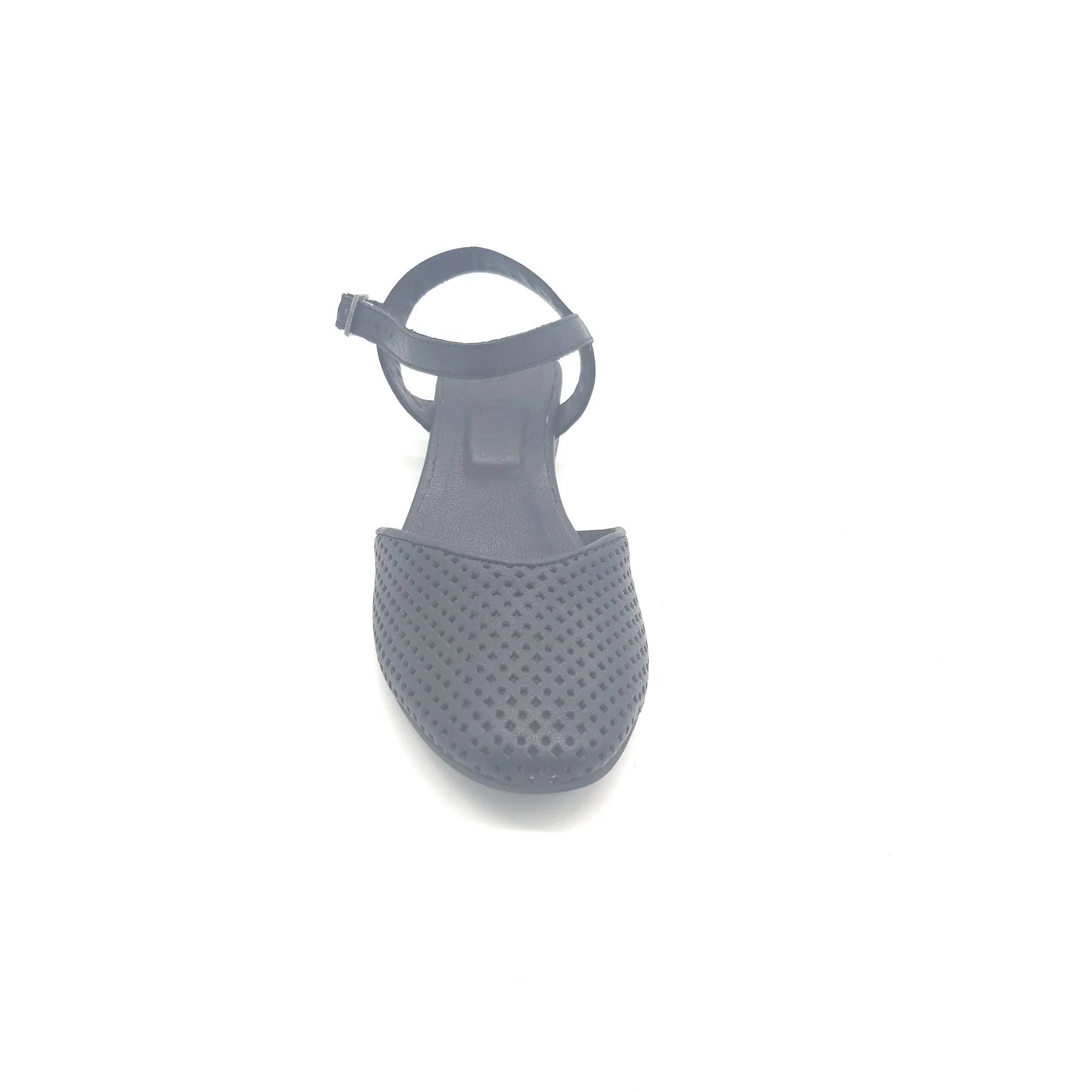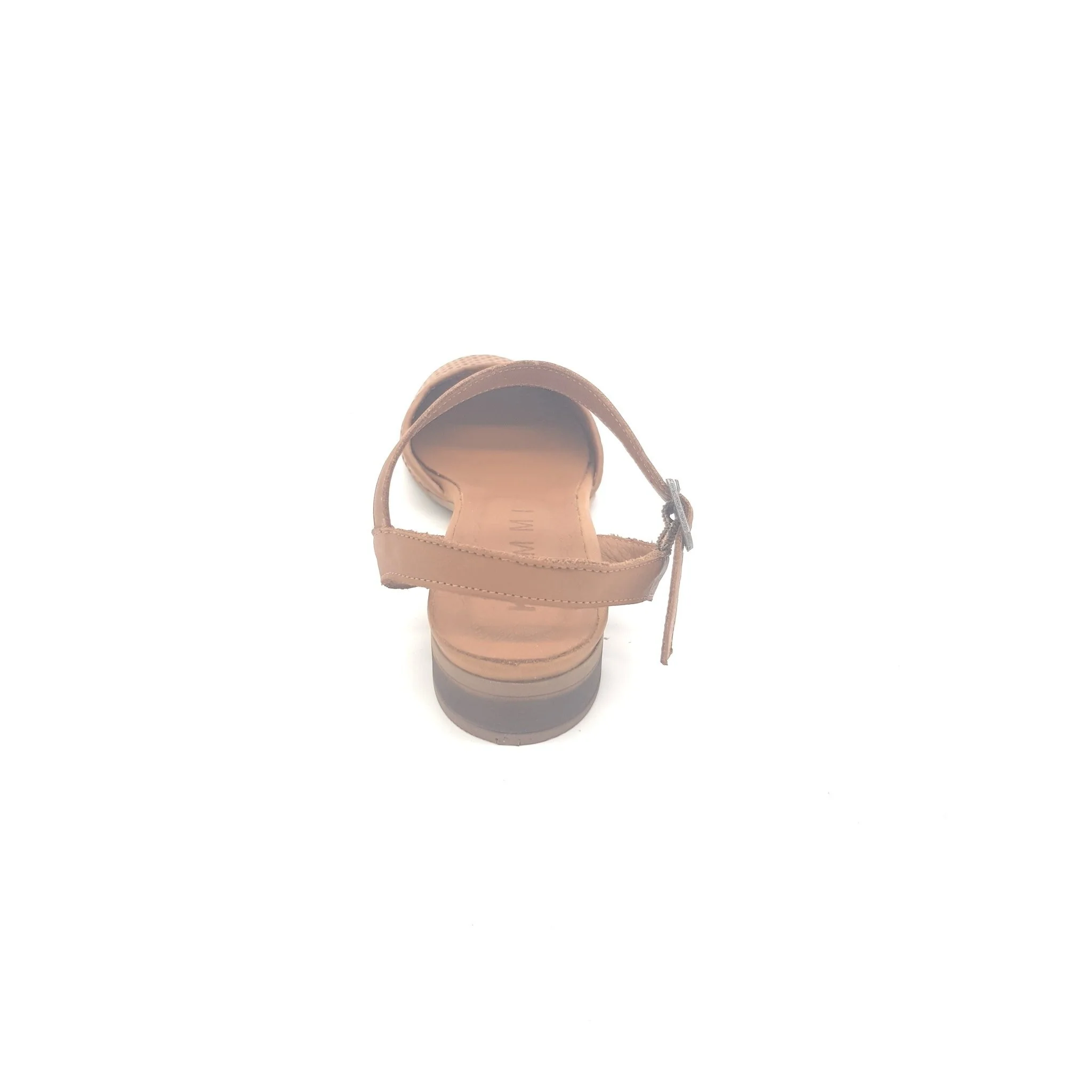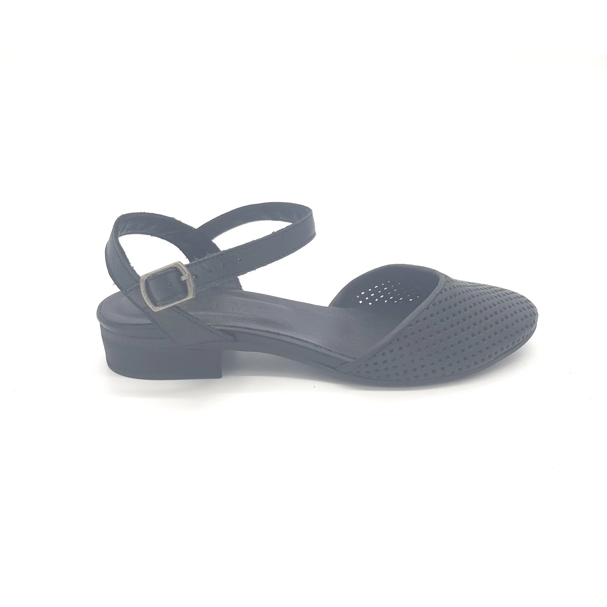 Sandalo basso con punta chiusa e cinturino regolabile alla caviglia, in pelle lavorata artigianalmente.