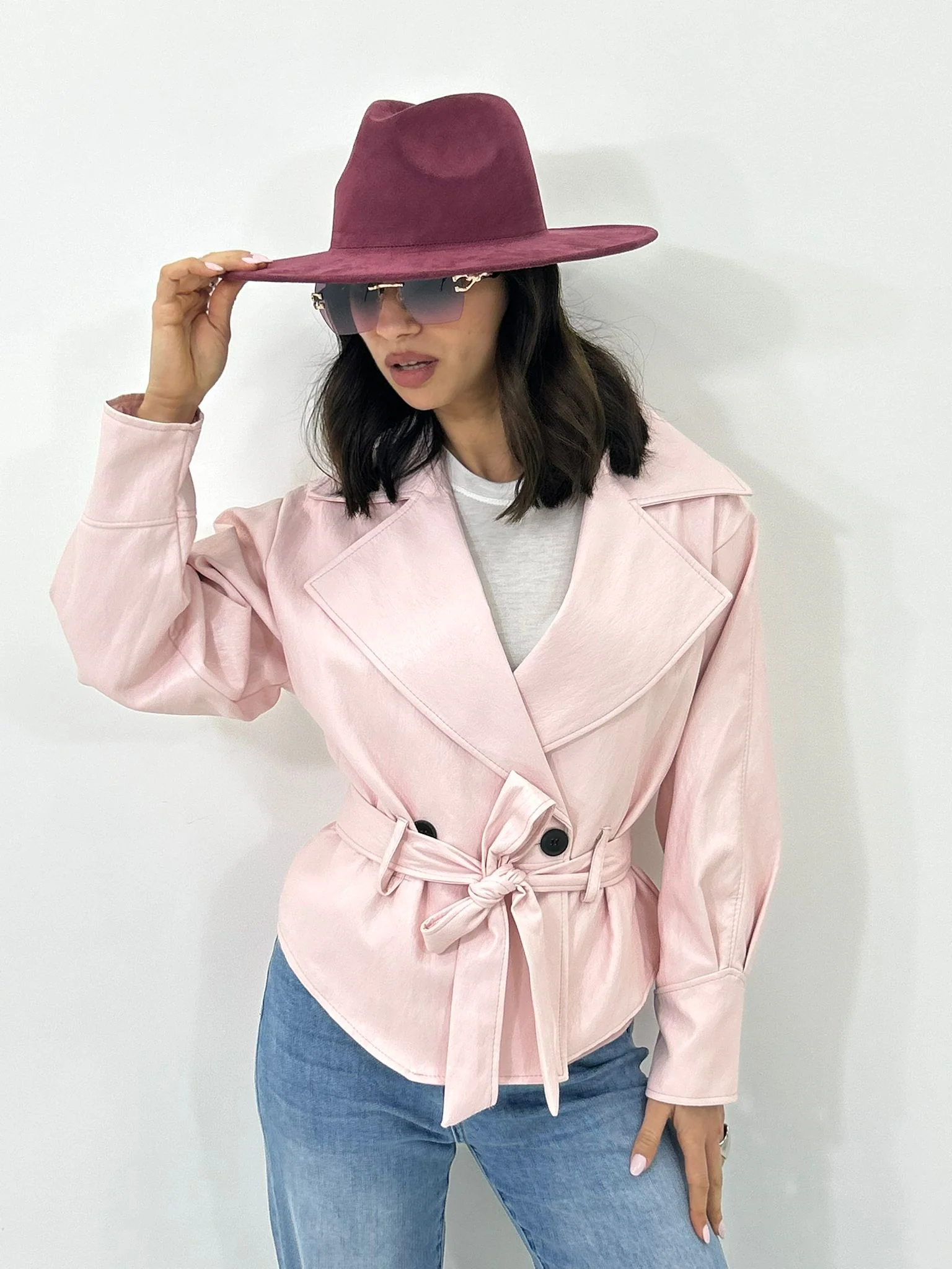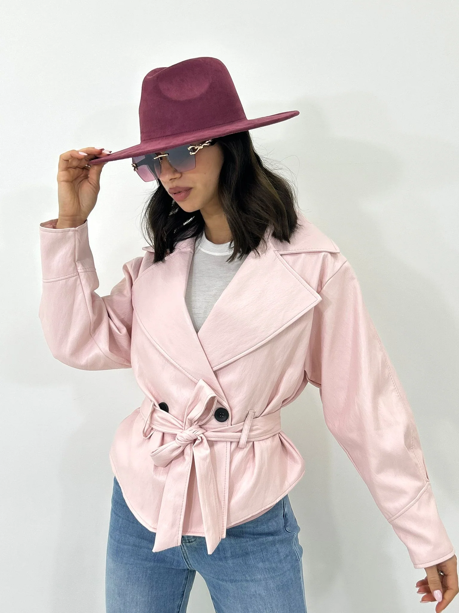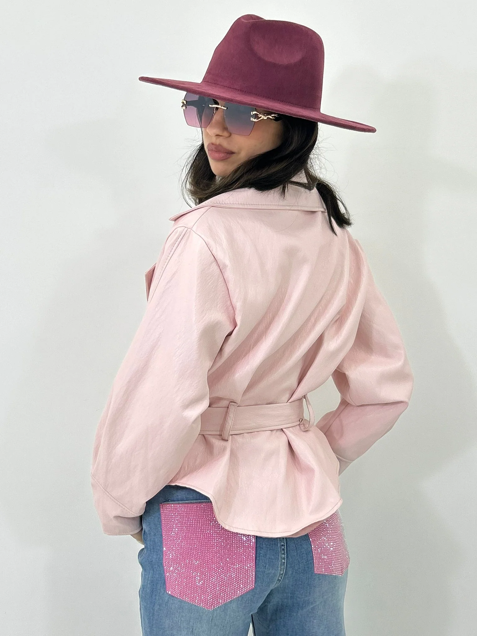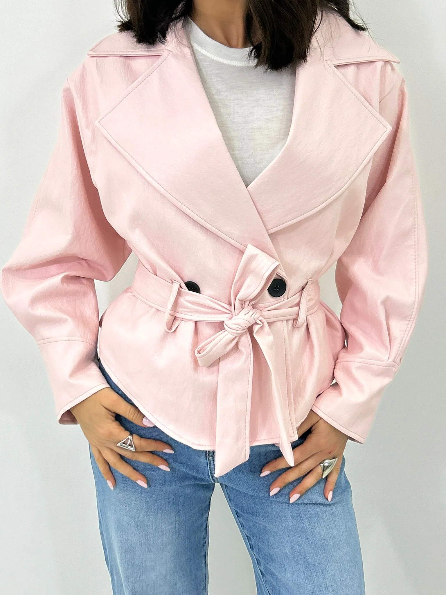 Giacca ecopelle con cintura ,tasche e bottoni , interno foderata