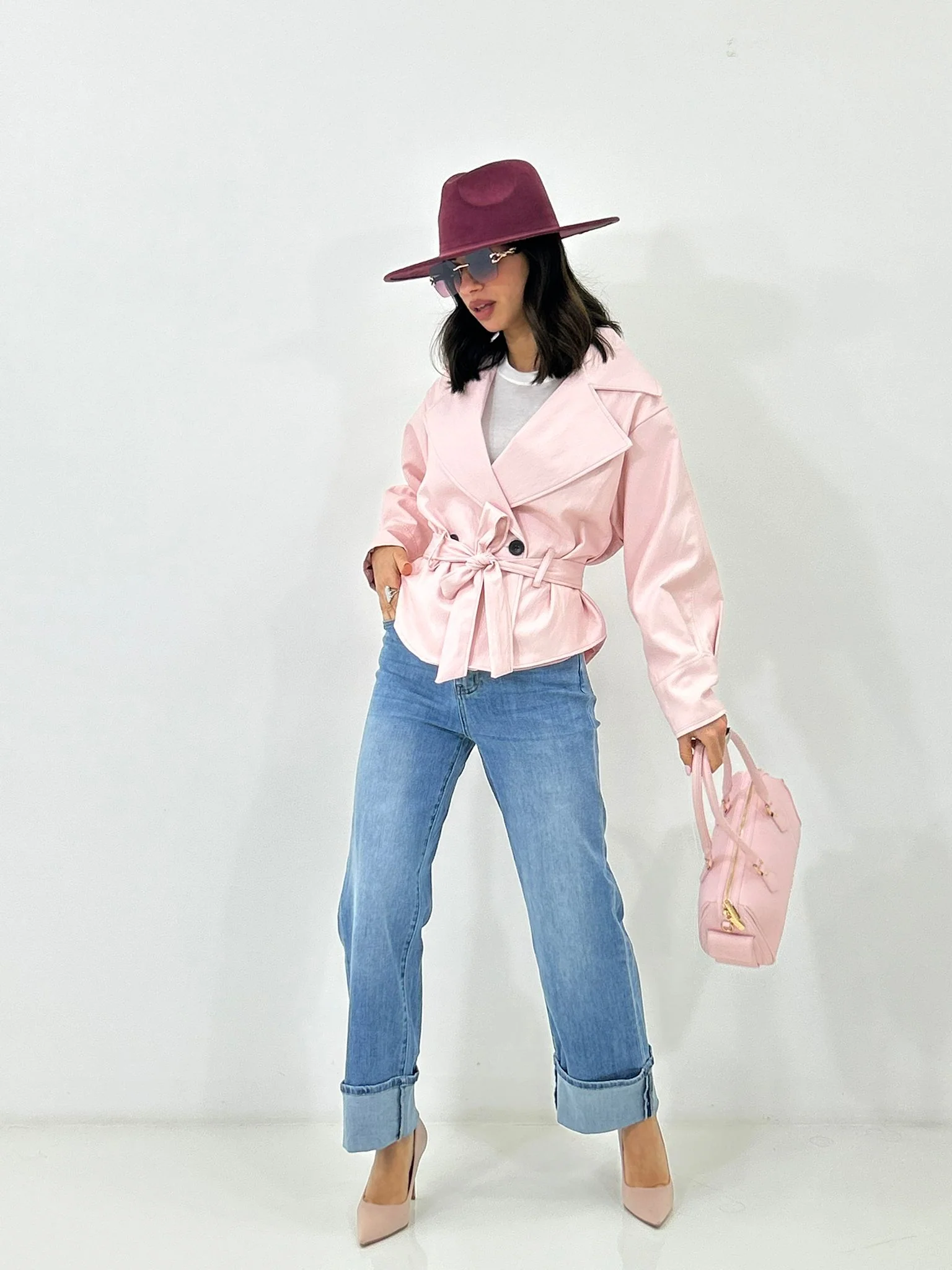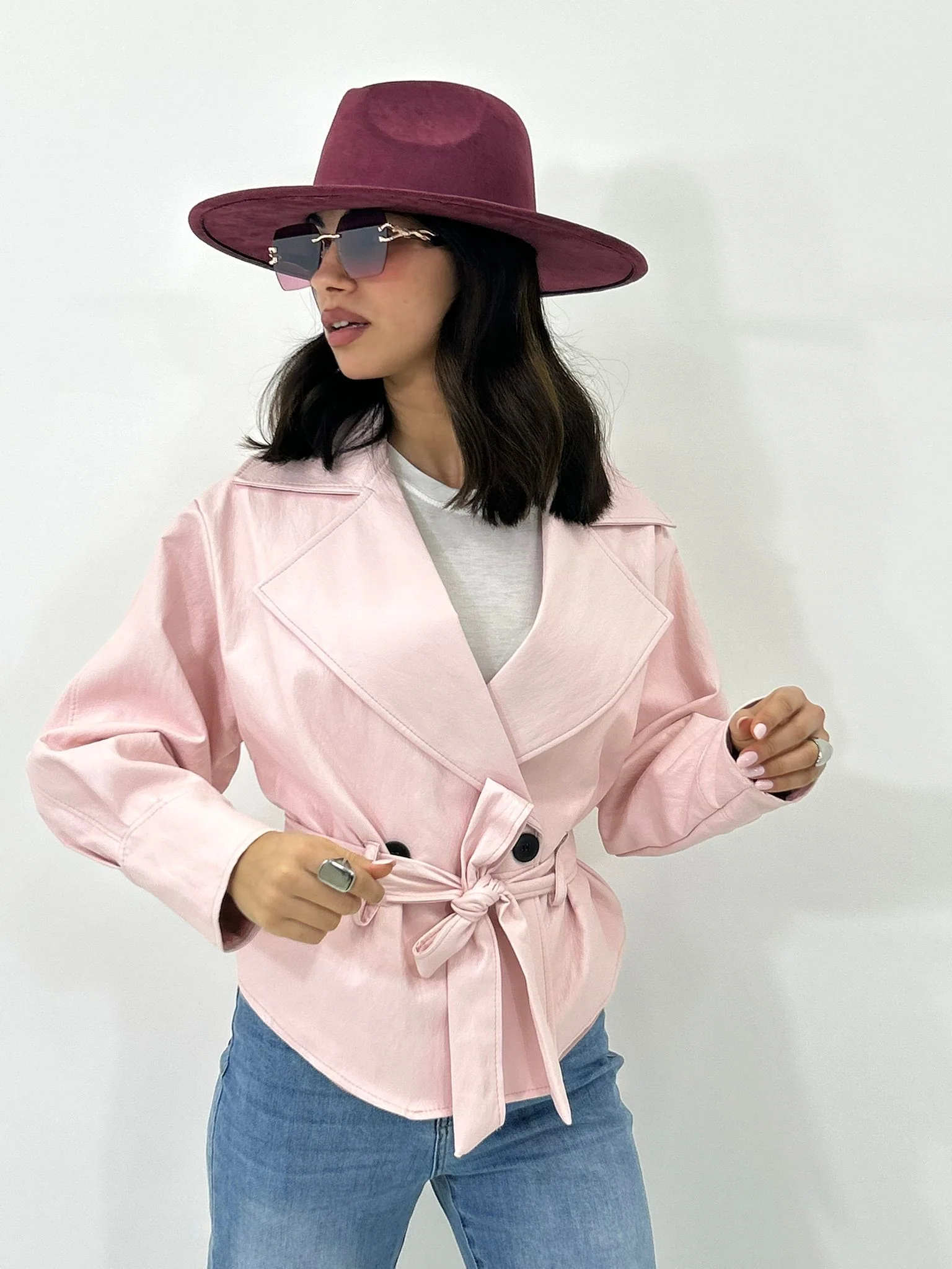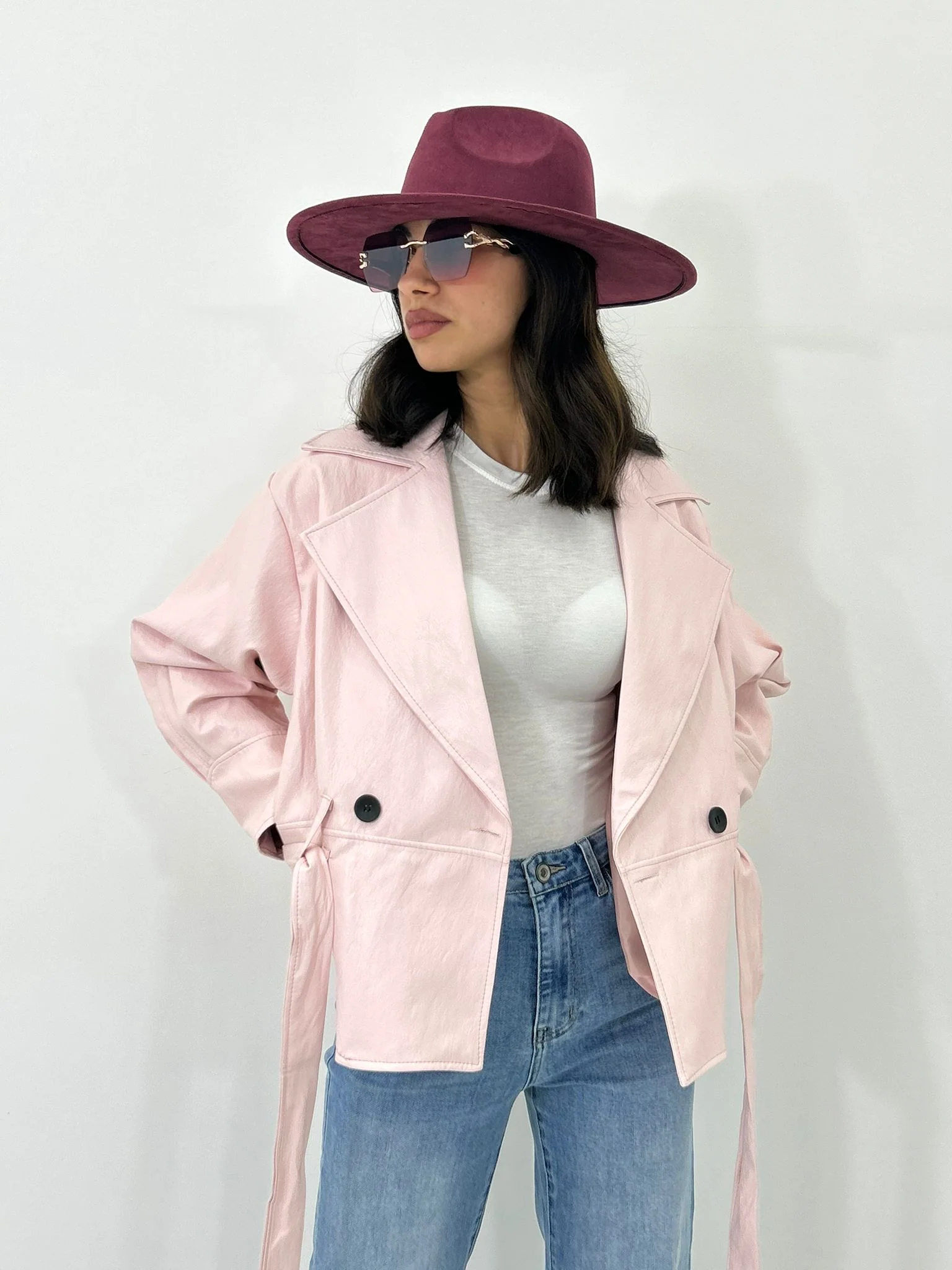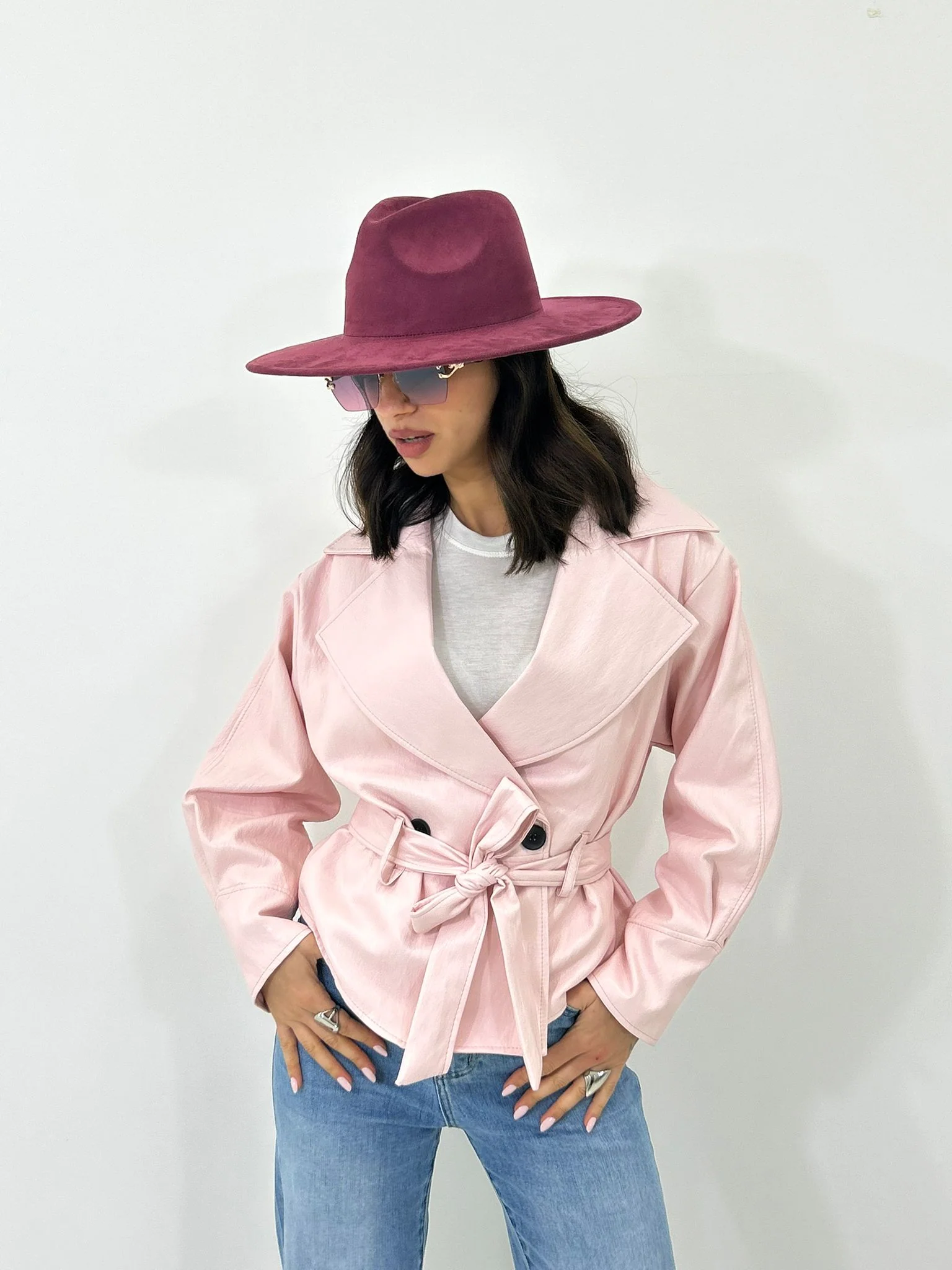 Giacca ecopelle con cintura ,tasche e bottoni , interno foderata