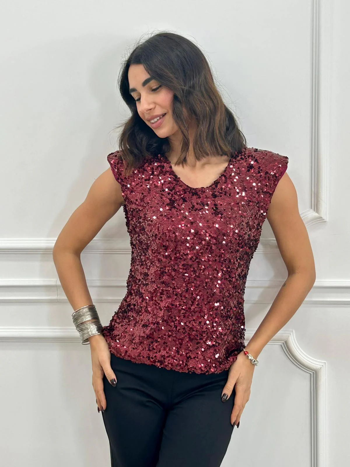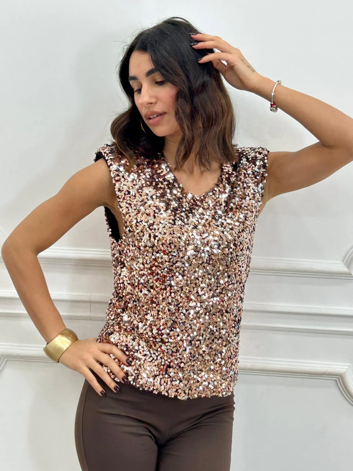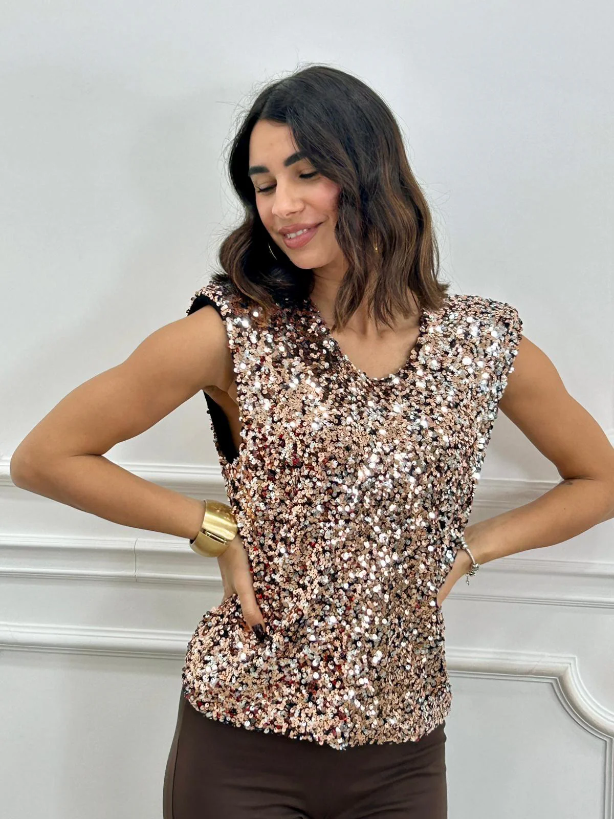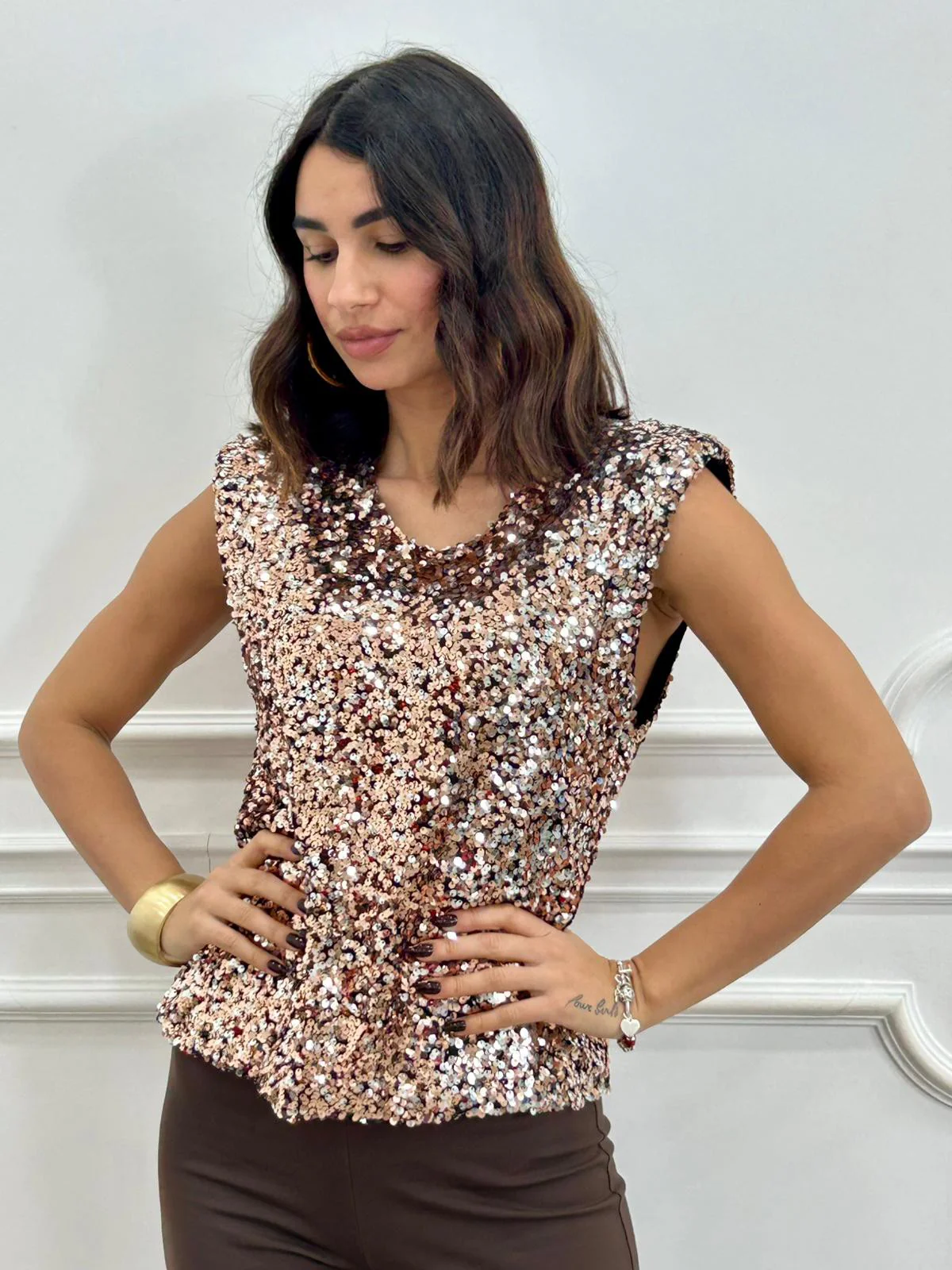 Maglia smanicata con paillettes e spalline