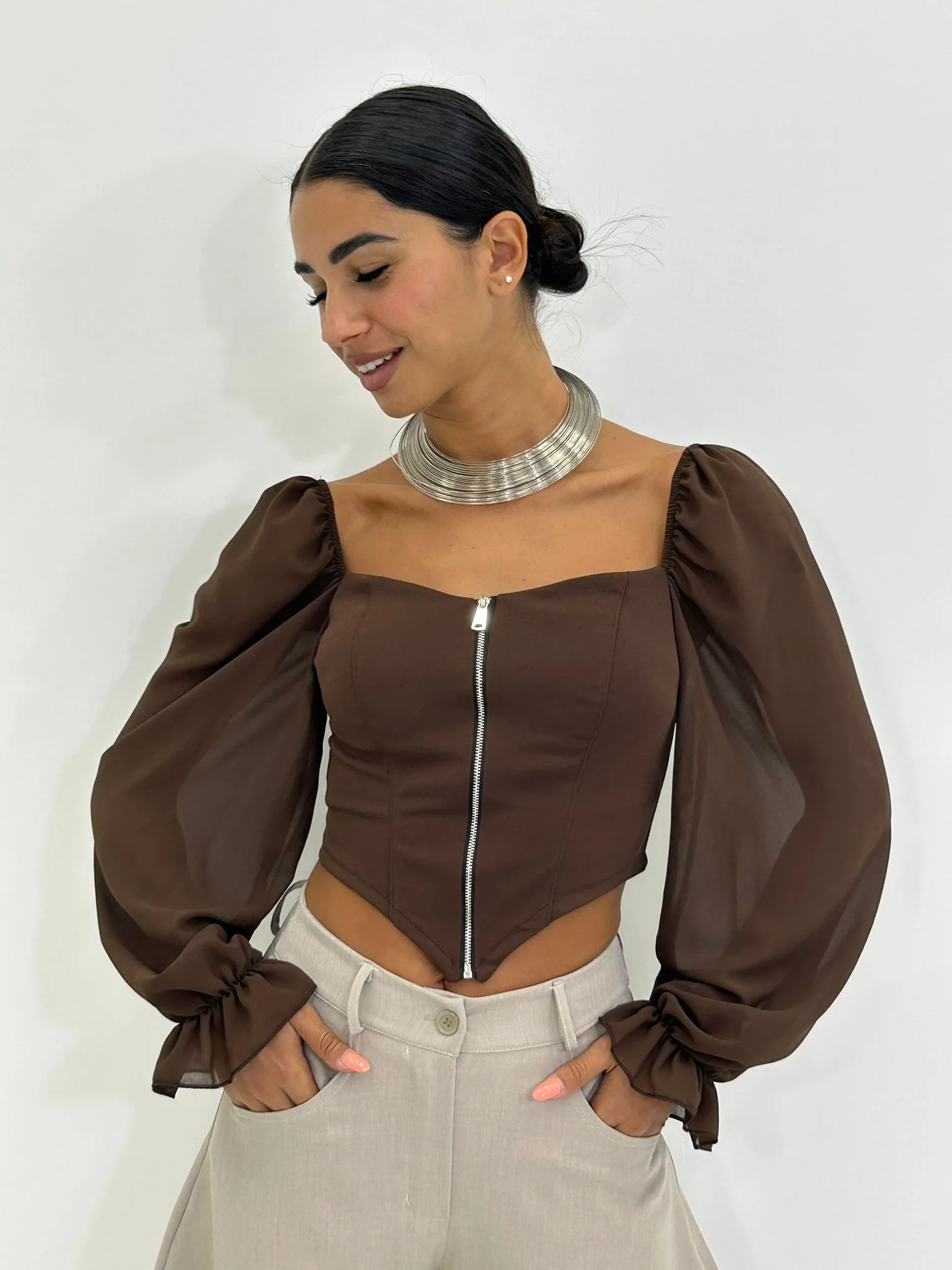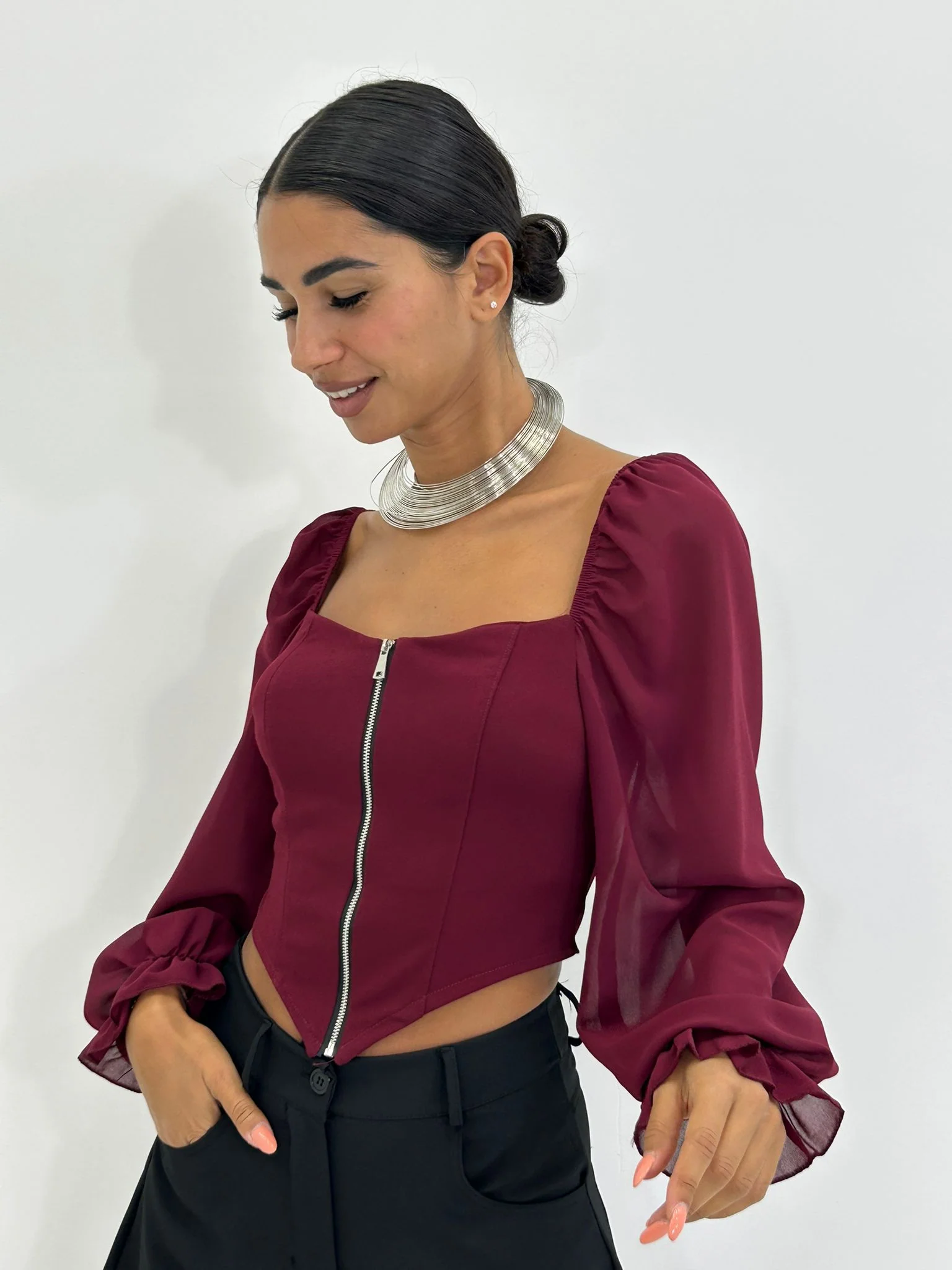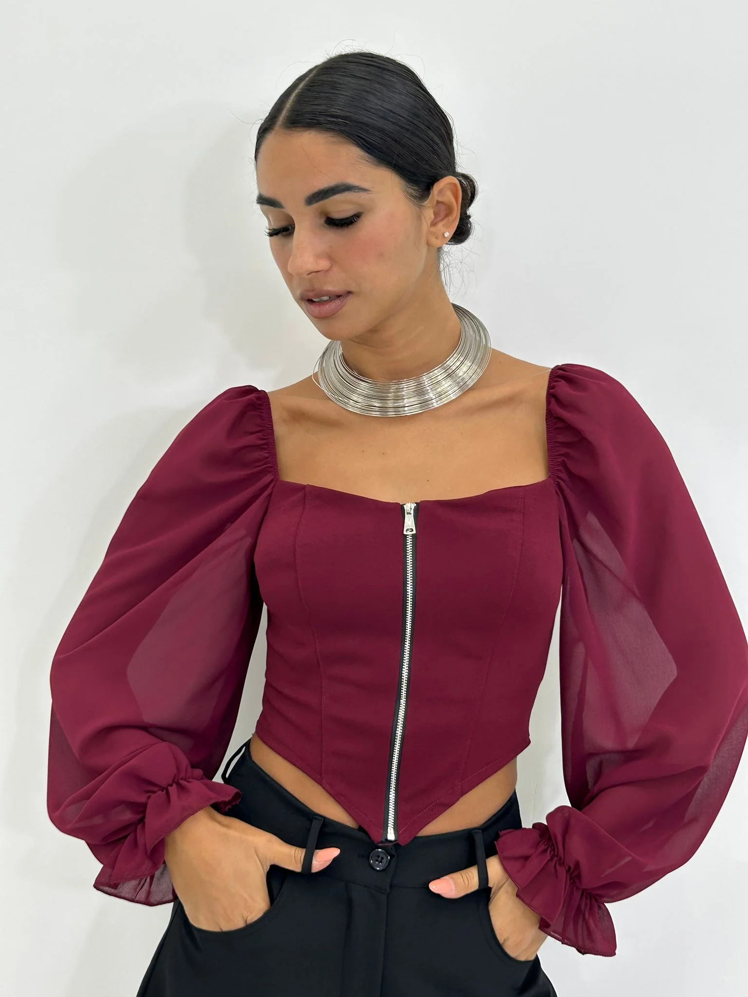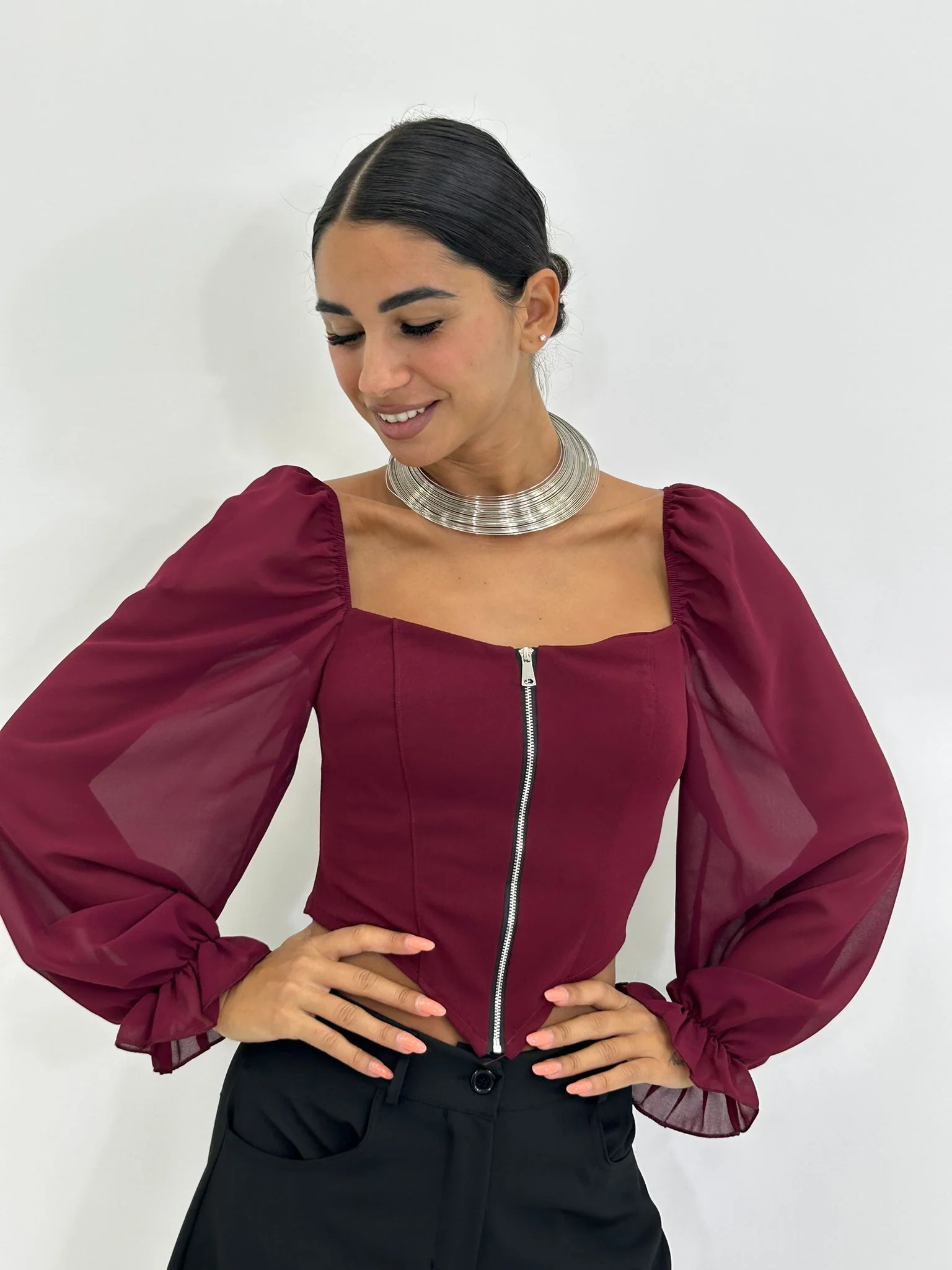 Maglia crop con zip e maniche velate
