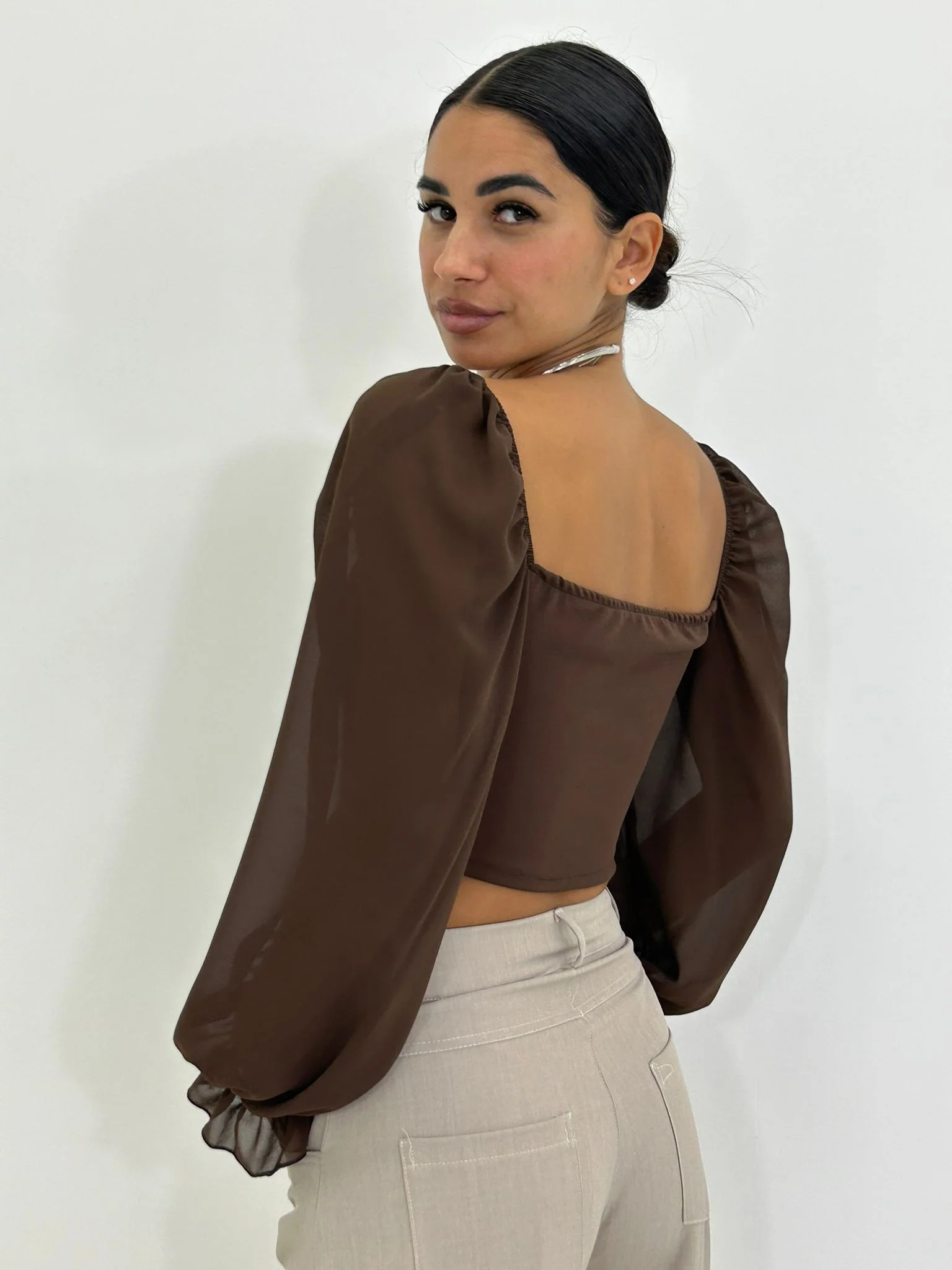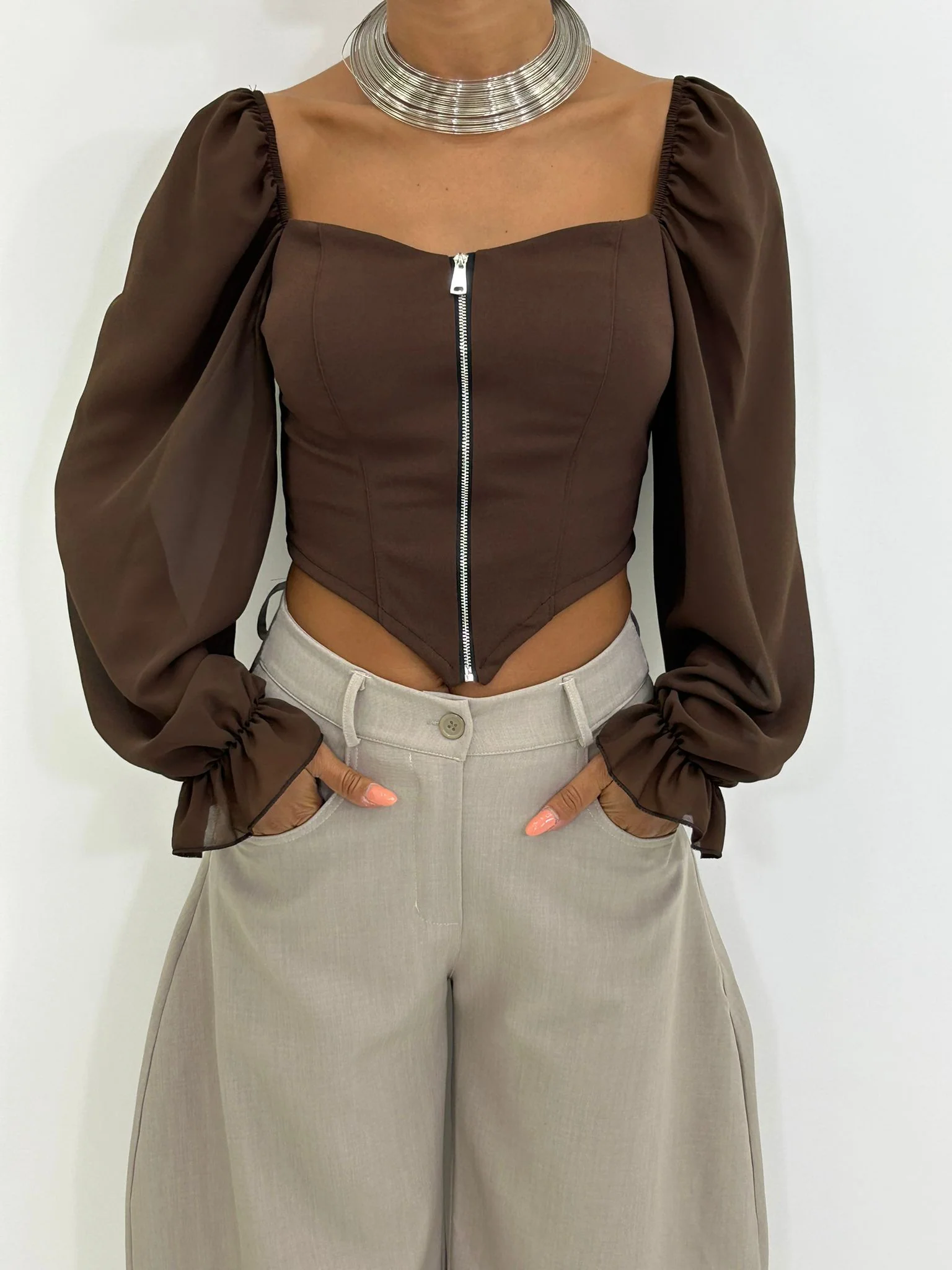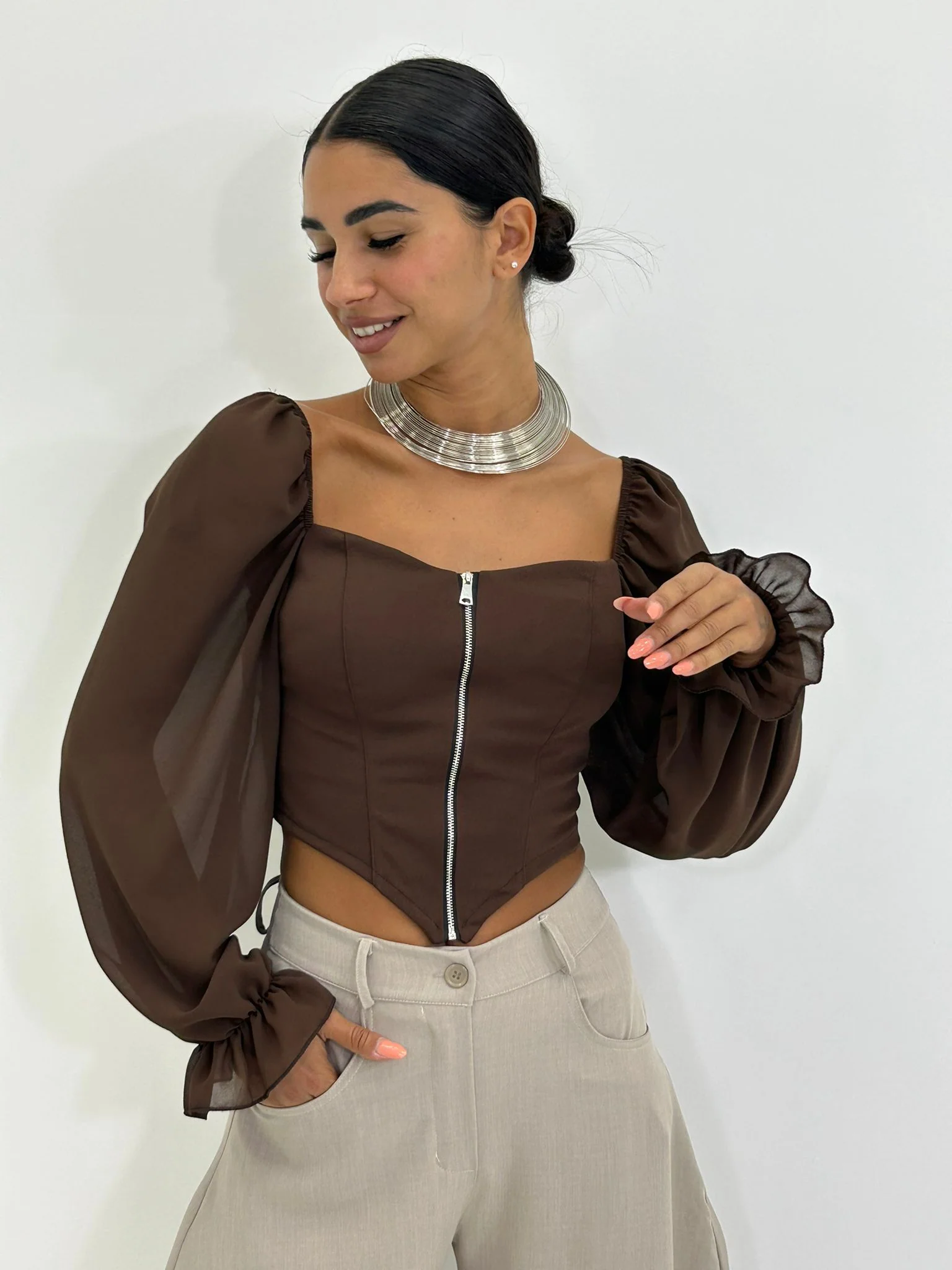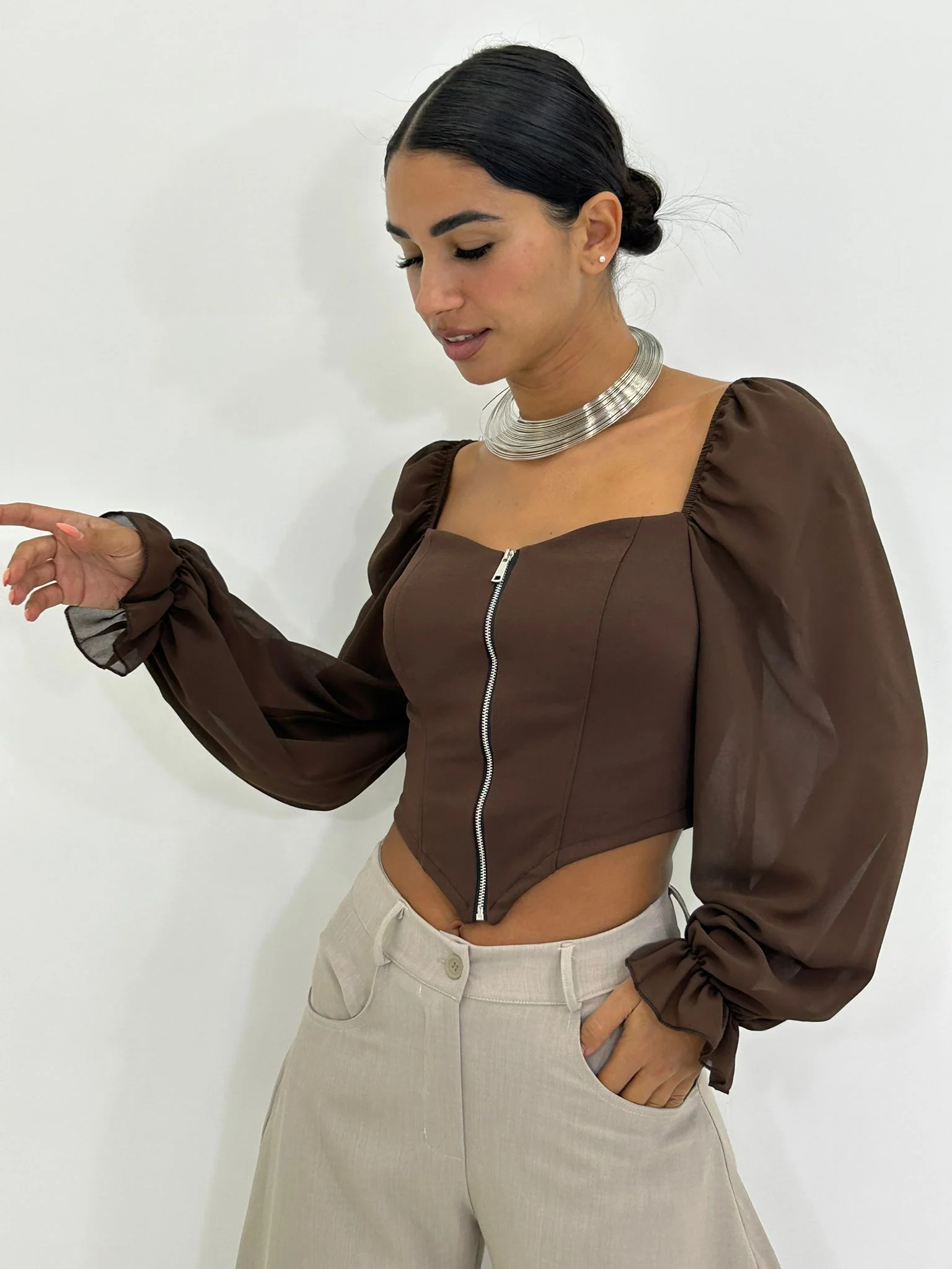 Maglia crop con zip e maniche velate