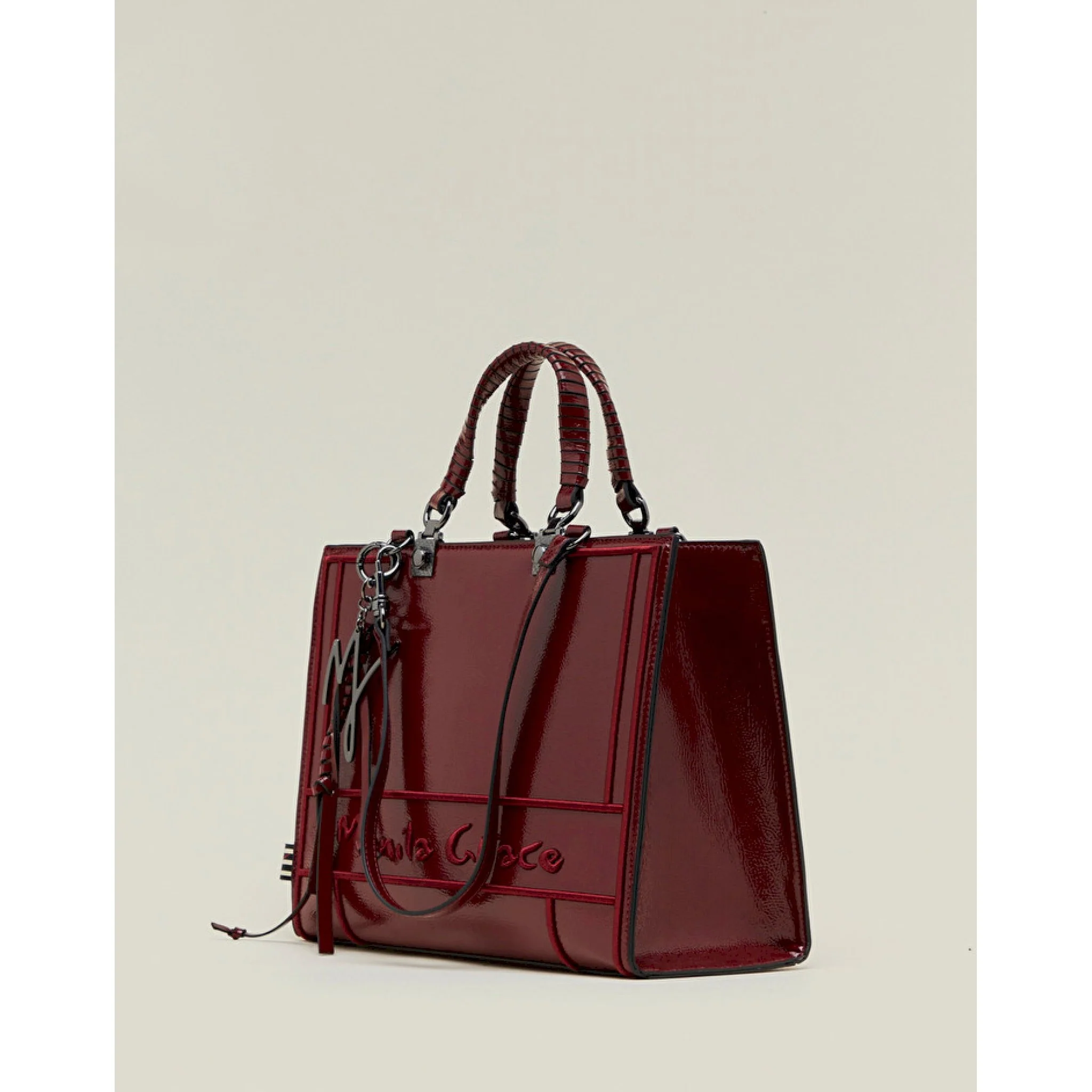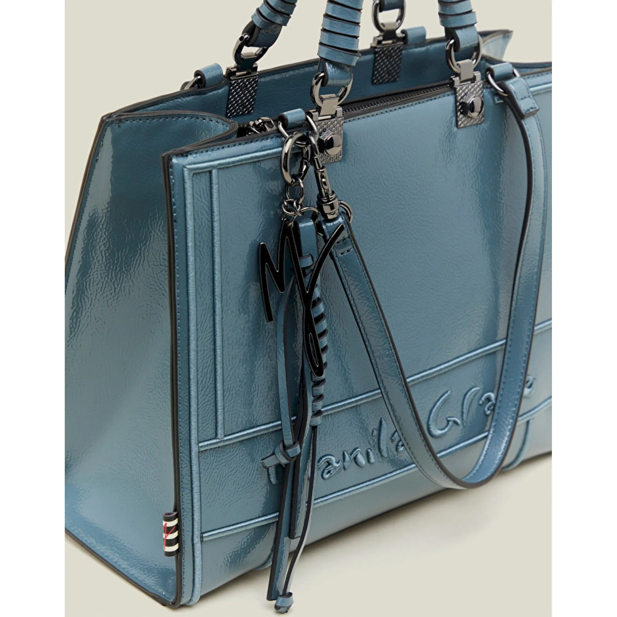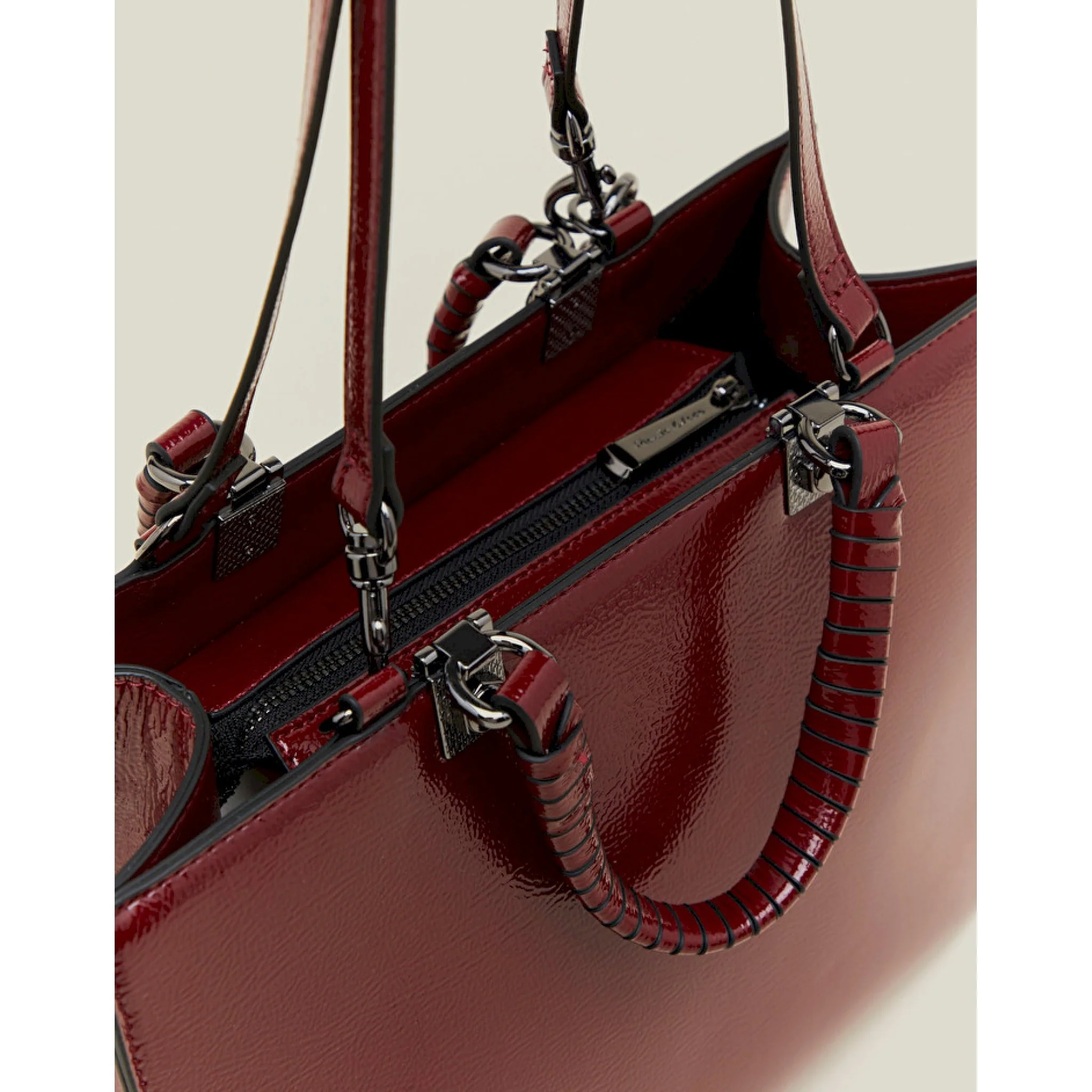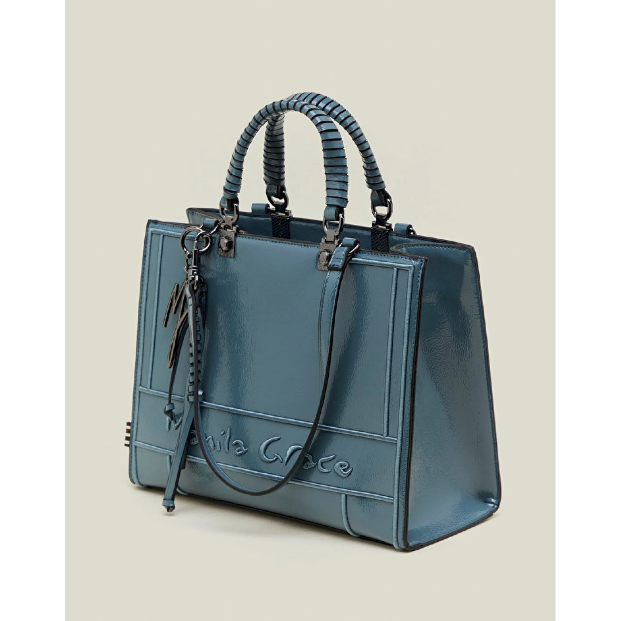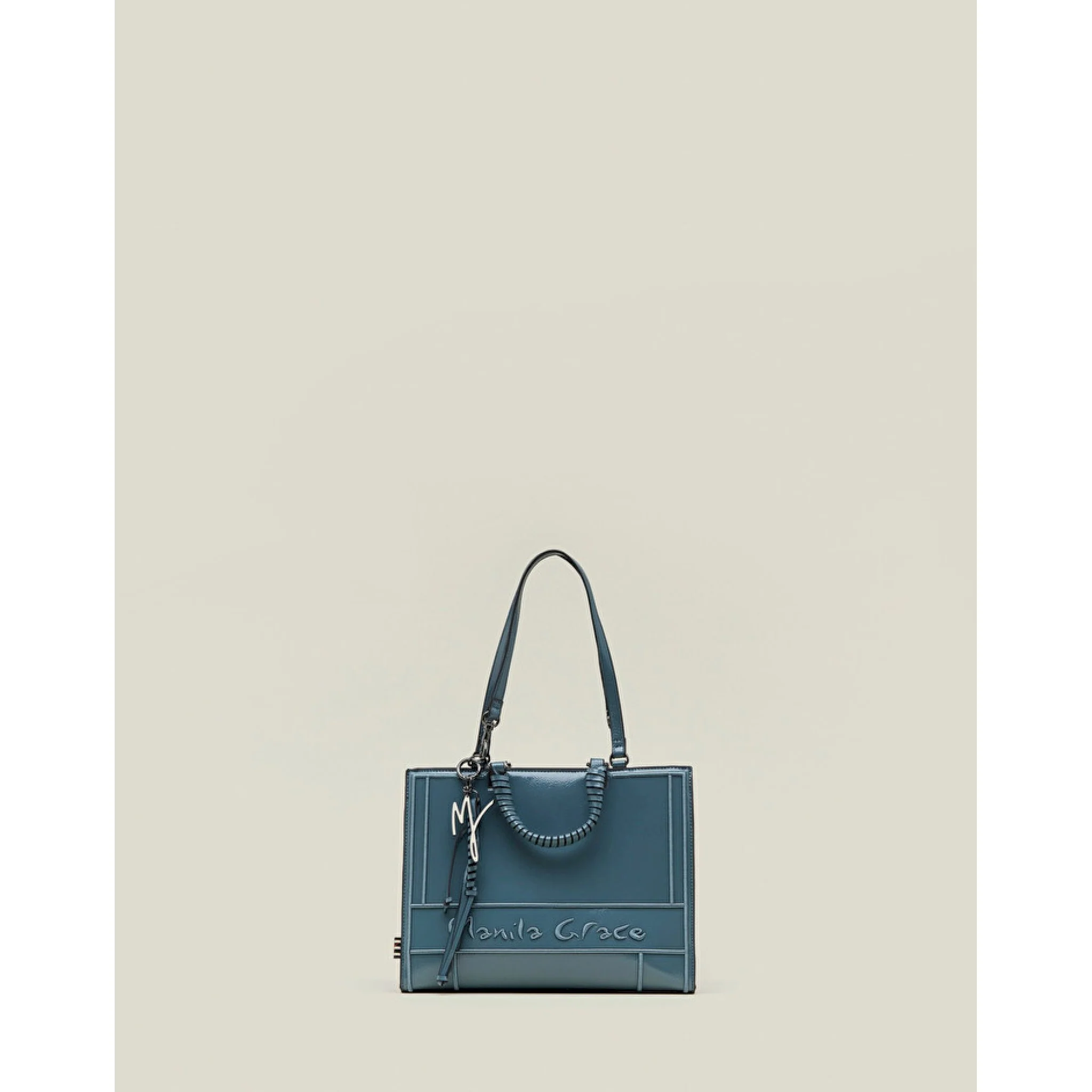 La piccola della linea minerva ti conquisterà per praticità ed eleganza. confezionata in similpelle effetto vernice, si distingue grazie al logo inciso nella texture. dotata di charm logato in metallo con intreccio, si chiude grazie ad una robusta zip. può essere portata sia a mano sia a spalla grazie ai manici staccabili abbinati. questa shopper sarà l’alleata elegante e discreta dei tuoi look quotidiani. la borsa è larga 32 cm, alta 25 cm e profonda 14 cm.