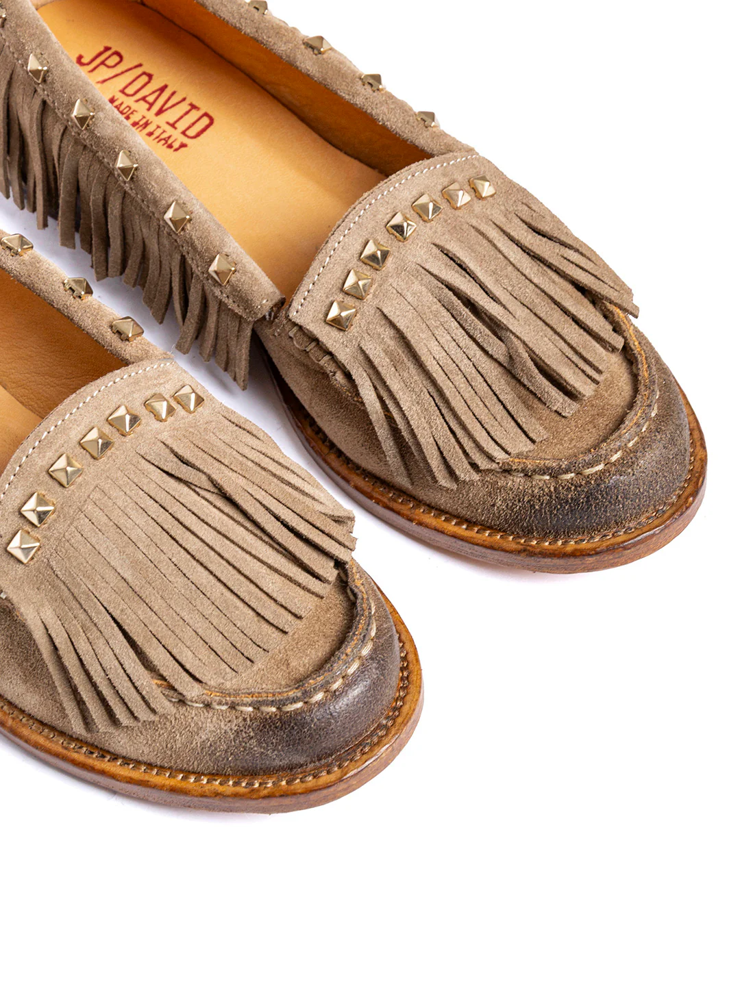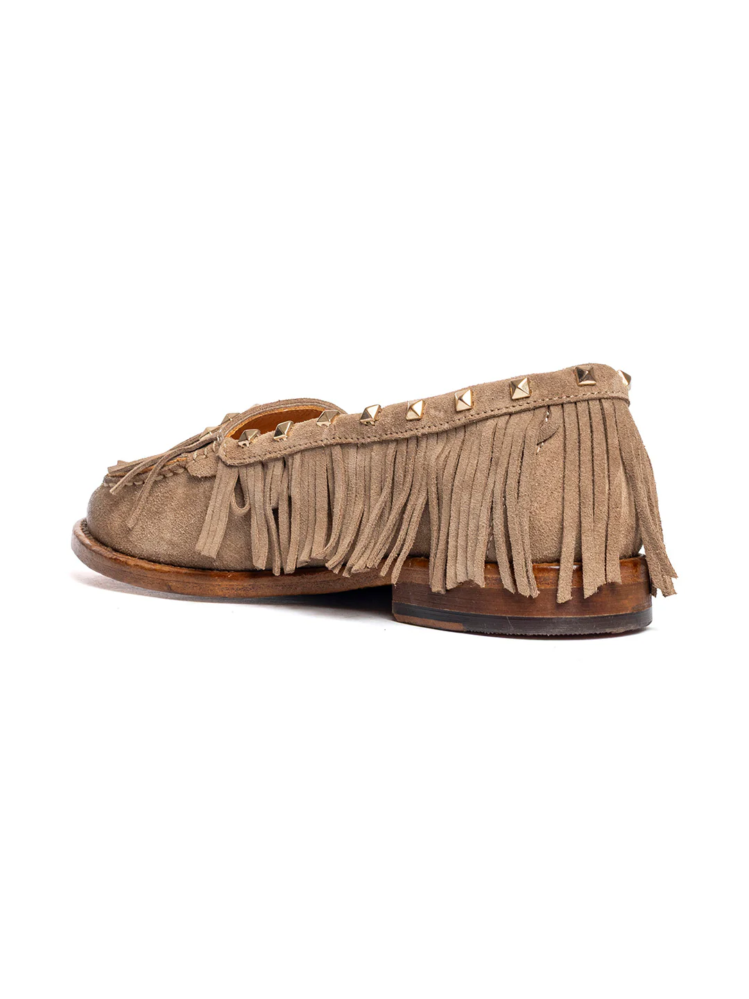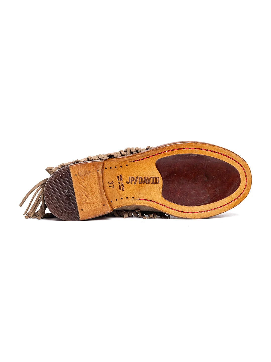 Tipo di lavorazione: pellame borchiato e spazzolato a mano. La suola viene fissata alla tomaia tramite la cucitura «Blake»