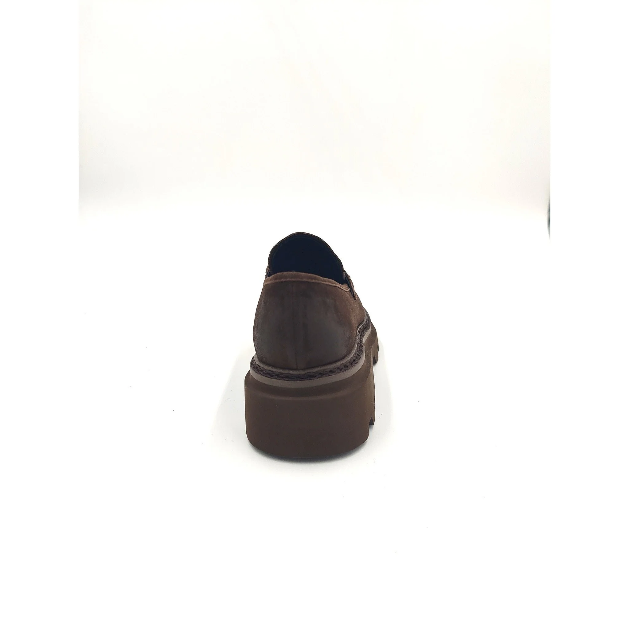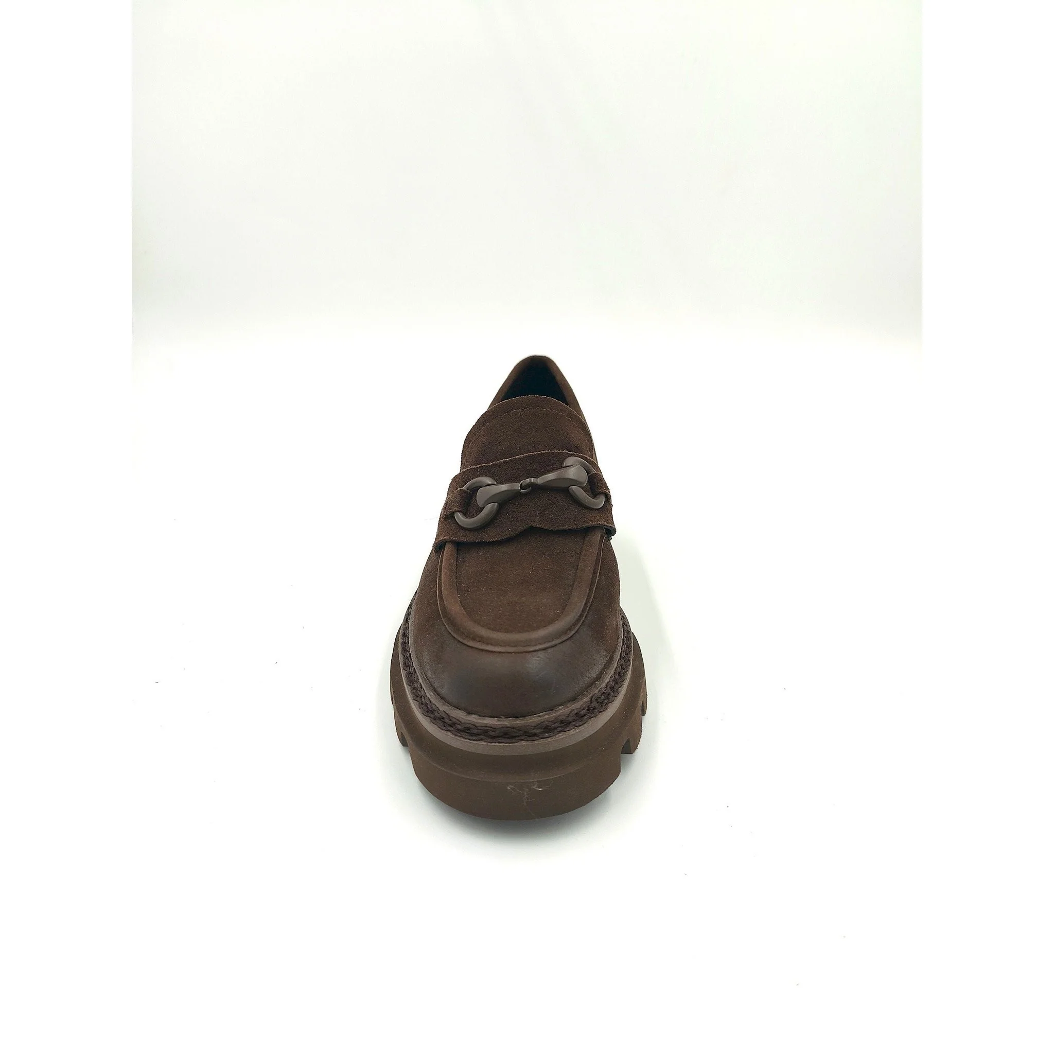 Mocassino in suede marrone con risvolto, accessorio a morsetto in tinta e fondo 3 cm