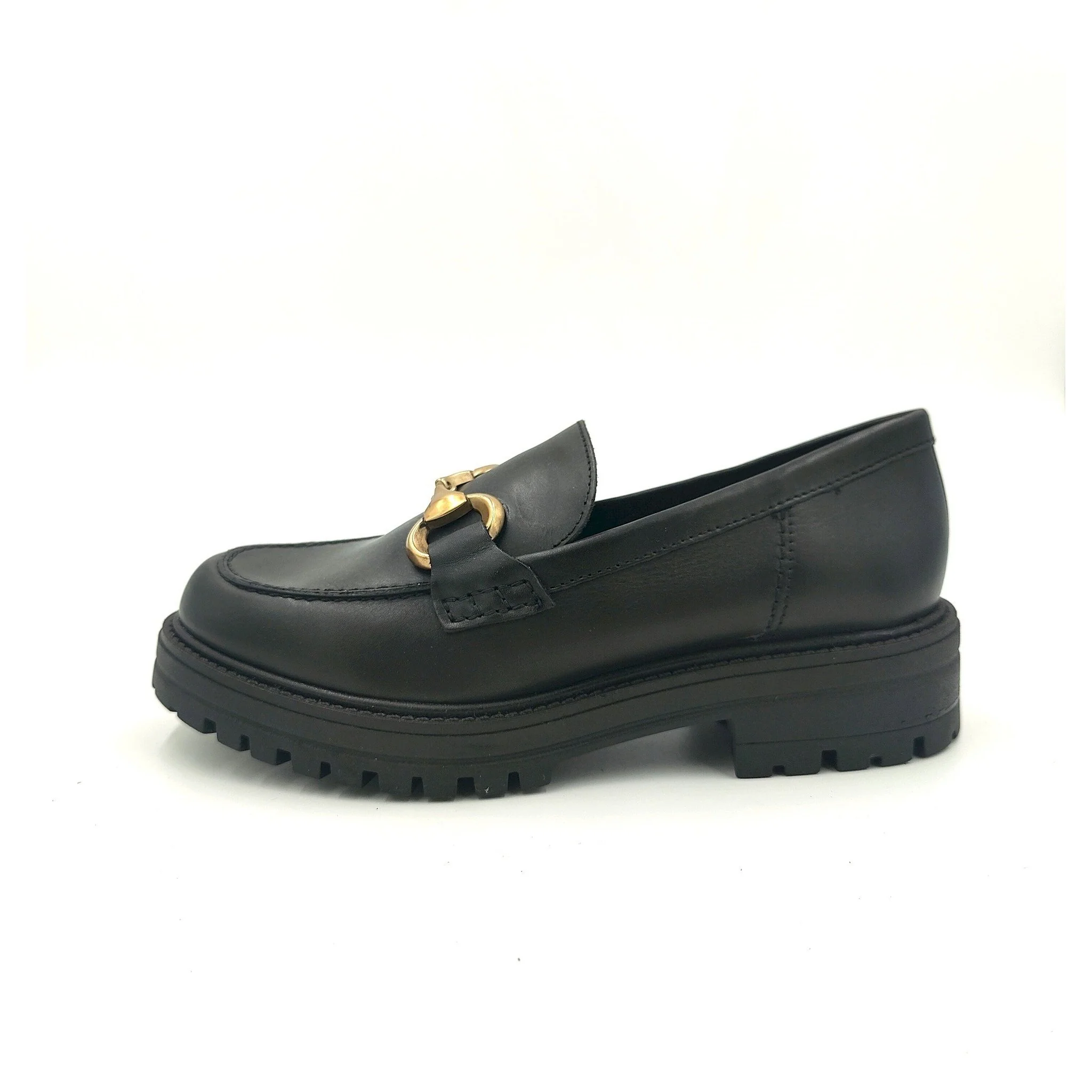 Mocassino in pelle nera con accessorio a catena piatta color oro, risvolto e cuciture