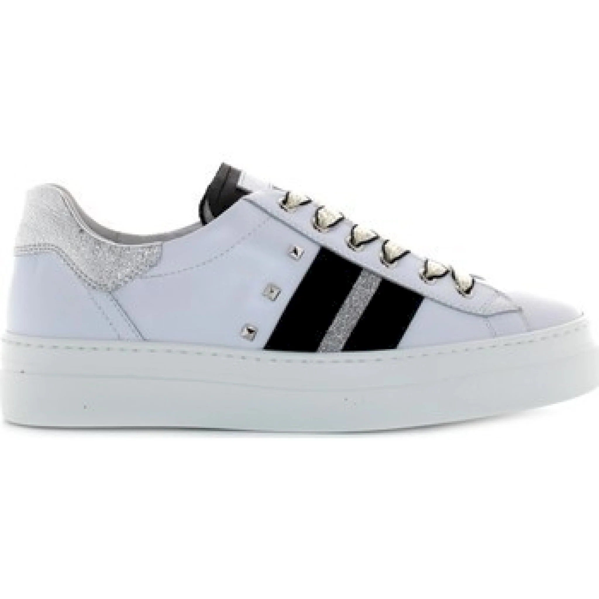 Sneakers bassa da donna di nero giardini. tomaia realizzata in pelle bianca con fascia in tessuto elastico nero e argento e borchie applicate. interno foderato in pelle con sottopiede estraibile. chiusura con lacci. suola in gomma con fondo a cassetta.